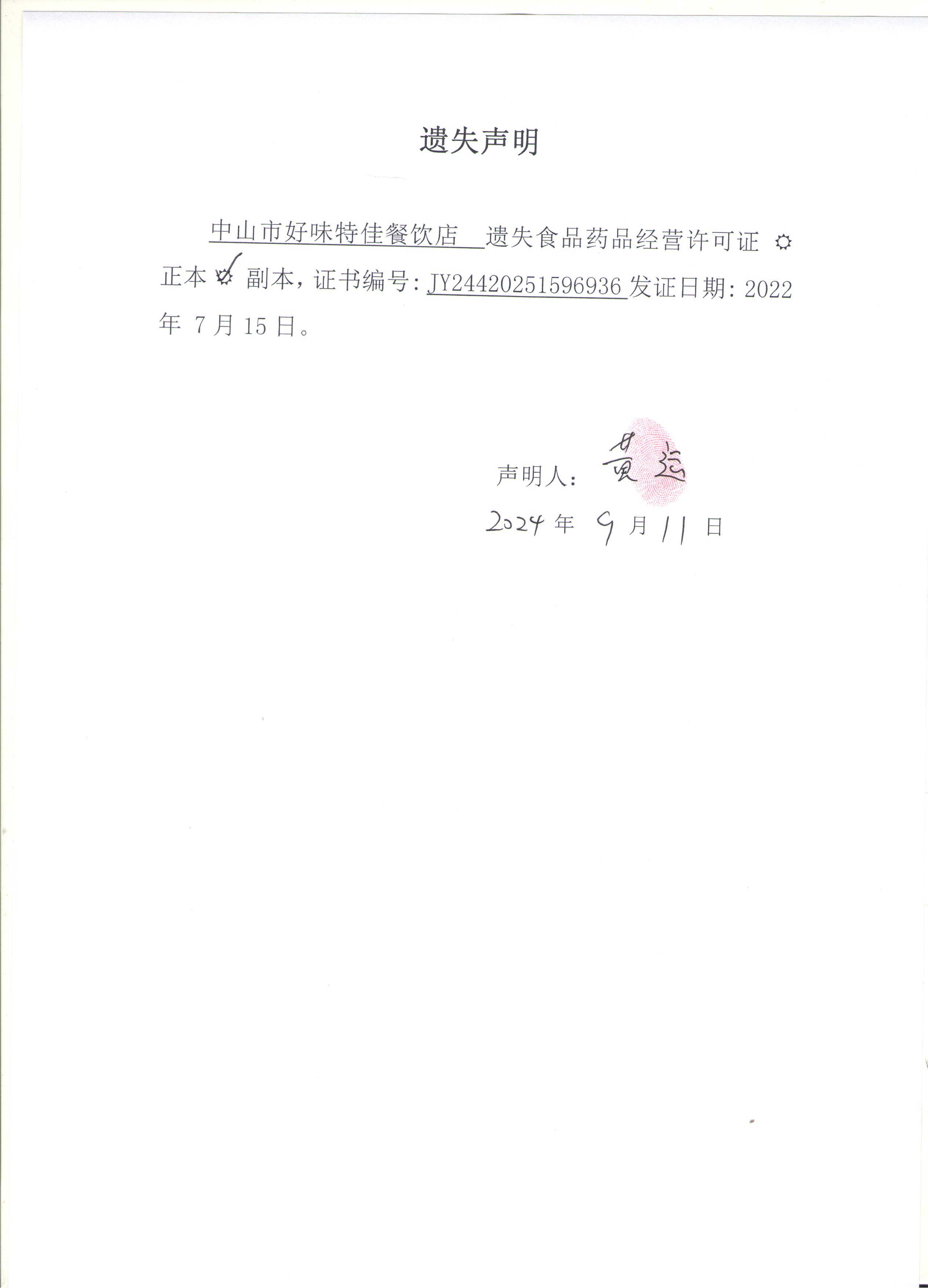 食品药品经营许可证遗失声明(中山市好味特佳餐饮店)