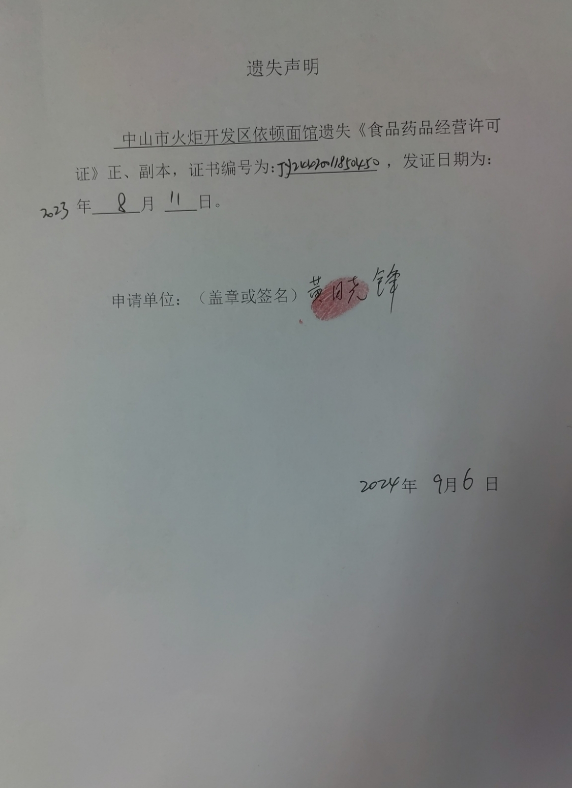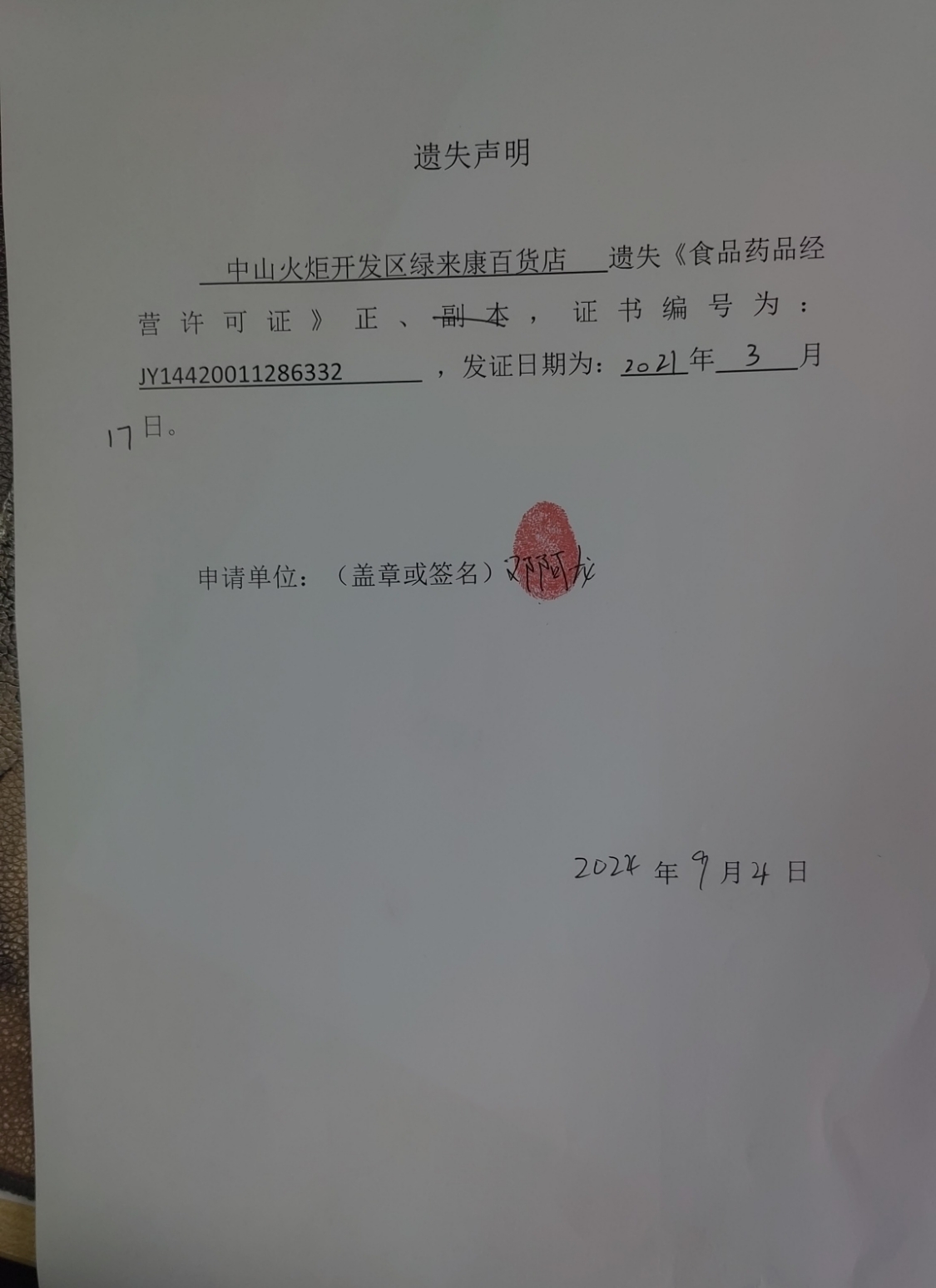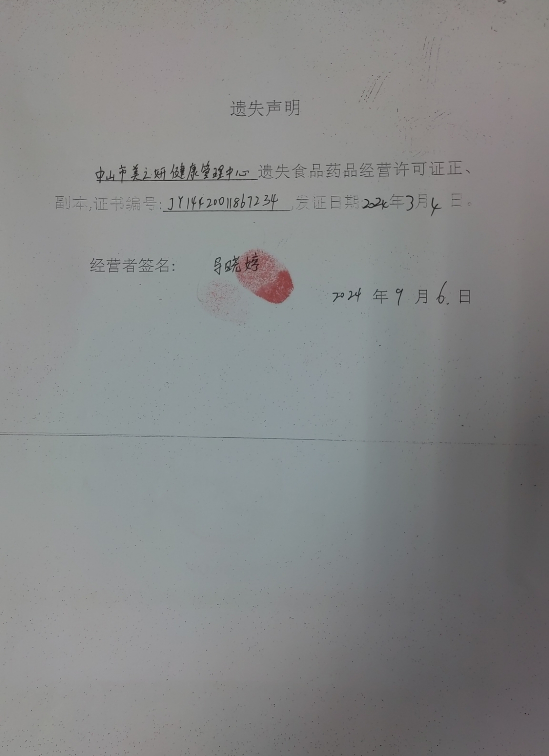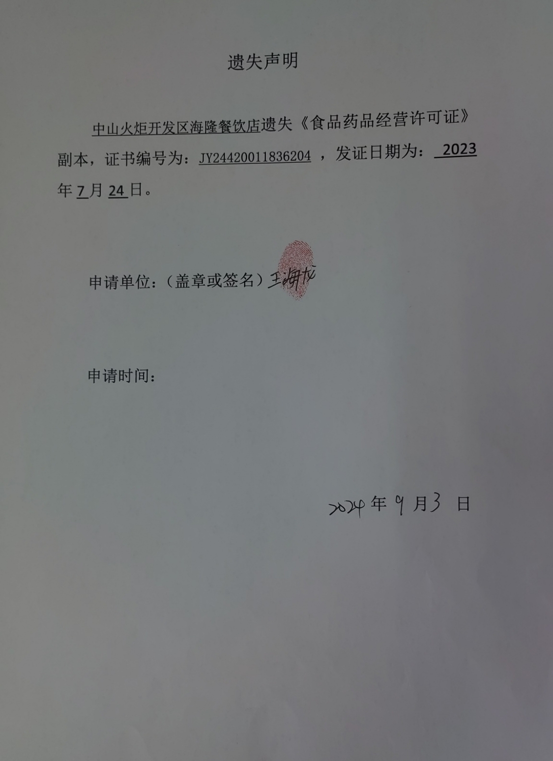 食品药品经营许可证遗失声明(中山火炬开发区海隆餐饮店、中山市美之妍健康管理中心、中山火炬开发区绿来康百货店、中山市火炬开发区依顿面馆)