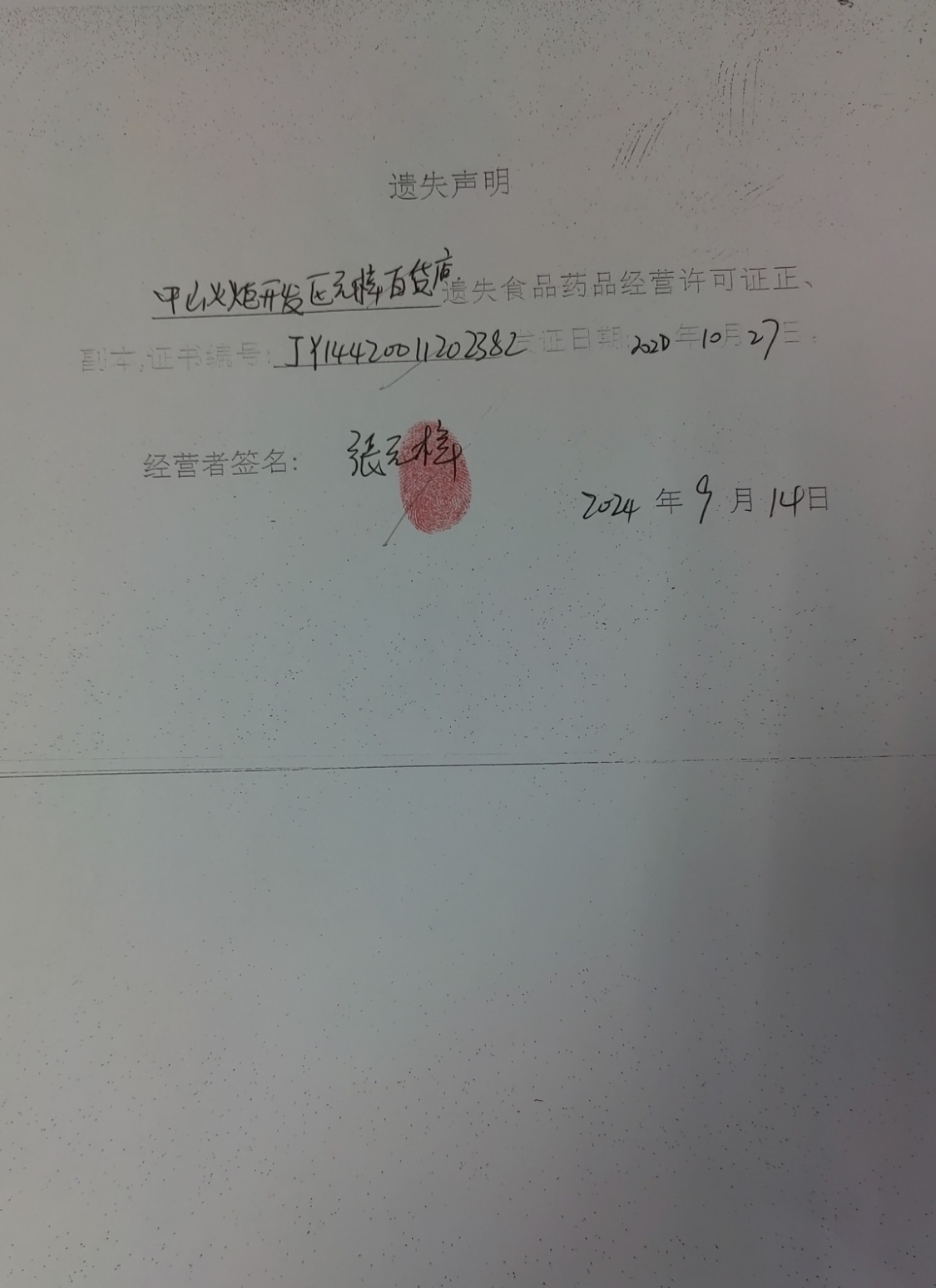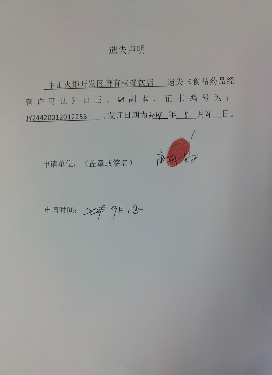 食品药品经营许可证遗失声明(中山火炬开发区唐有权餐饮店、中山火炬开发区元梓百货店)