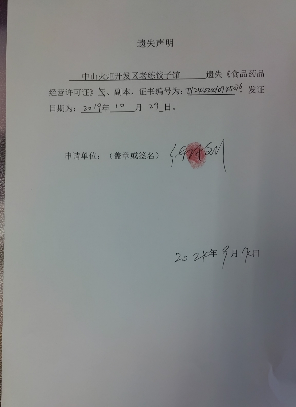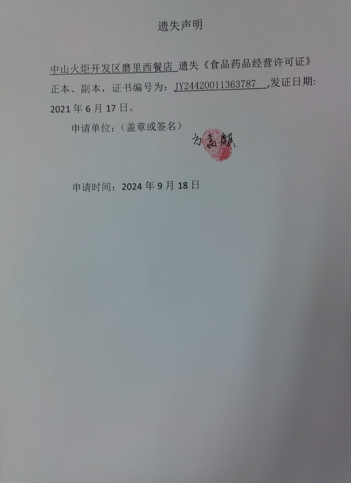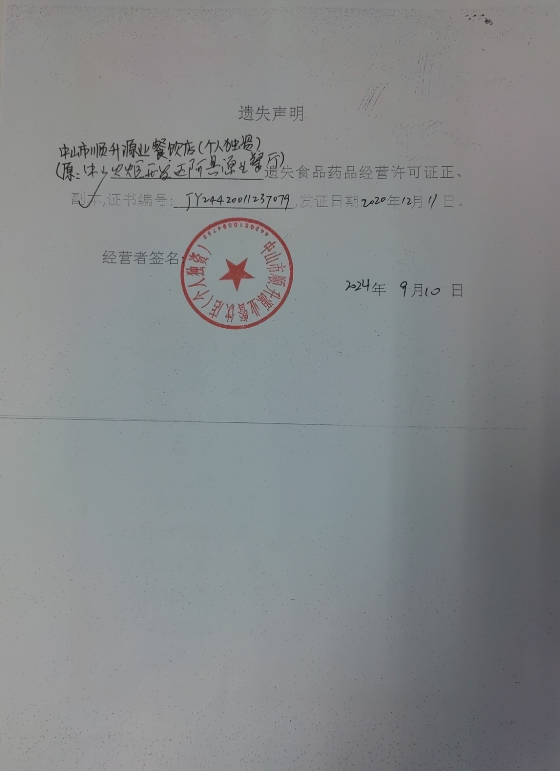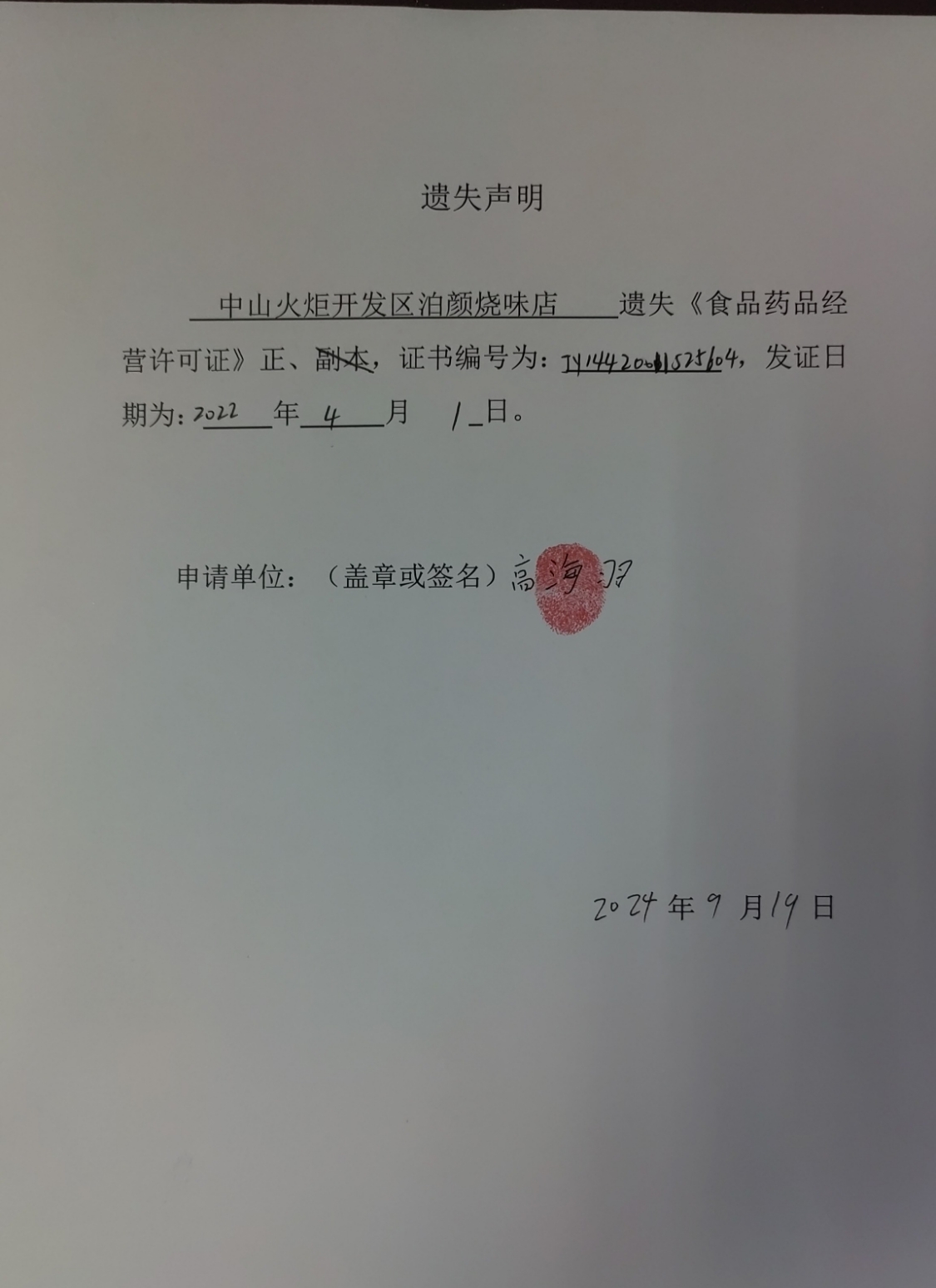 食品药品经营许可证遗失声明(中山火炬开发区阿具源业餐厅、中山火炬开发区泊颜烧味店、中山火炬开发区老练饺子馆、中山火炬开发区磨里西餐店)