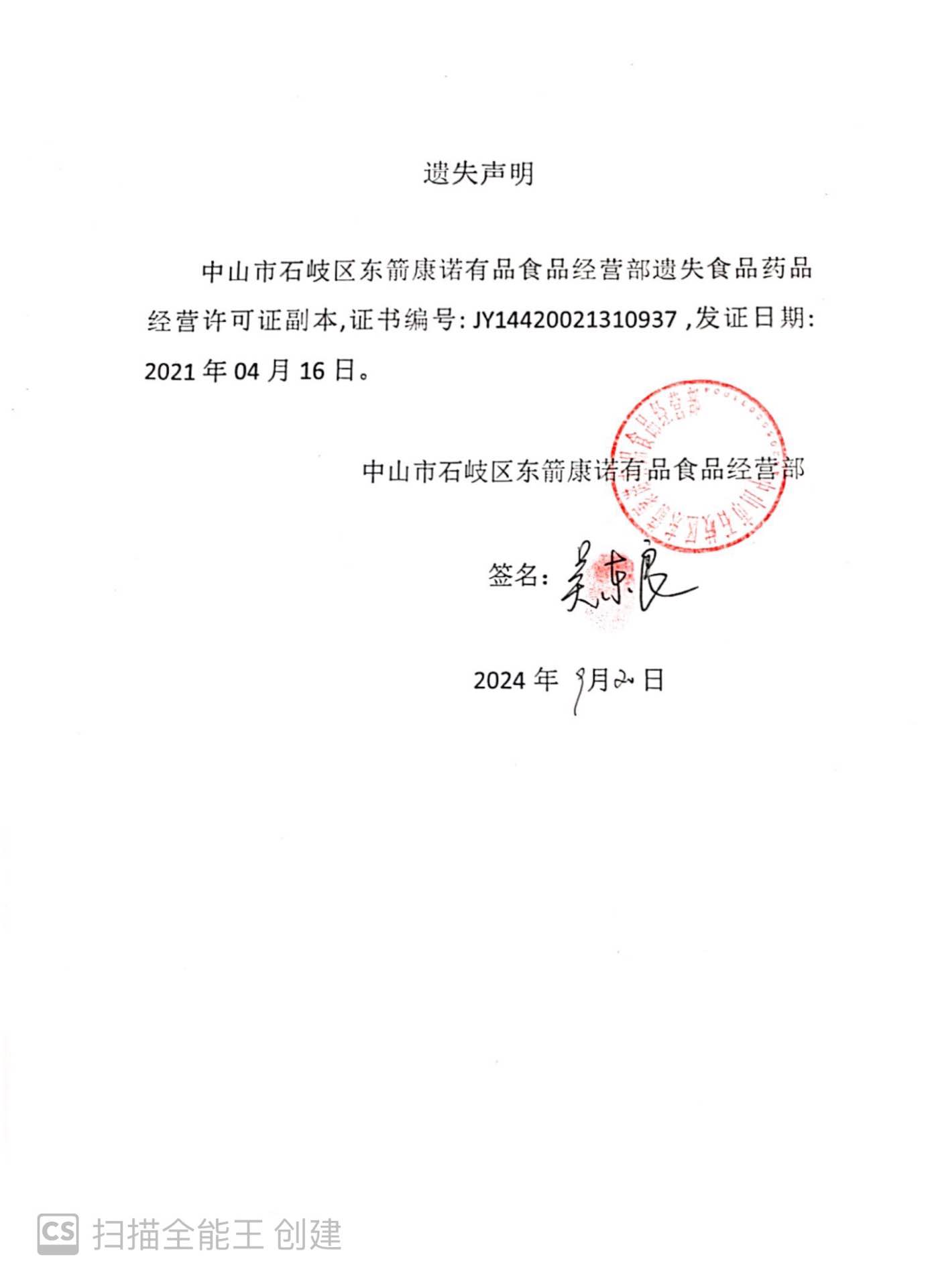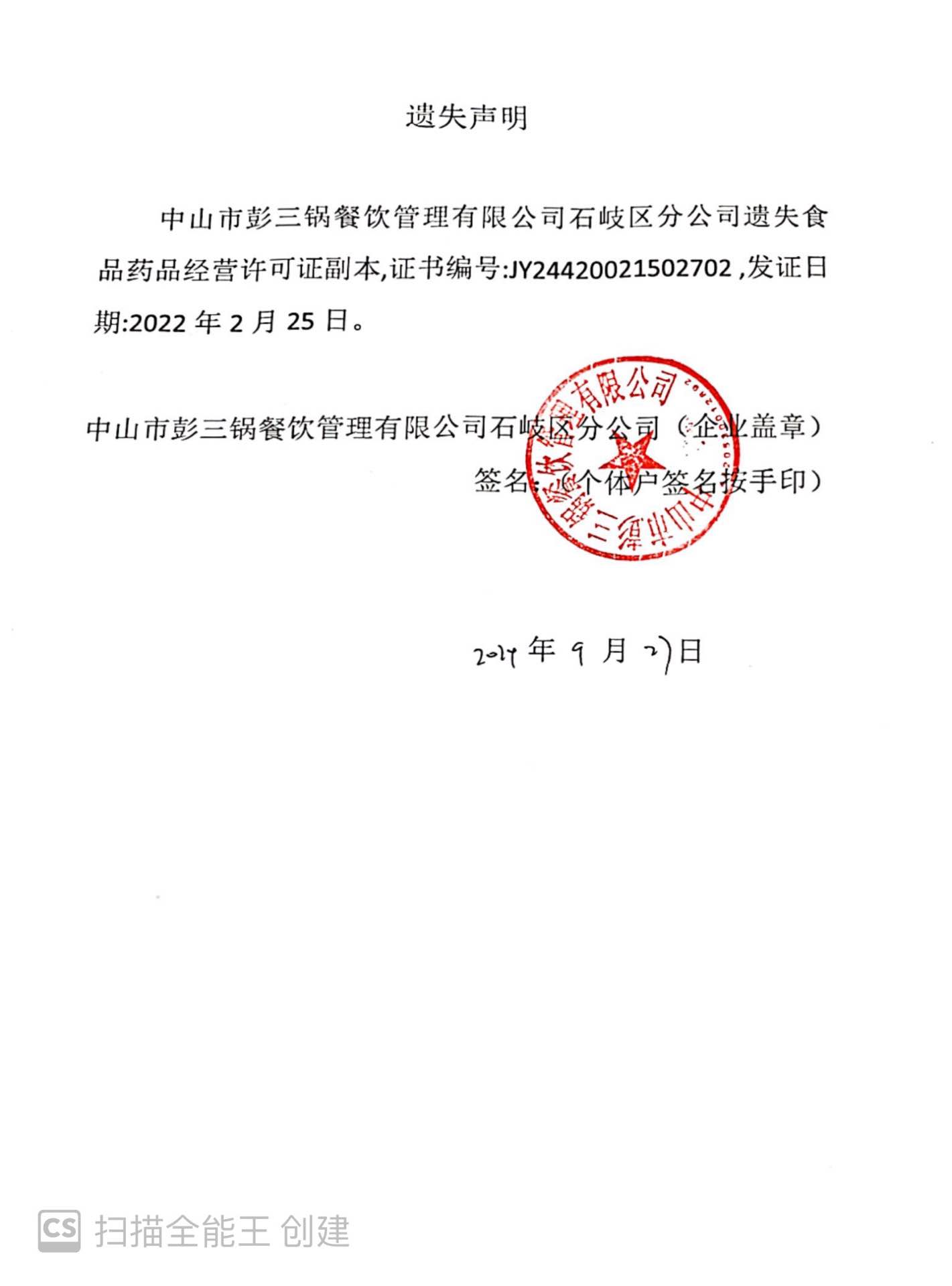 食品药品经营许可证遗失声明【中山市石岐区东箭康诺有品经营部、中山市彭三锅餐饮管理有限公司石岐区分公司、中山市小白醒醒茶饮店(个体工商户)】