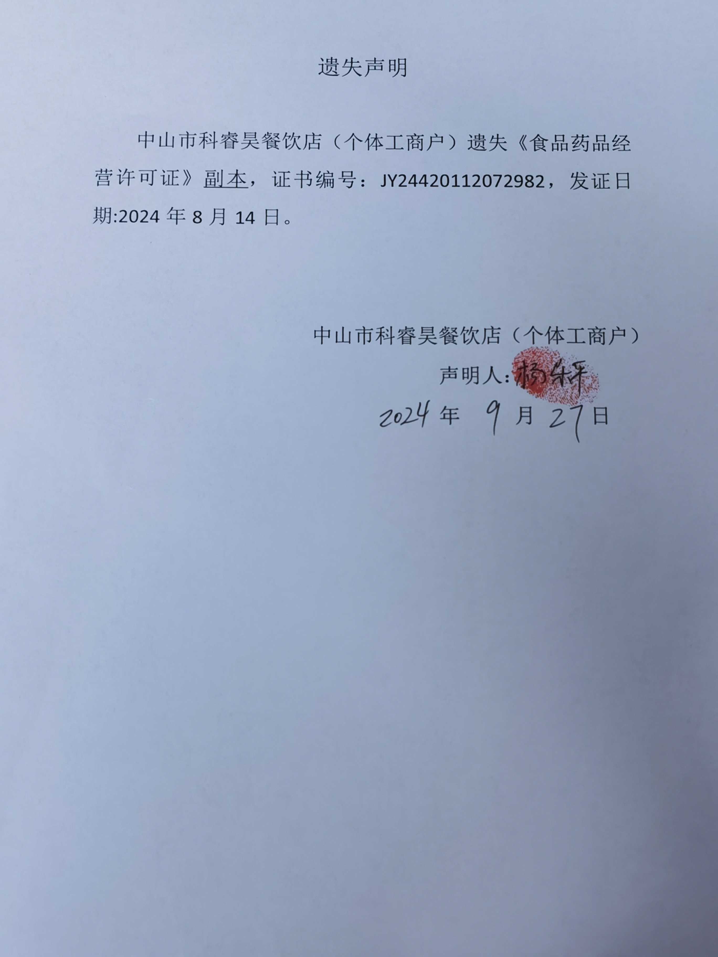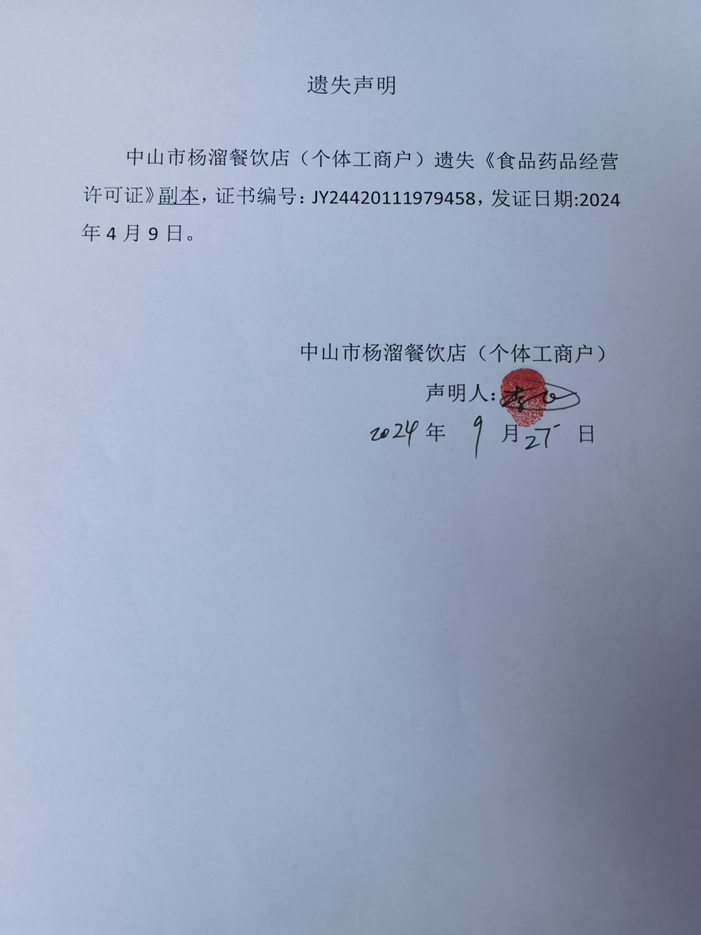 食品药品经营许可证遗失声明【中山市港口镇穗康木桶饭店、中山市杨溜餐饮店(个体工商户)、中山市科睿昊餐饮店(个体工商户)】