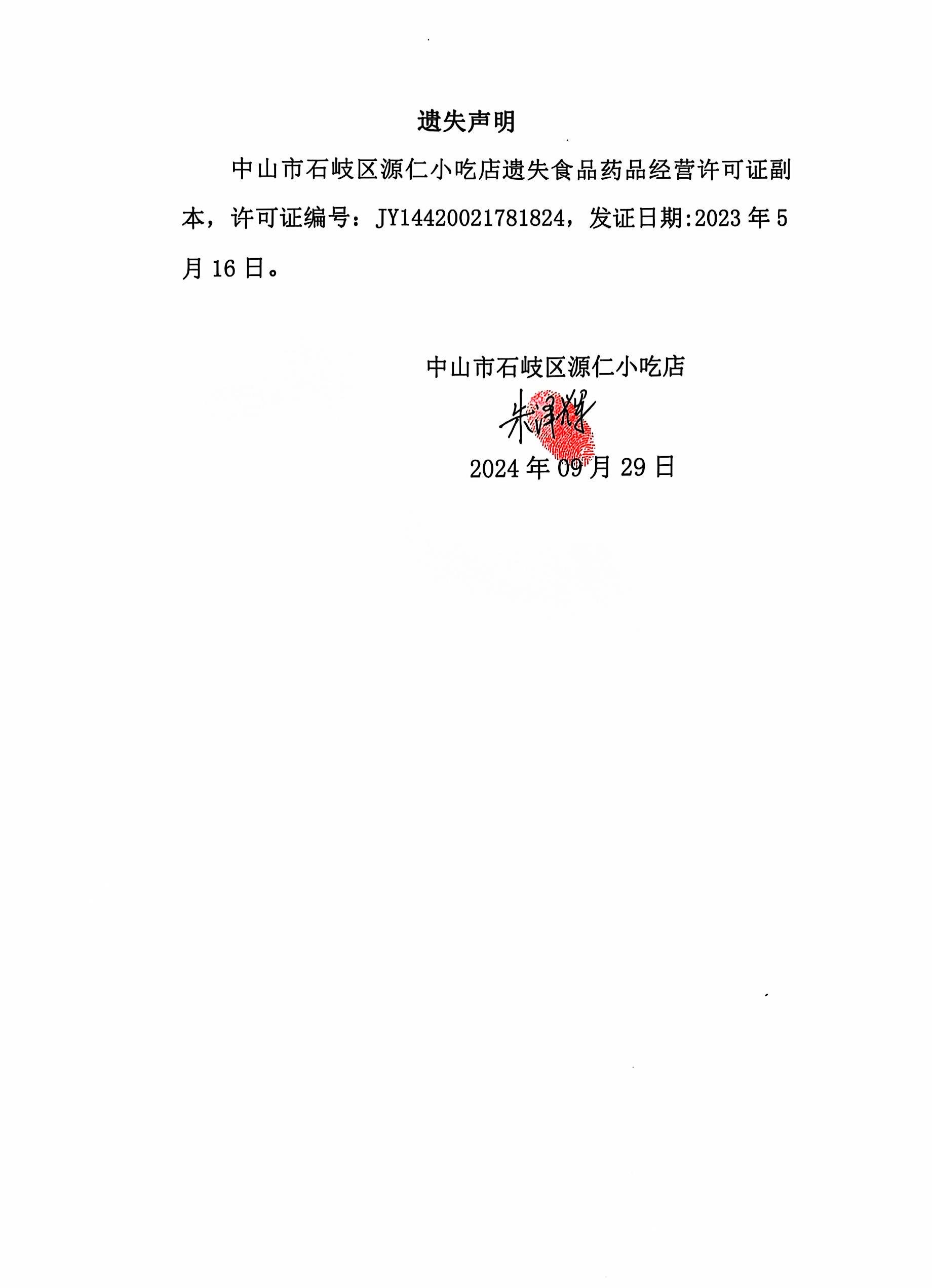 食品药品经营许可证遗失声明(中山市石岐区源仁小吃店)