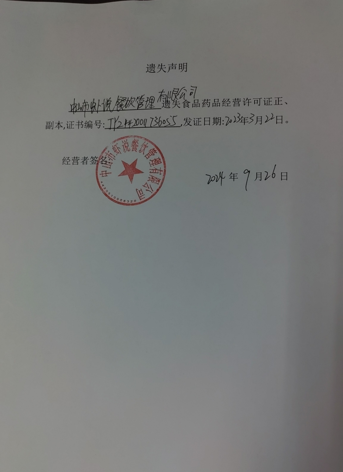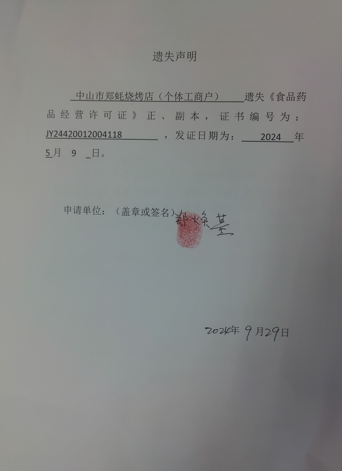 食品药品经营许可证遗失声明【中山市郑蚝烧烤店(个体工商户)、中山市虾说餐饮管理有限公司】