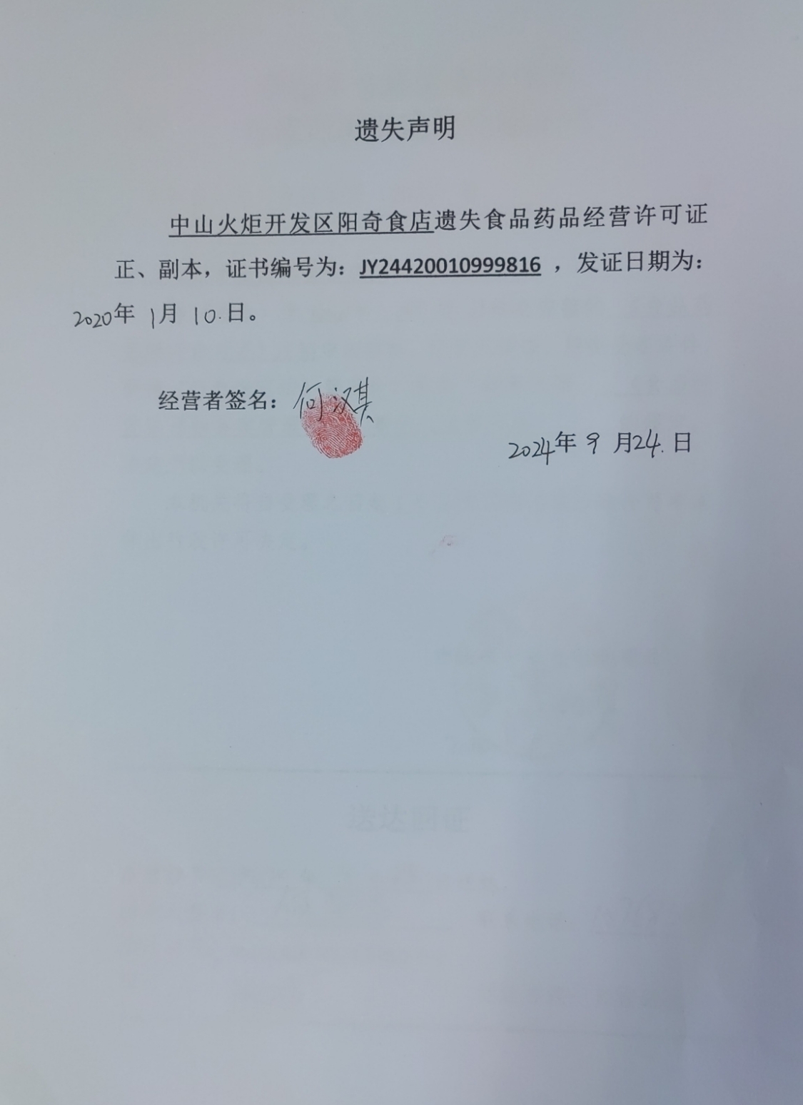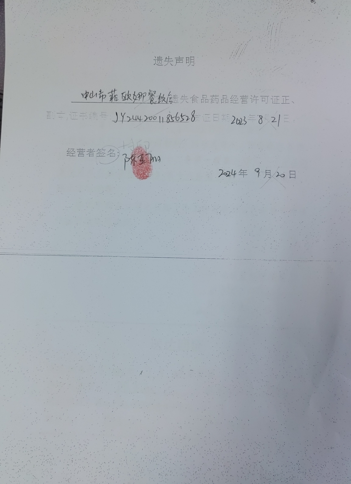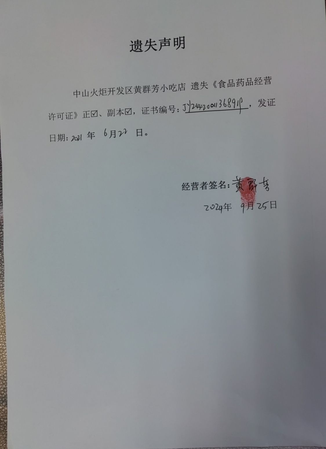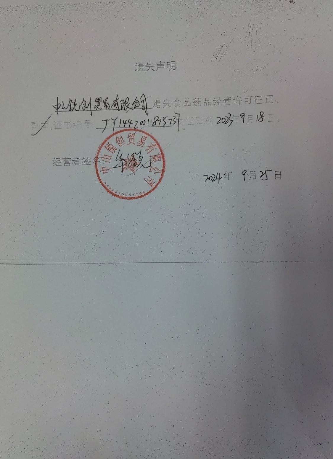 食品药品经营许可证遗失声明(中山锐创贸易有限公司、中山火炬开发区阳奇食店、中山市菲欧娜餐饮店、中山火炬开发区黄群芳小吃店)
