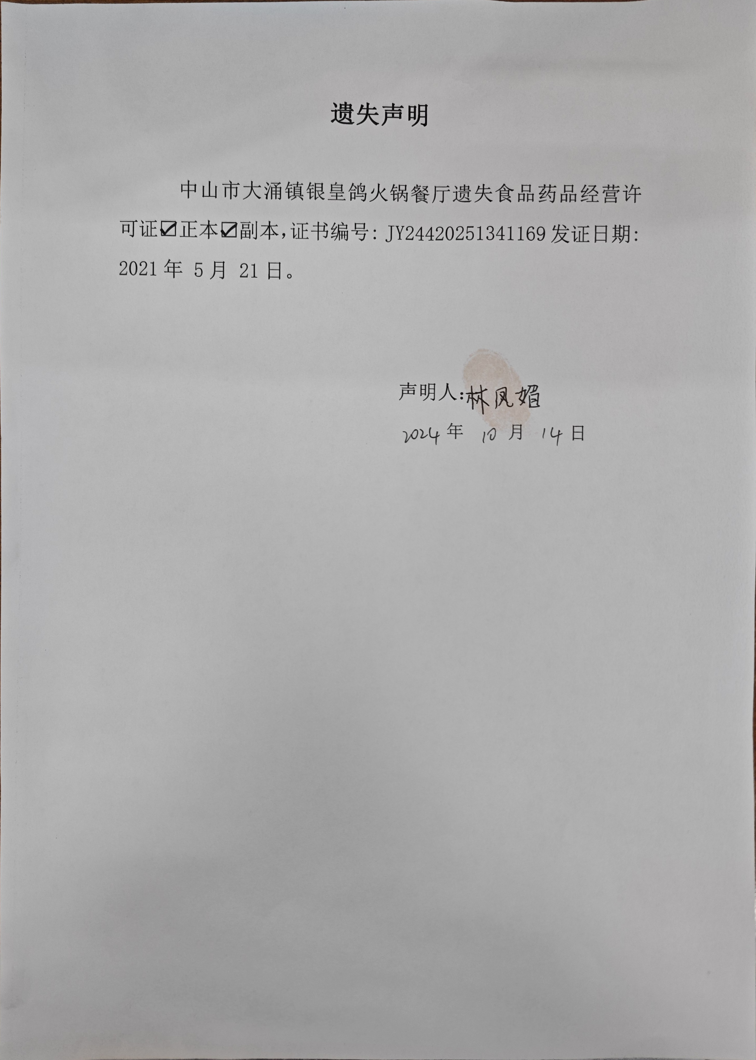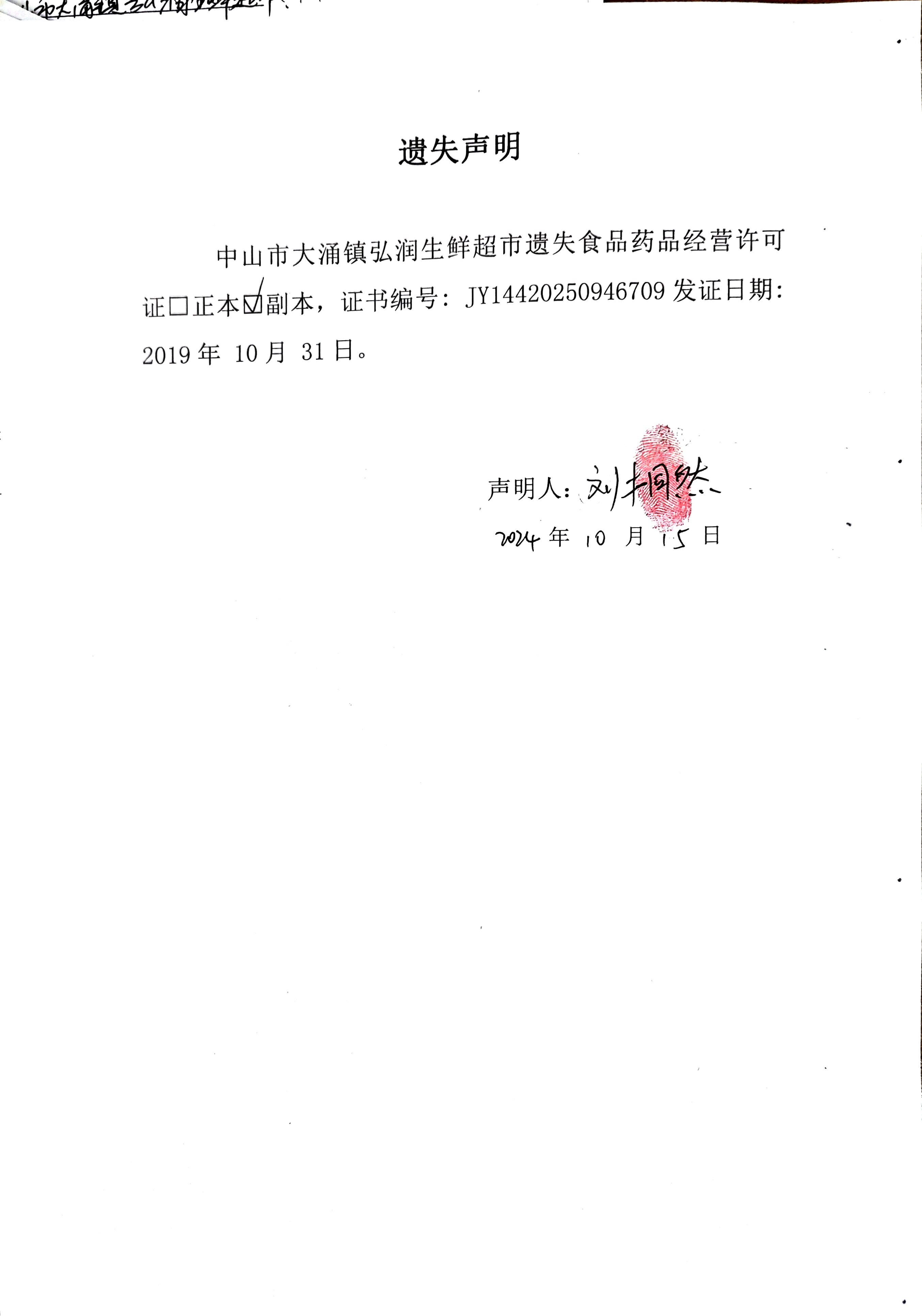 食品药品经营许可证遗失声明(中山市大涌镇弘润生鲜超市、中山市大涌镇银皇鸽火锅餐厅)