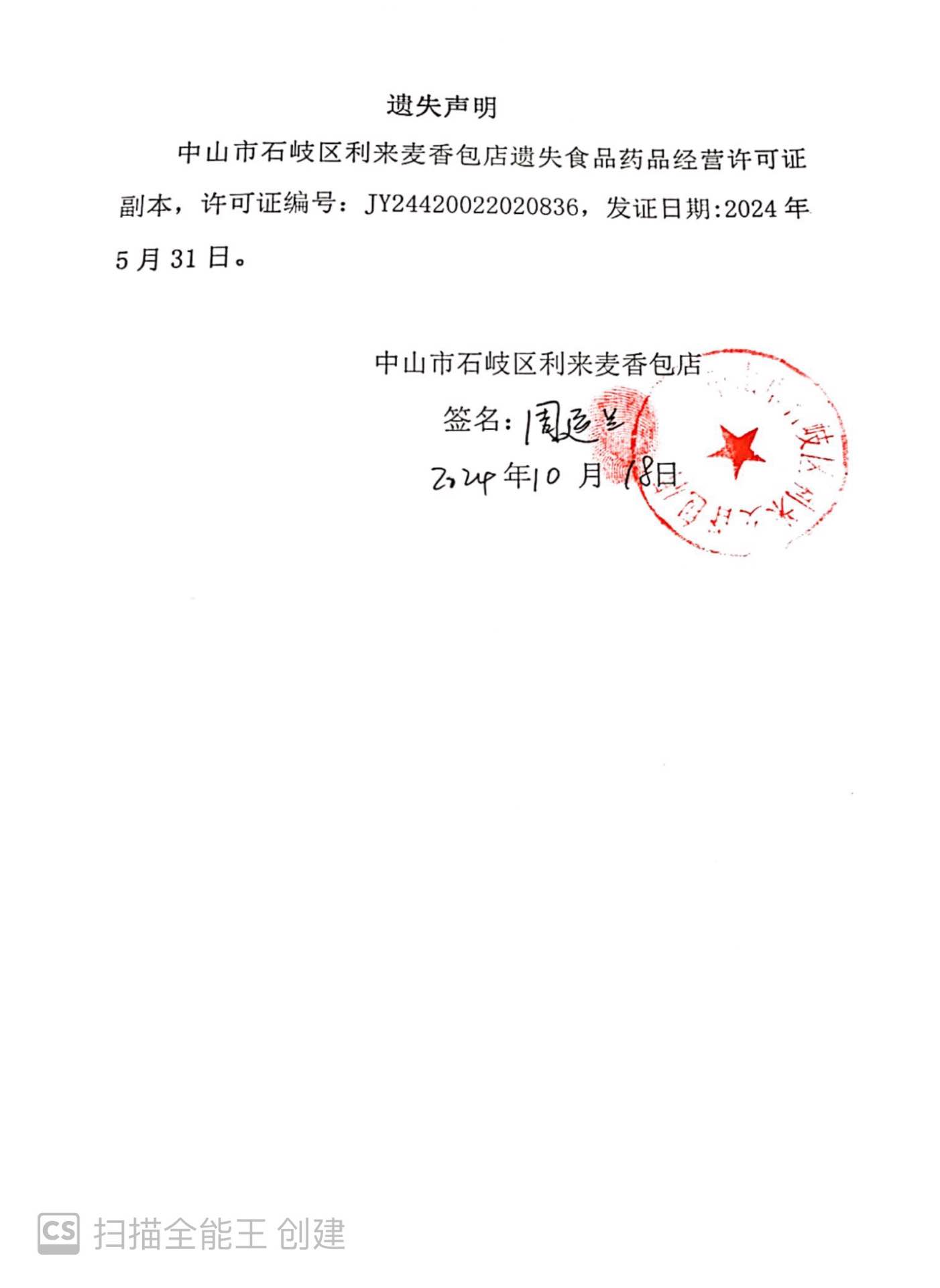 食品药品经营许可证遗失声明(中山市石岐区利来麦香包店)