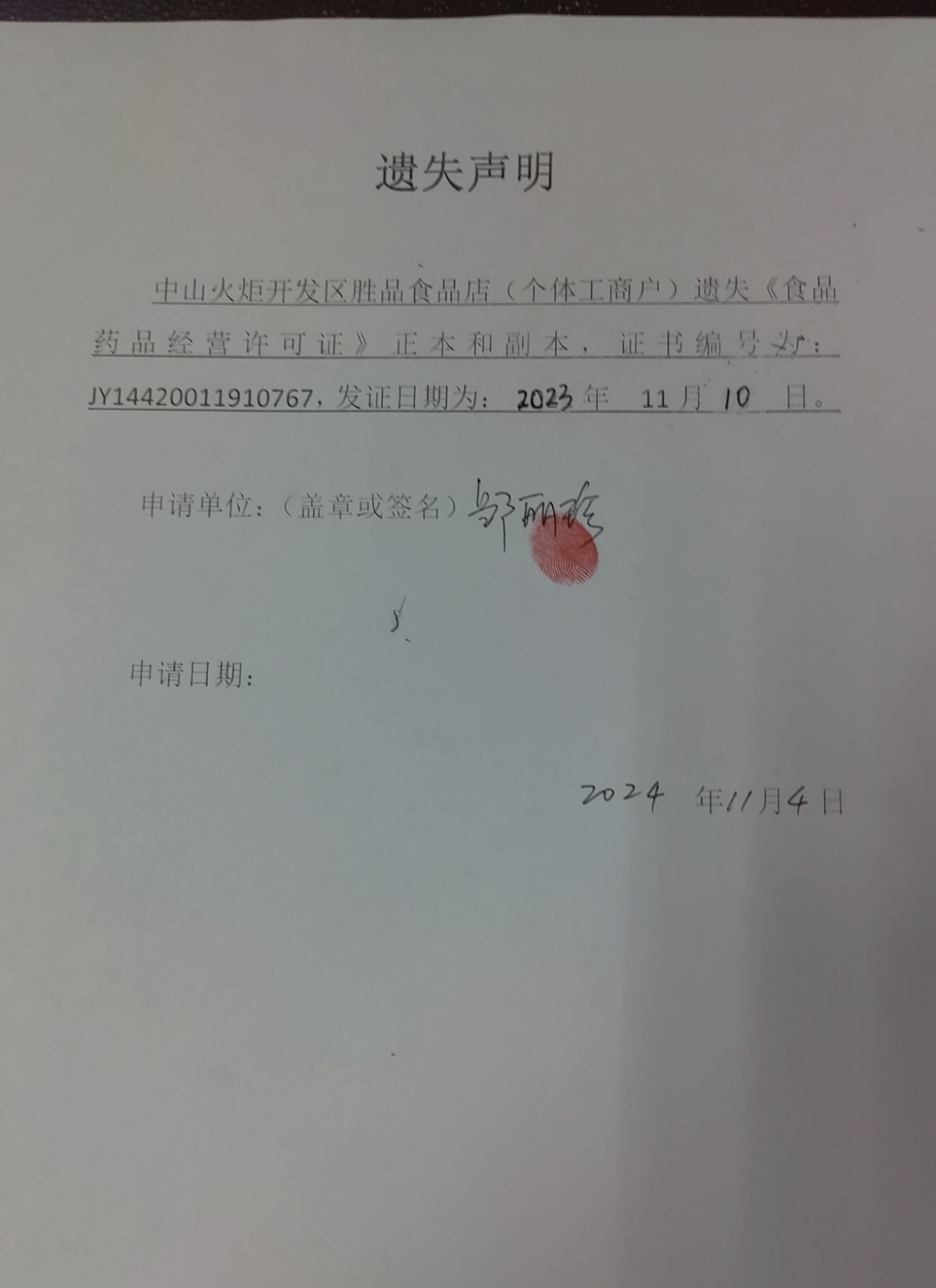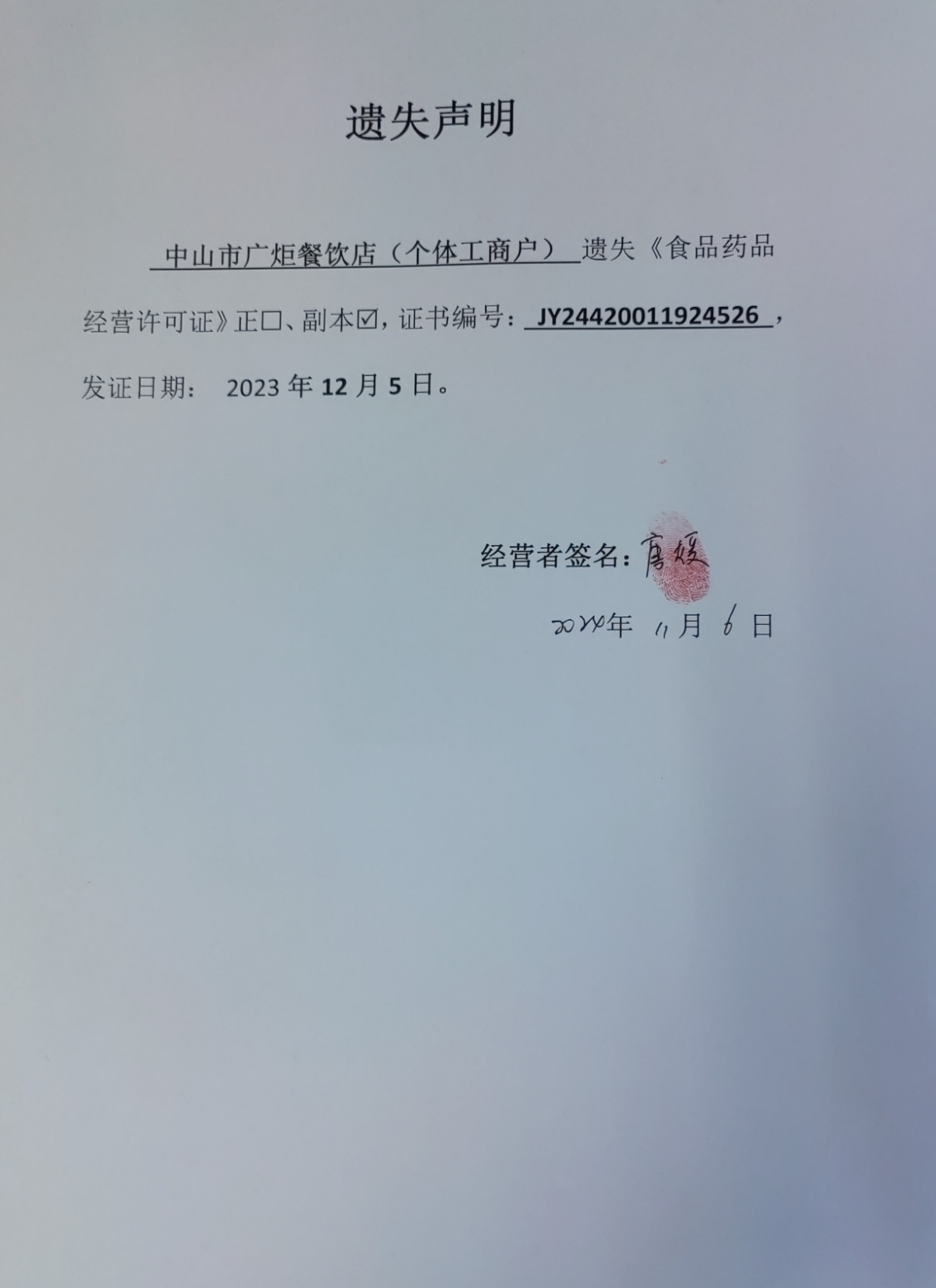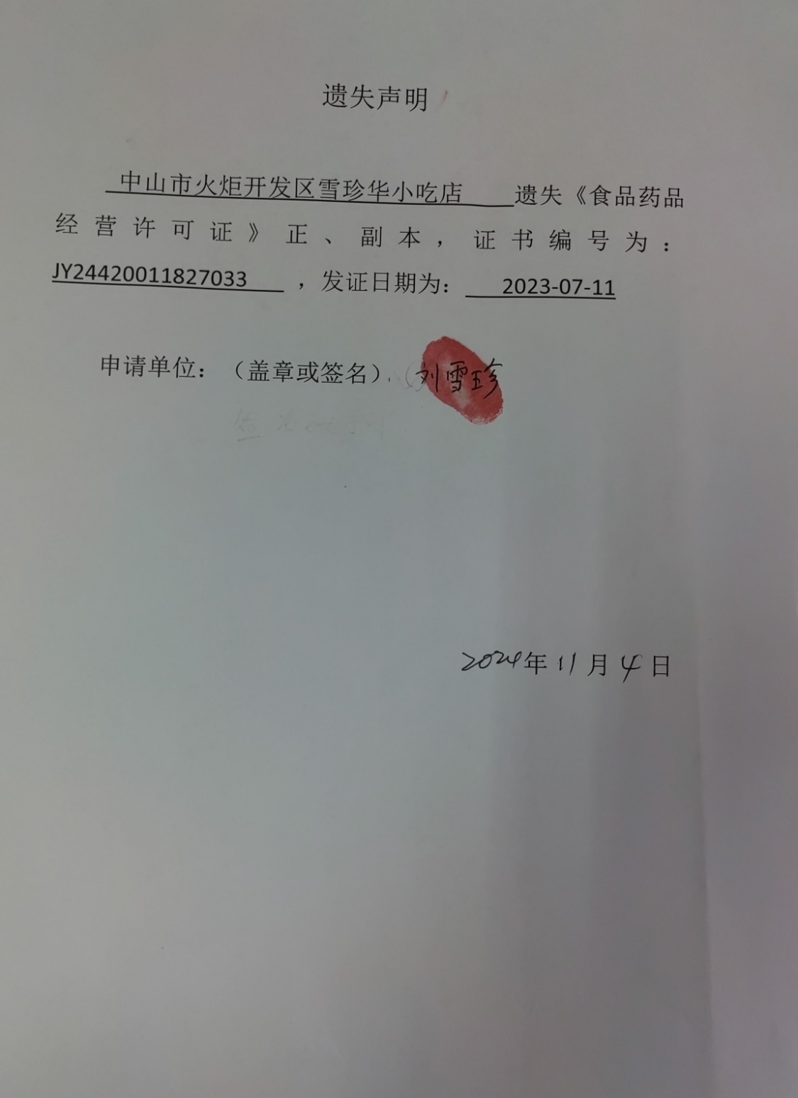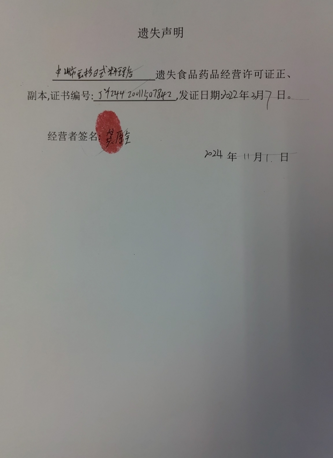 食品药品经营许可证遗失声明【中山市广炬餐饮店(个体工商户)、中山市火炬开发区雪珍华小吃店、中山火炬开发区胜品食品店(个体工商户)、中山市云杉日式料理店)