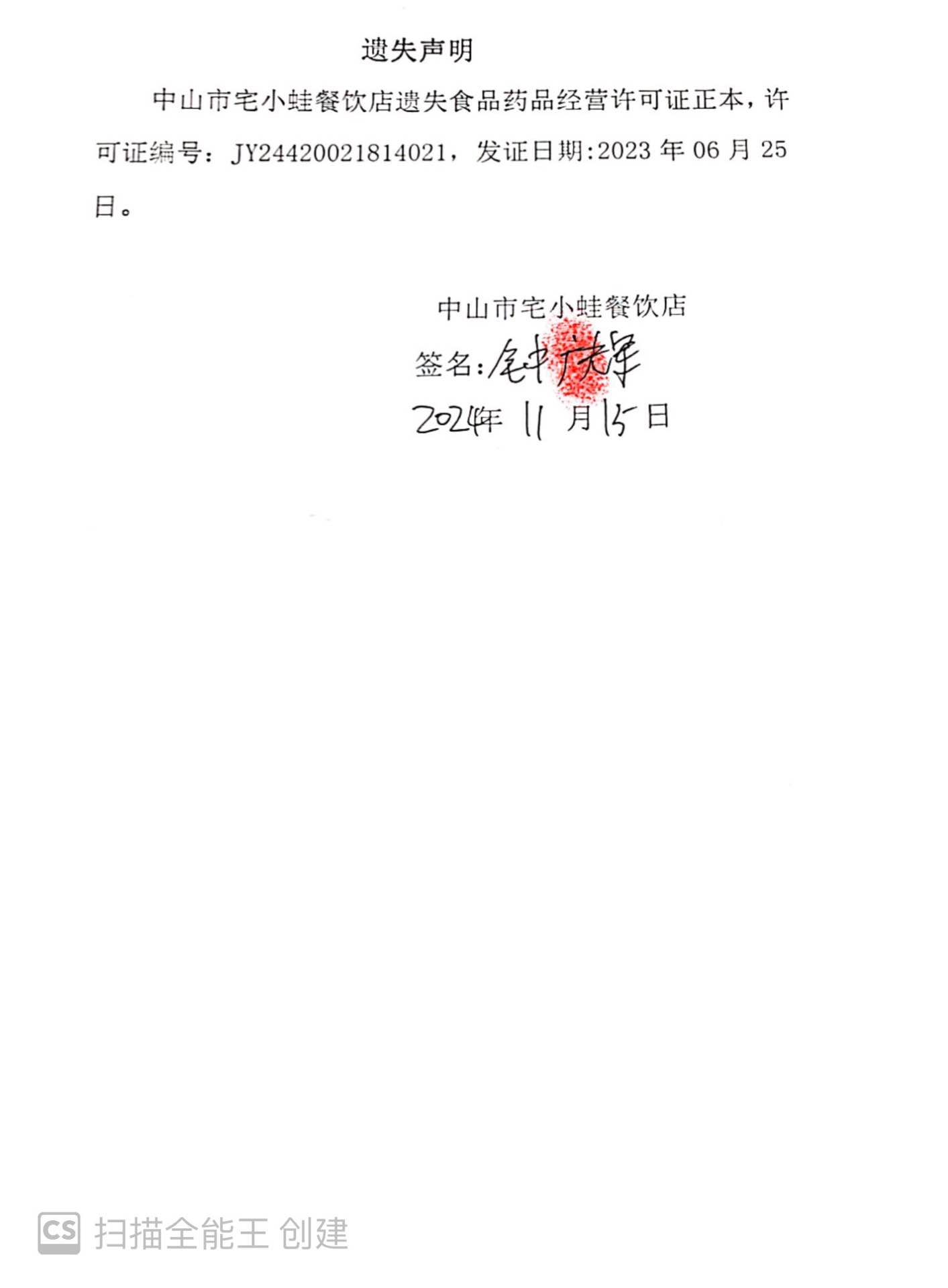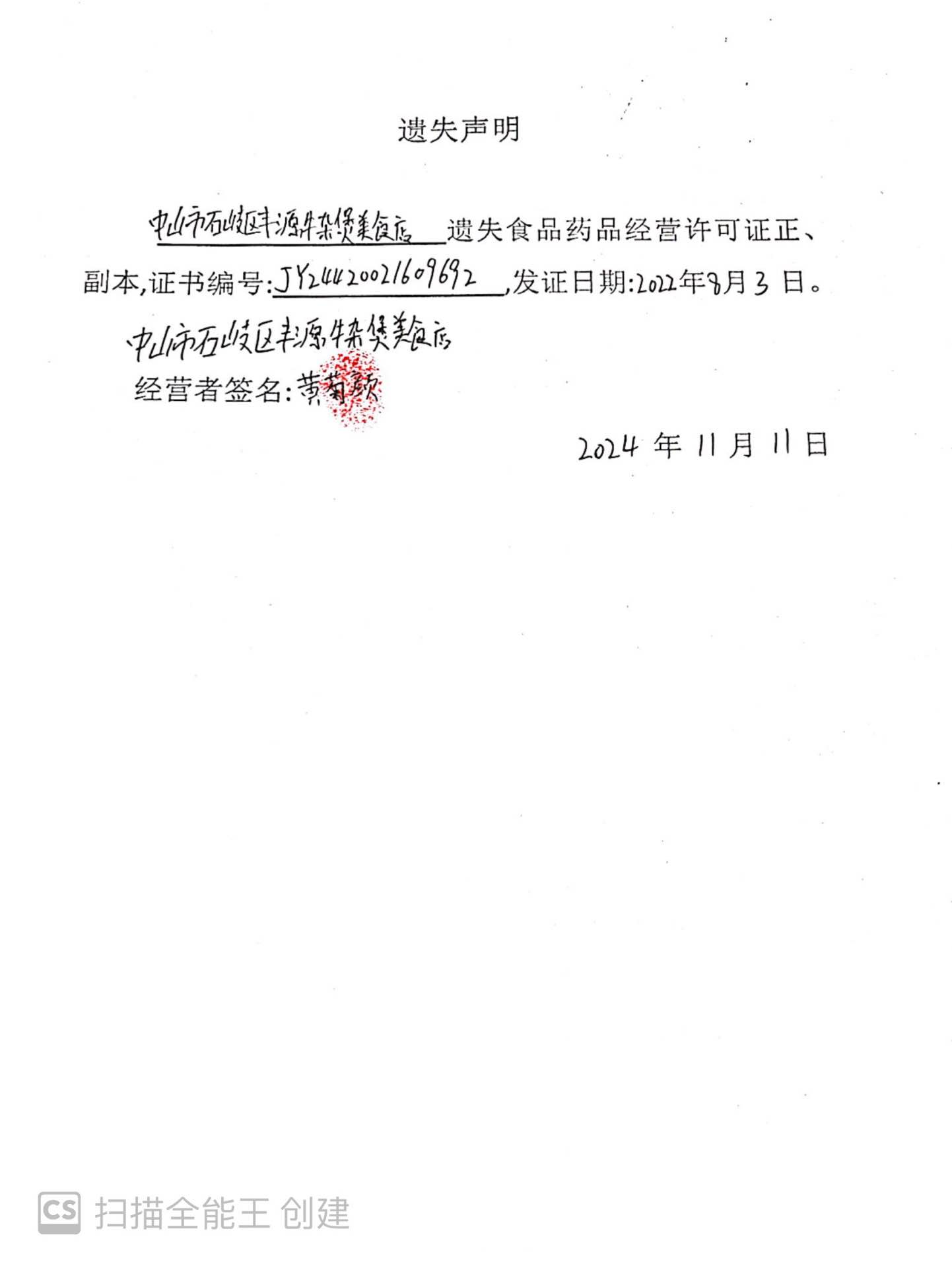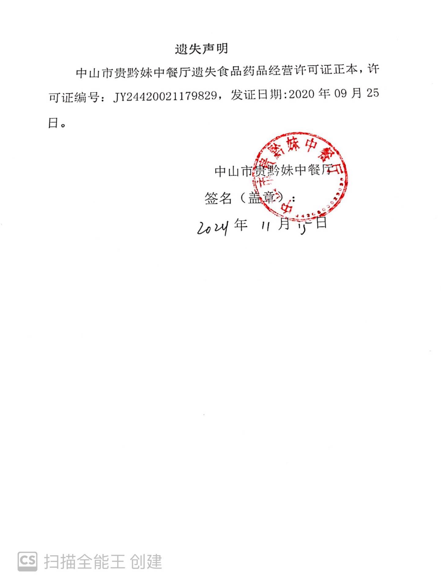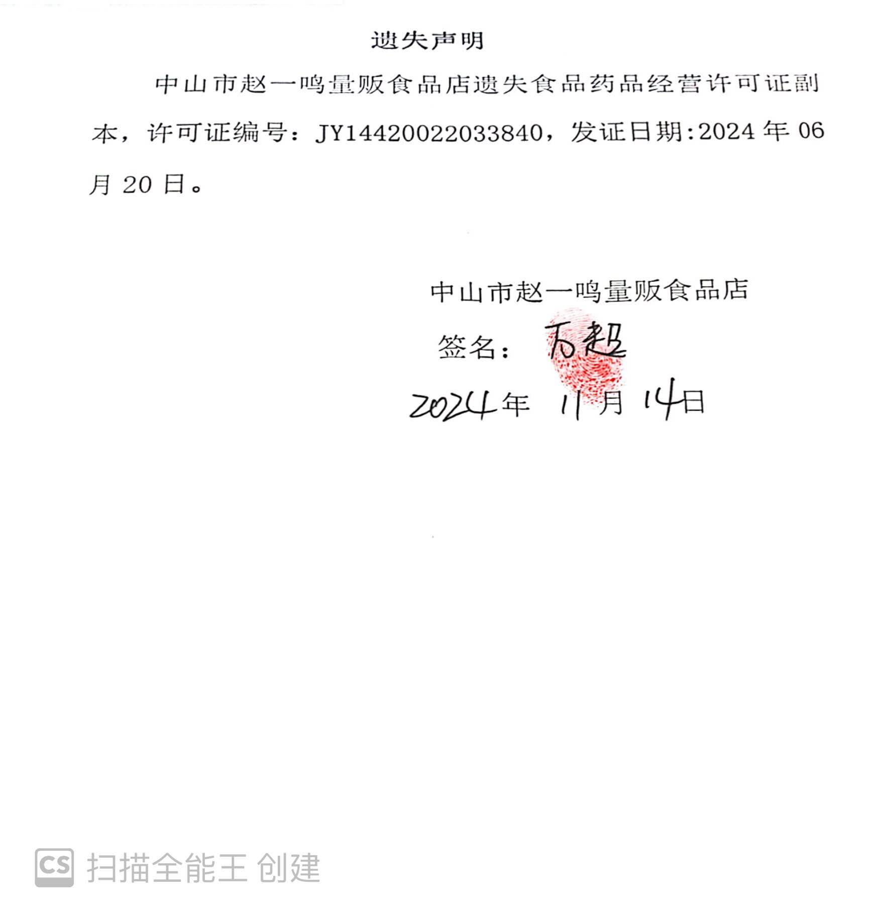 食品药品经营许可证遗失声明(中山市石岐区丰源牛杂煲美食店、中山市赵一鸣量贩食品店、中山市贵黔妹中餐厅、中山市宅小蛙餐饮店)