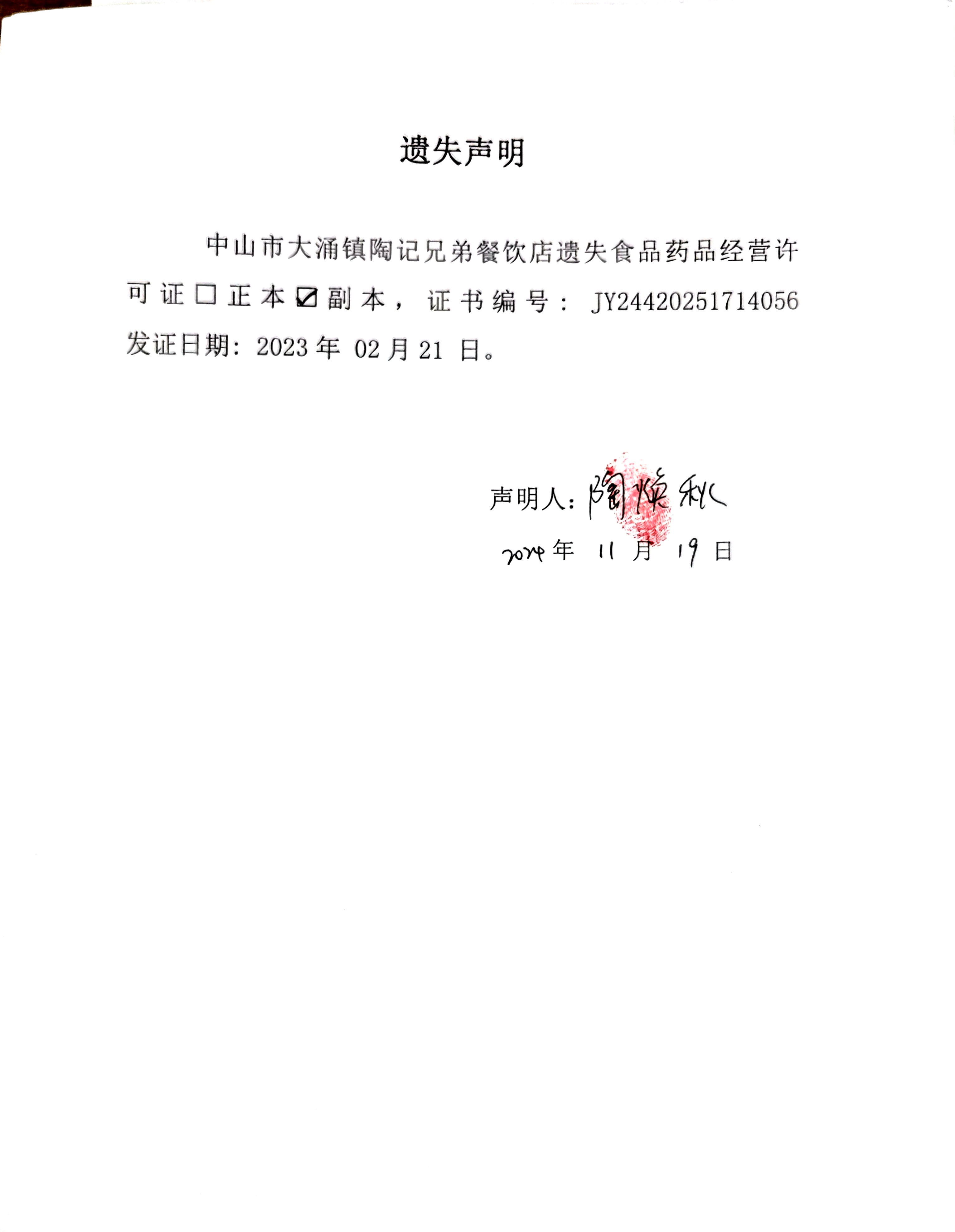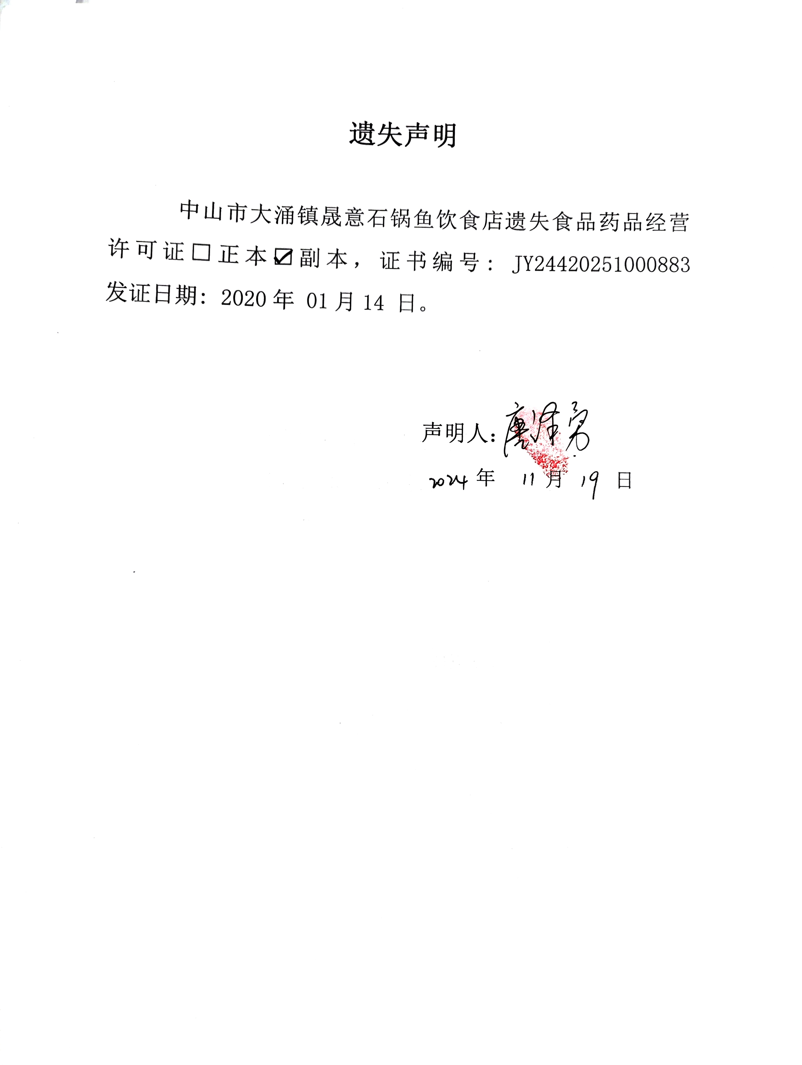 食品药品经营许可证遗失声明【中山市大涌镇晟意石锅鱼饮食店、中山市大涌镇陶记兄弟餐饮店、中山市祺豪餐饮店(个体工商户)】