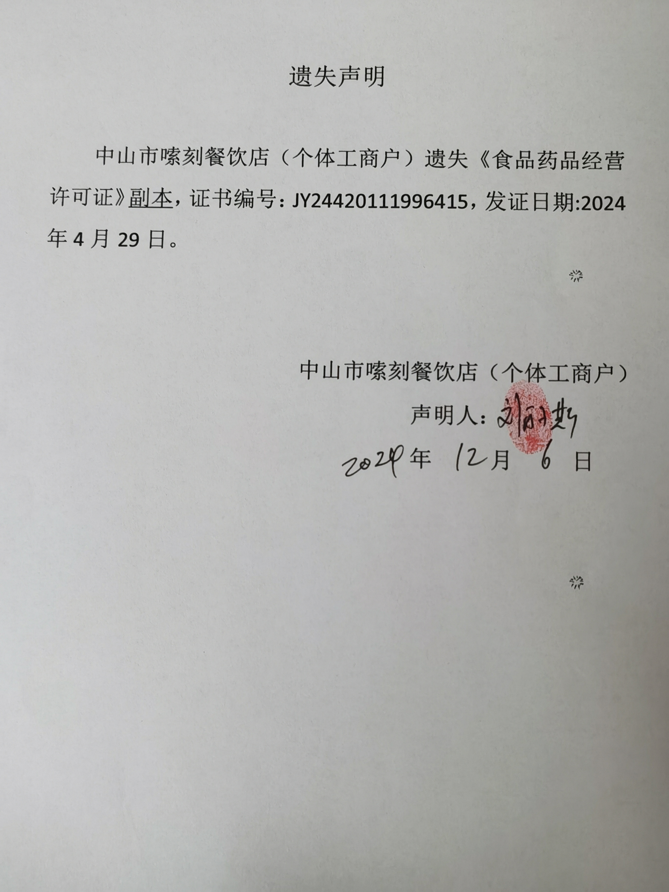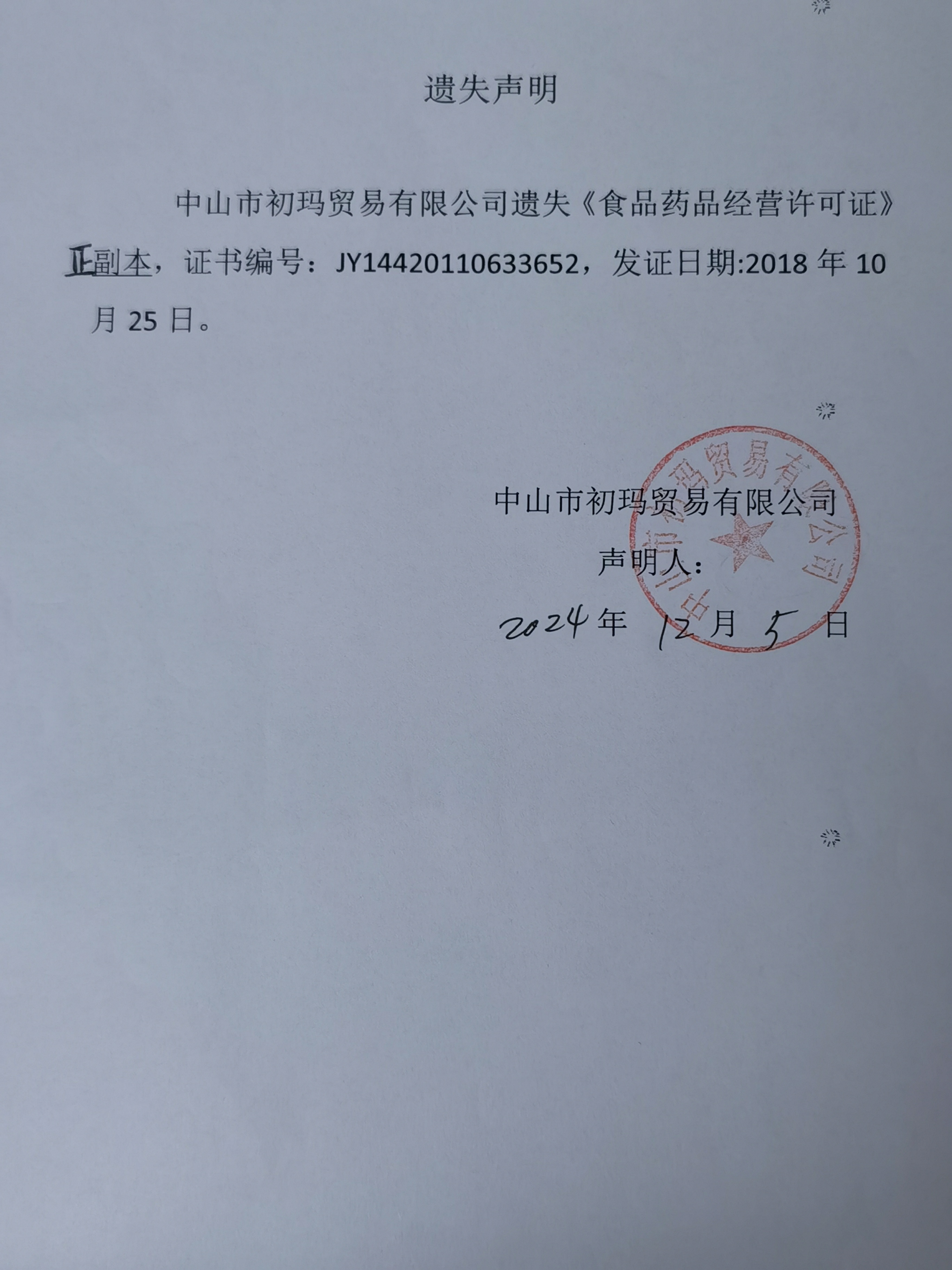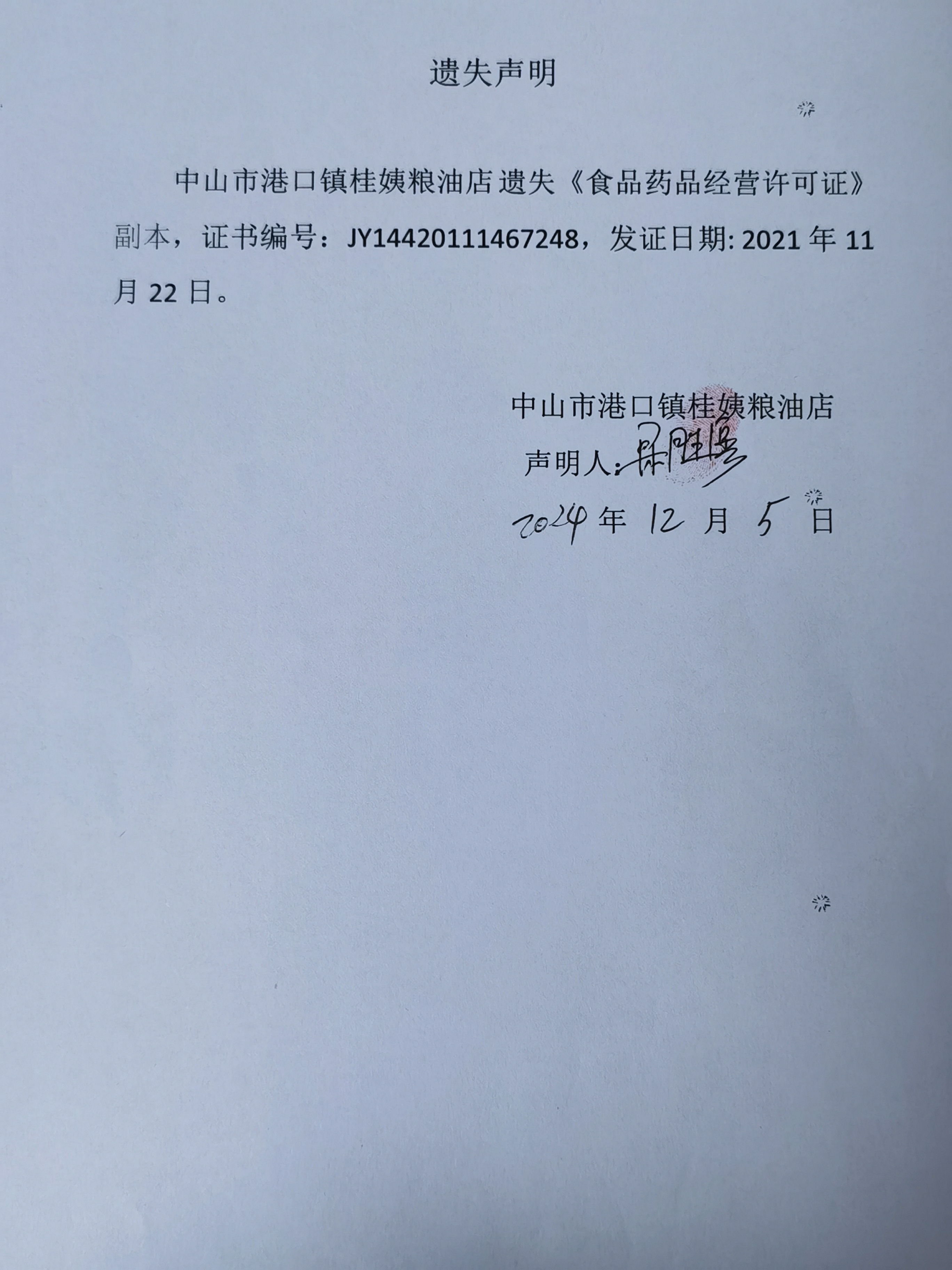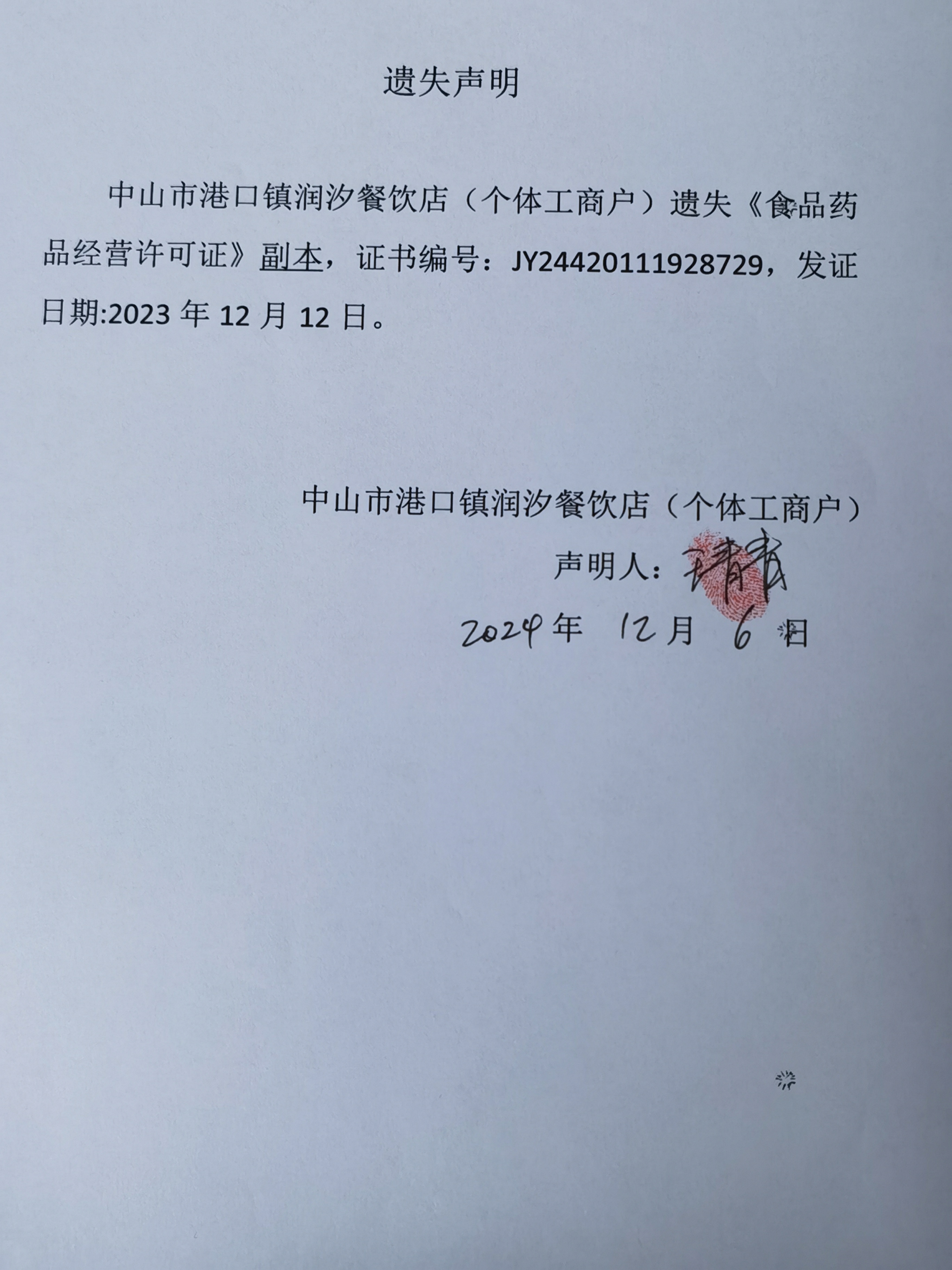 食品药品经营许可证遗失声明【中山市港口镇润汐餐饮店(个体工商户)、中山市嗦刻餐饮店(个体工商户)、中山市初玛贸易有限公司、中山市港口镇桂姨粮油店】