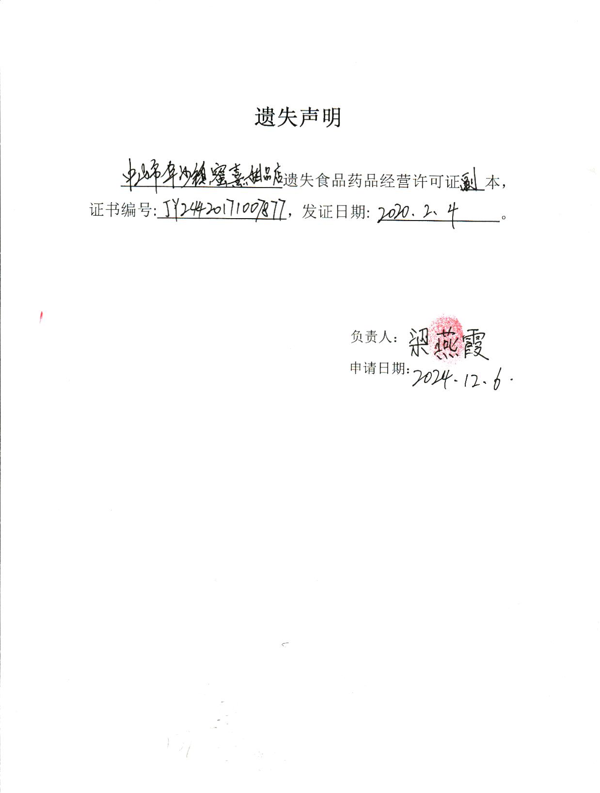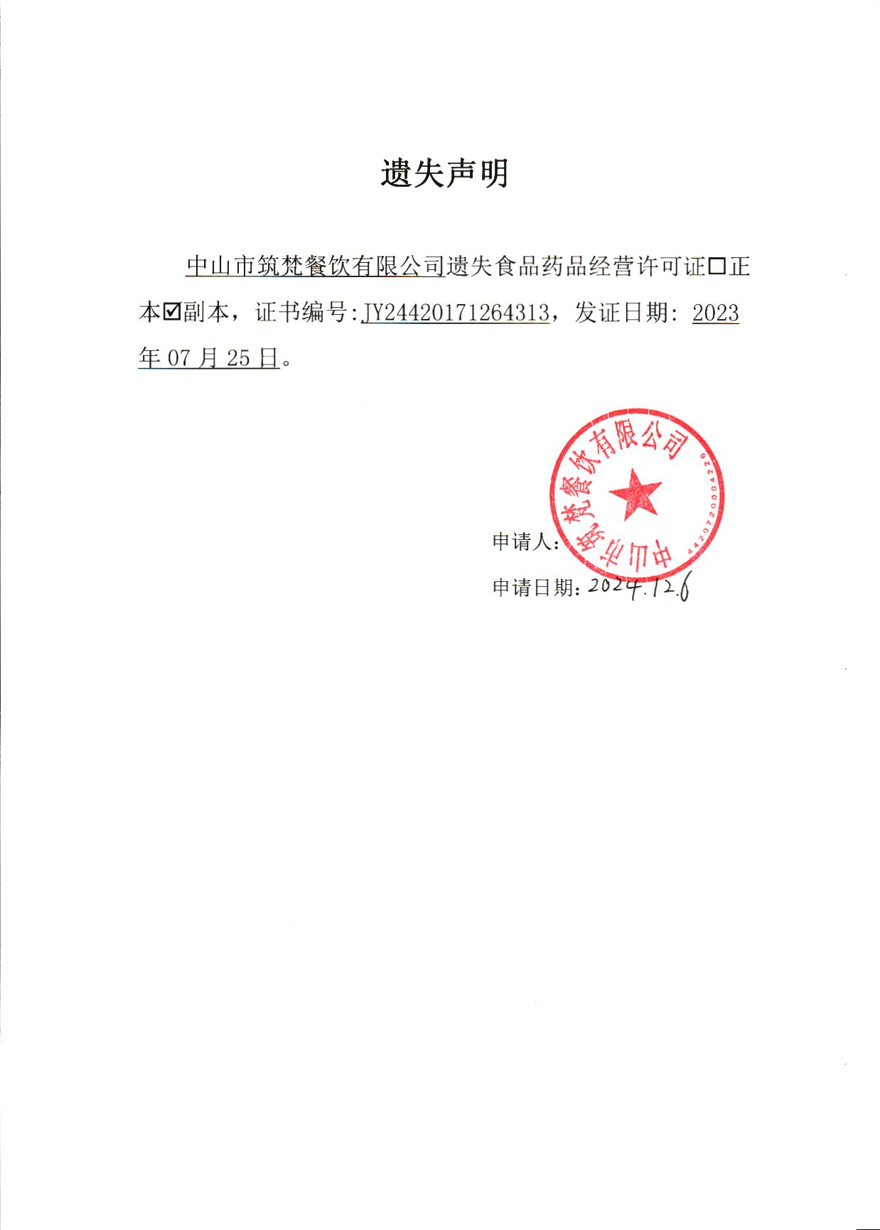 食品药品经营许可证遗失声明(中山市筑梵餐饮有限公司、中山市阜沙镇蜜熹甜品店)