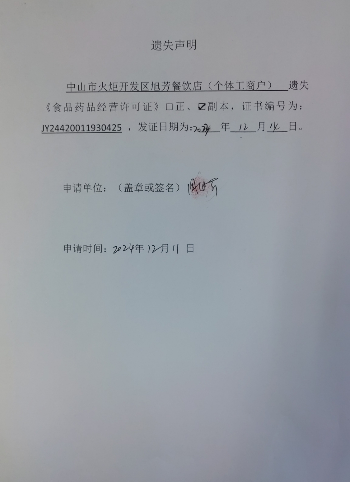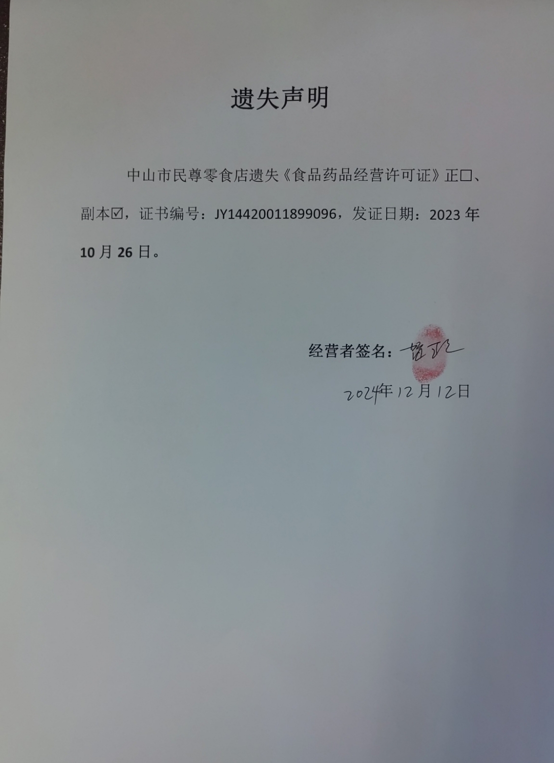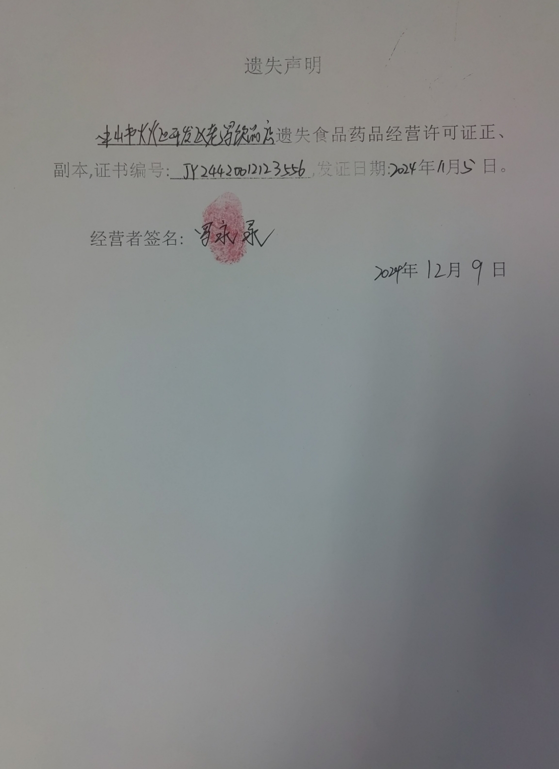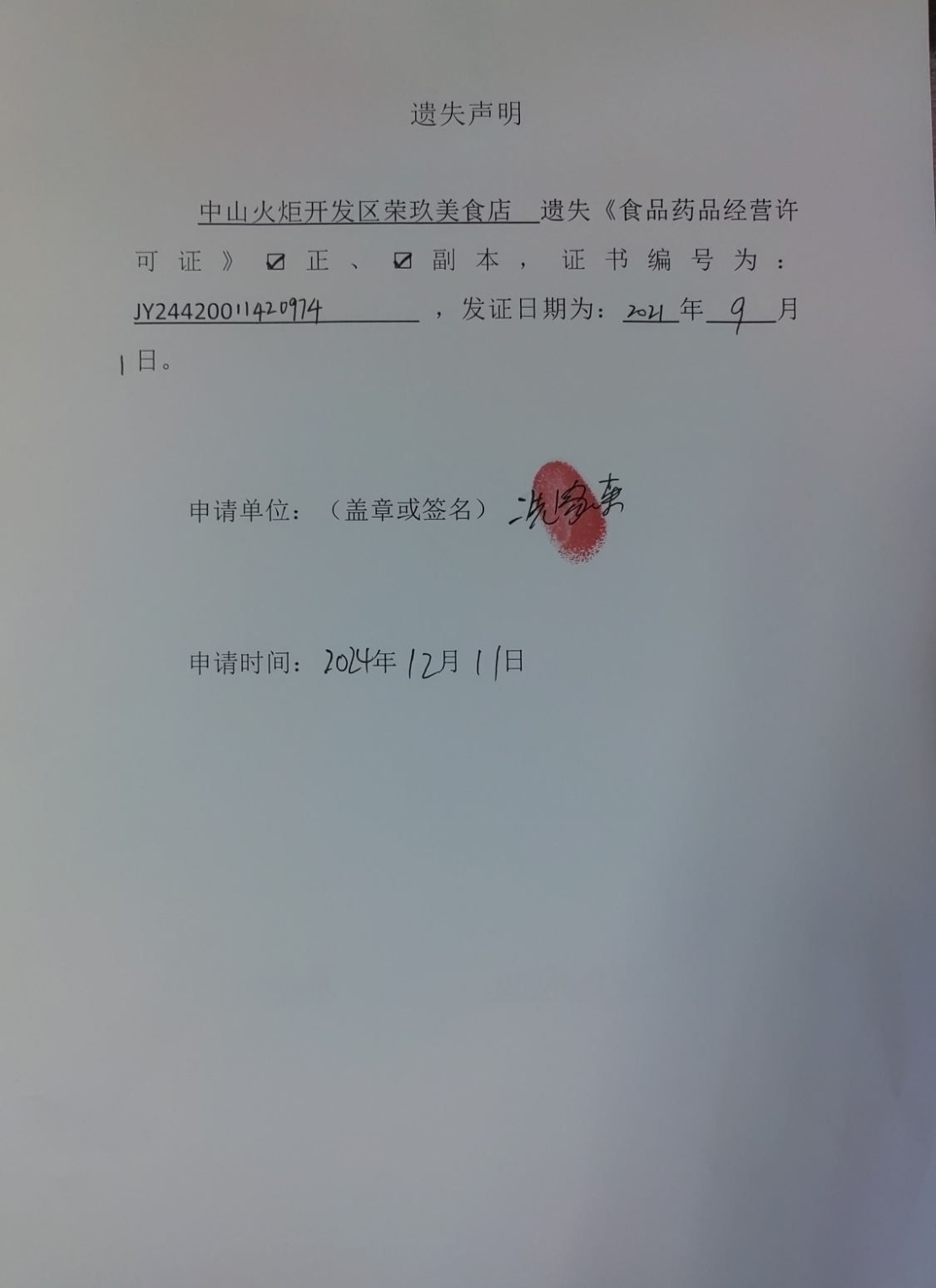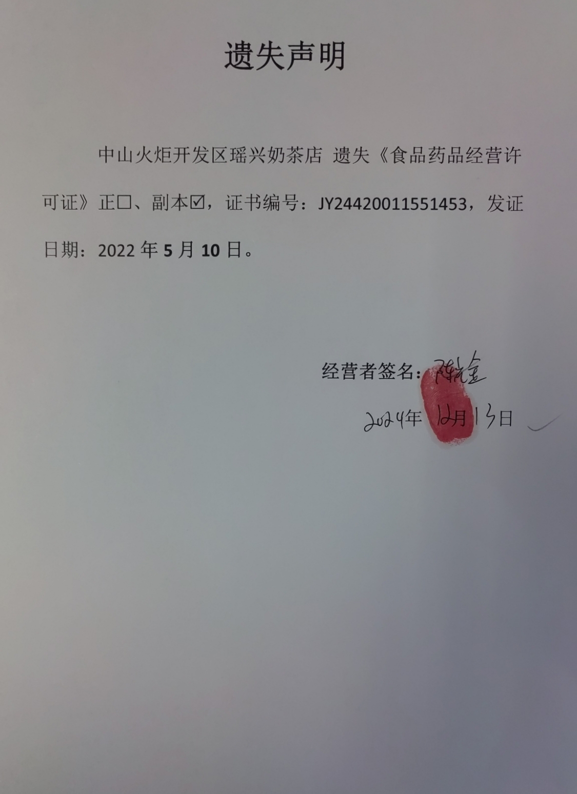 食品药品经营许可证遗失声明【中山火炬开发区荣玖美食店、中山火炬开发区瑶兴奶茶店、中山市火炬开发区旭芳餐饮店、中山市民尊零食店、中山市火炬开发区老罗饮品店(个体工商户)】