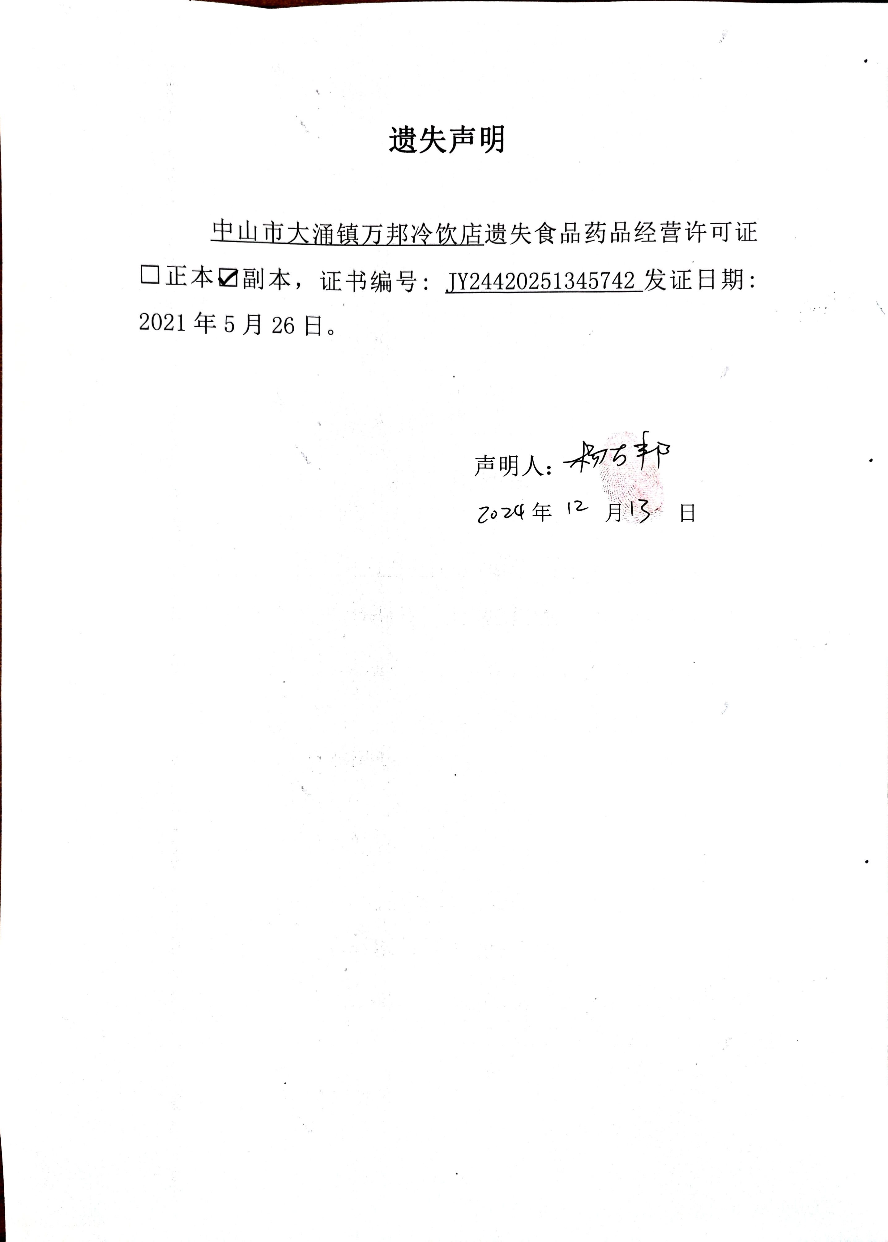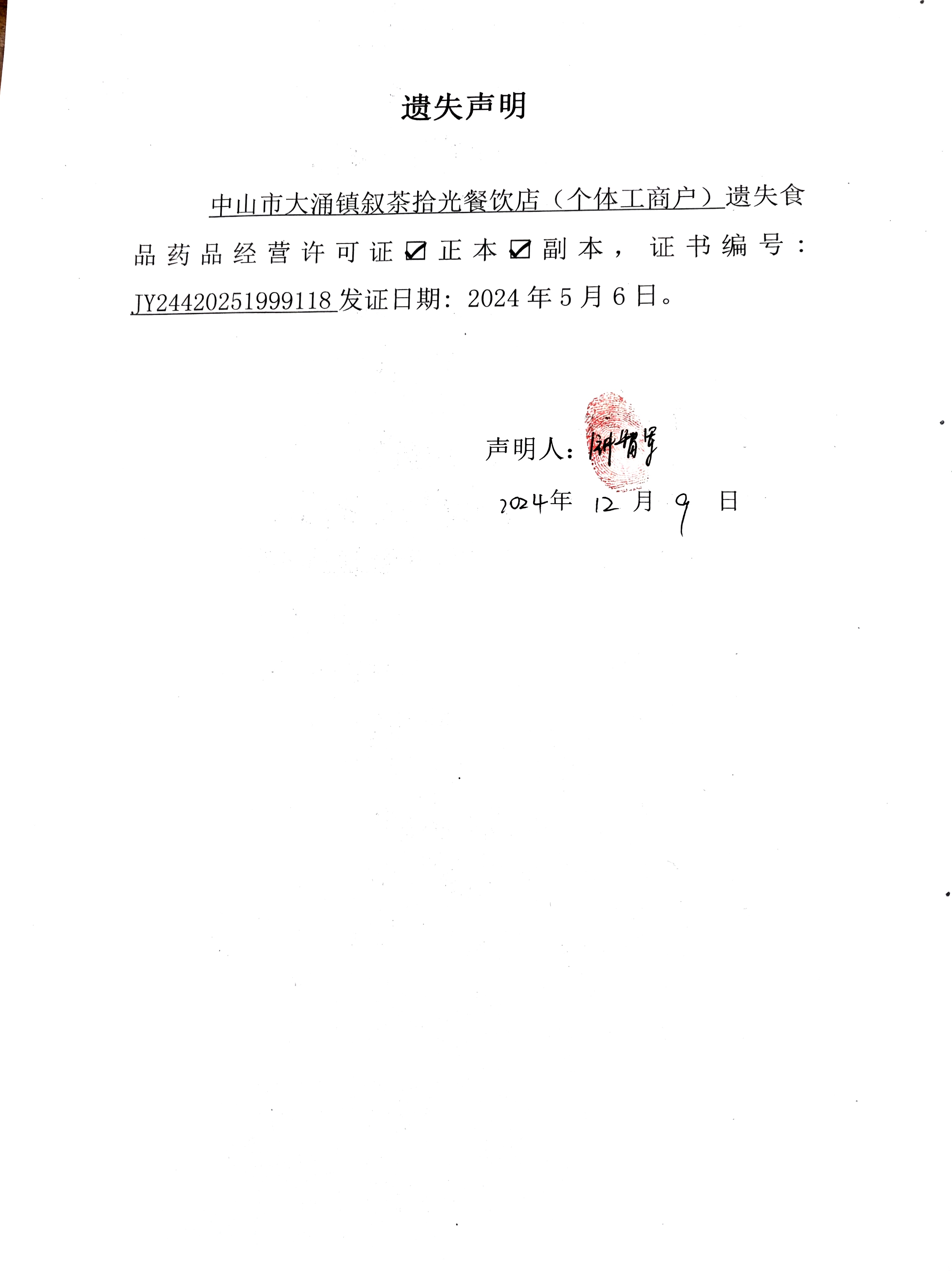食品药品经营许可证遗失声明【中山市大涌镇叙茶拾光餐饮店(个体工商户)、中山市大涌镇万邦冷饮店】