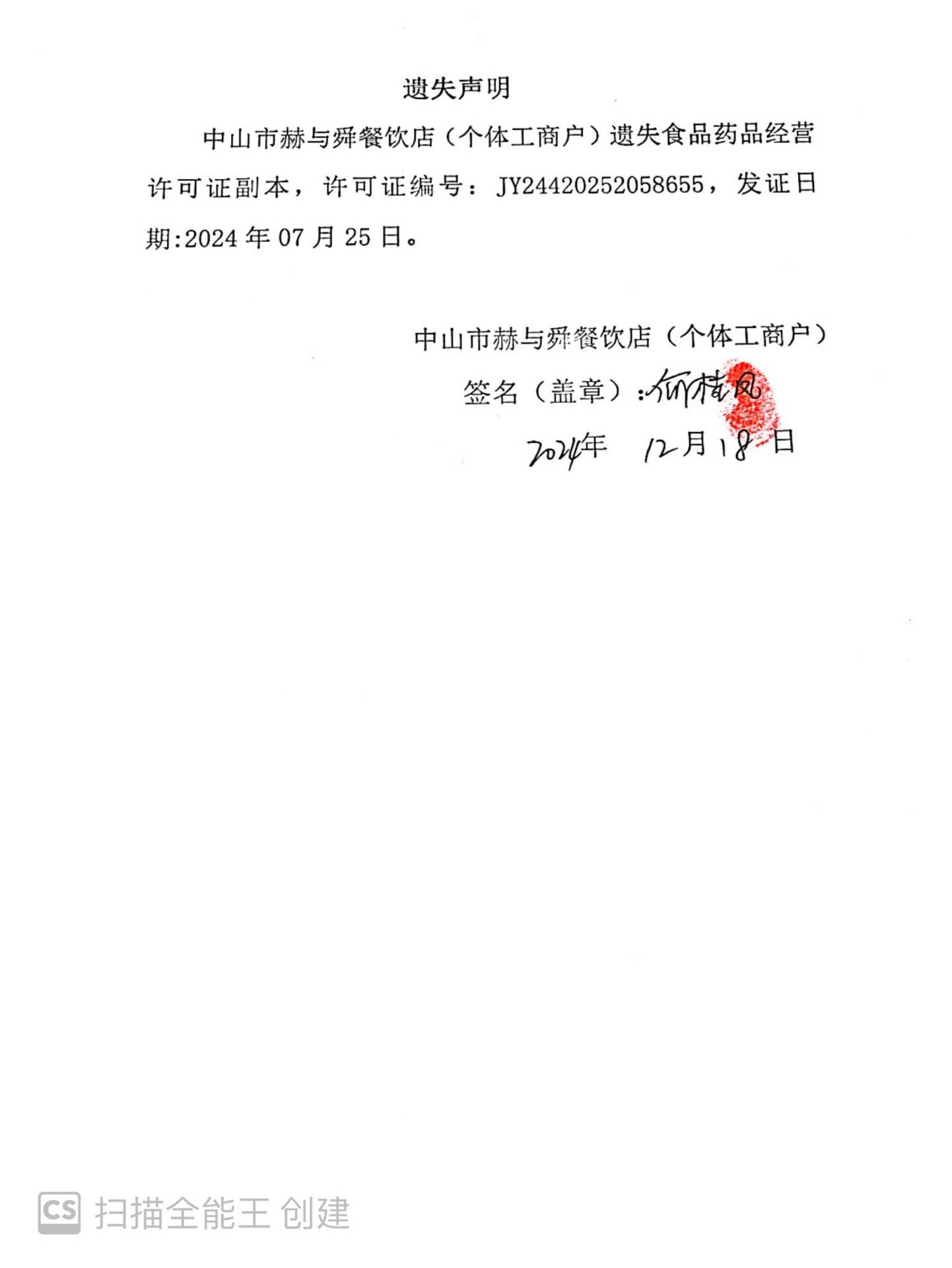 食品药品经营许可证遗失声明【中山市赫与舜餐饮店(个体工商户)】