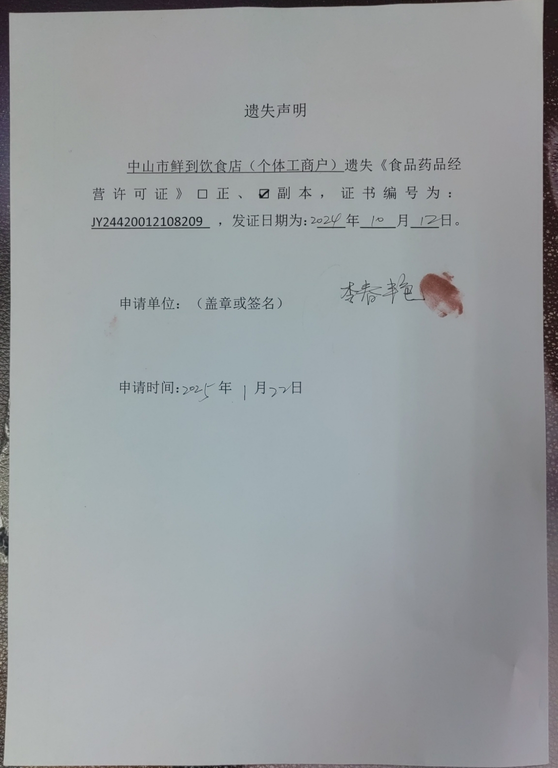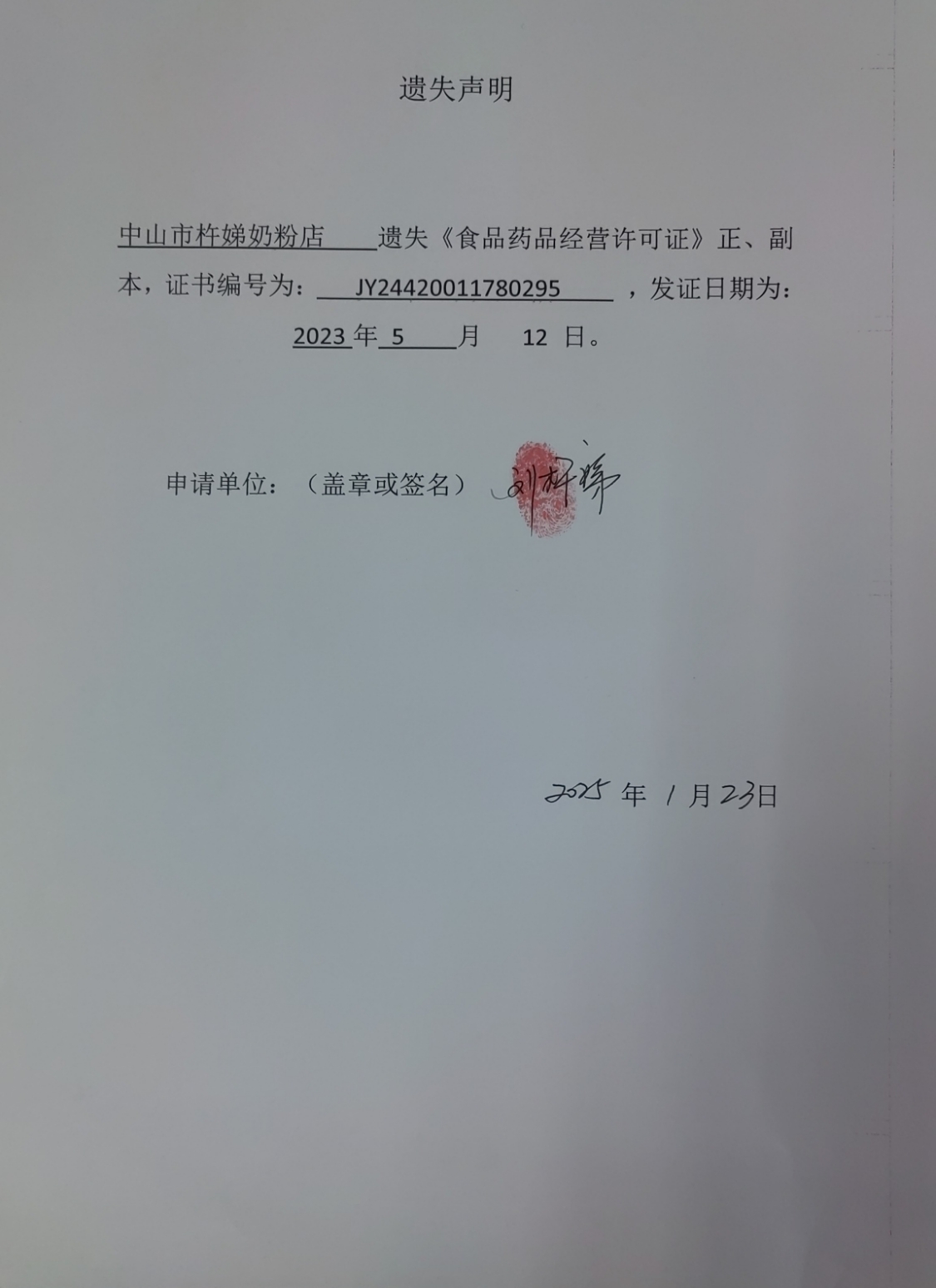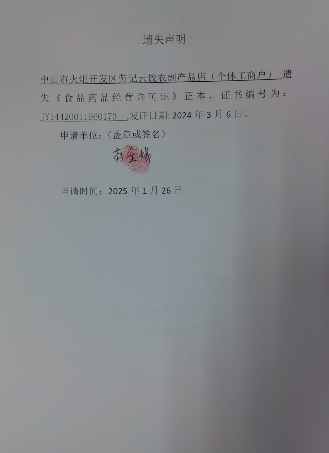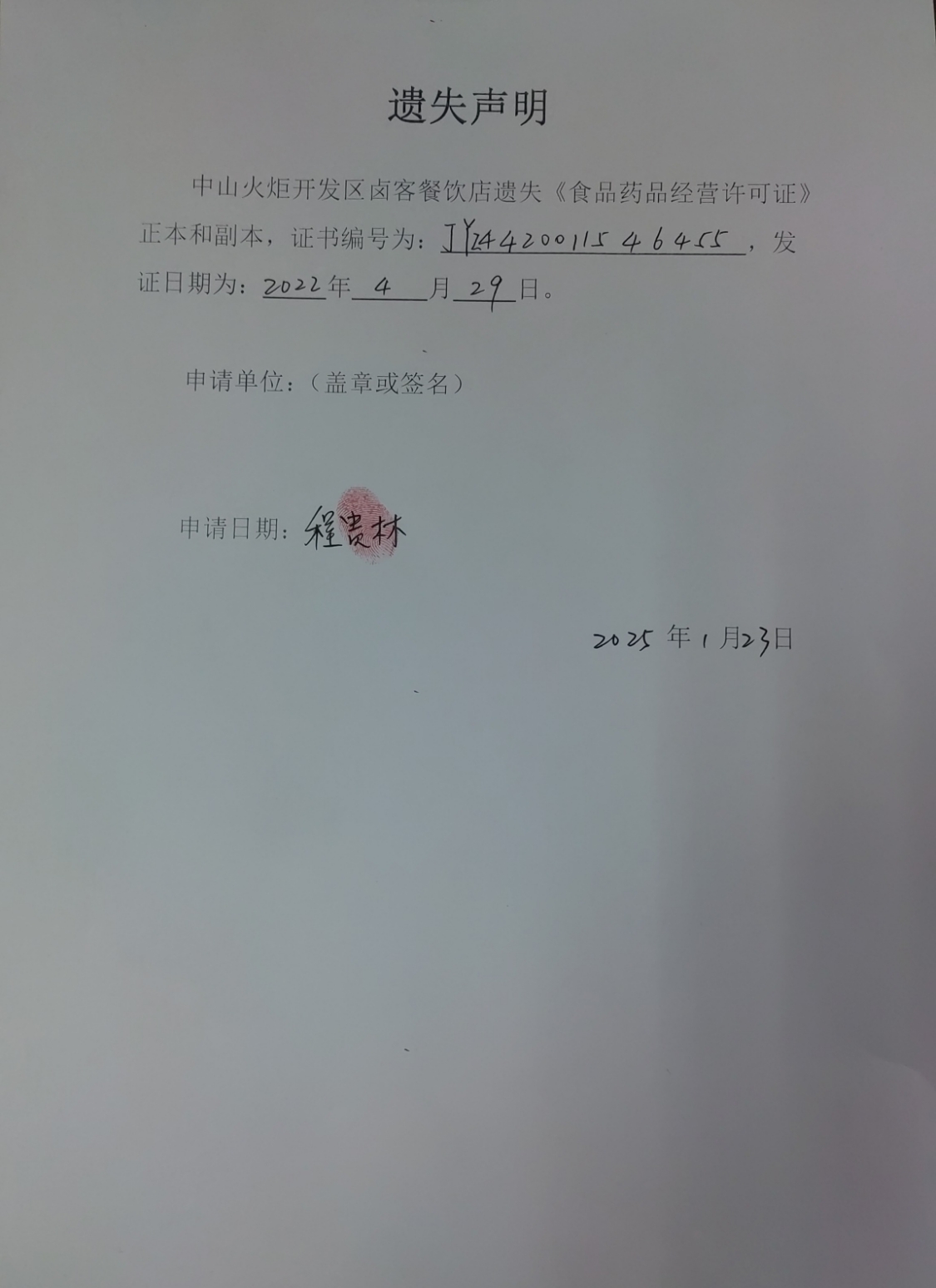 食品药品经营许可证遗失声明【中山市鲜到饮食店(个体工商户)、中山火炬开发区卤客餐饮店、中山市火炬开发区劳记云饺农副产品店(个体工商户)、中山市杵娣奶粉店】