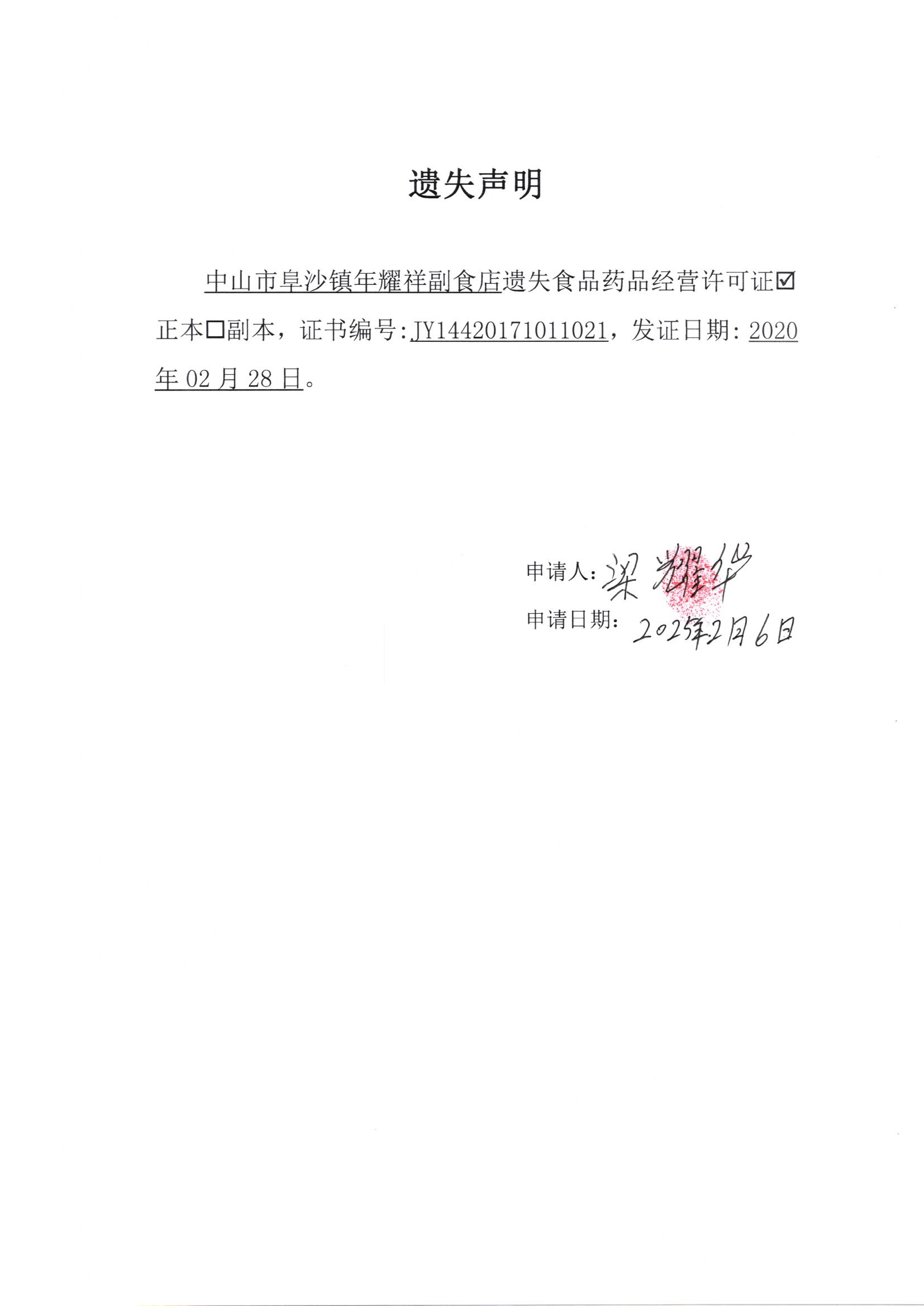 食品药品经营许可证遗失声明(中山市阜沙镇年耀祥副食店)