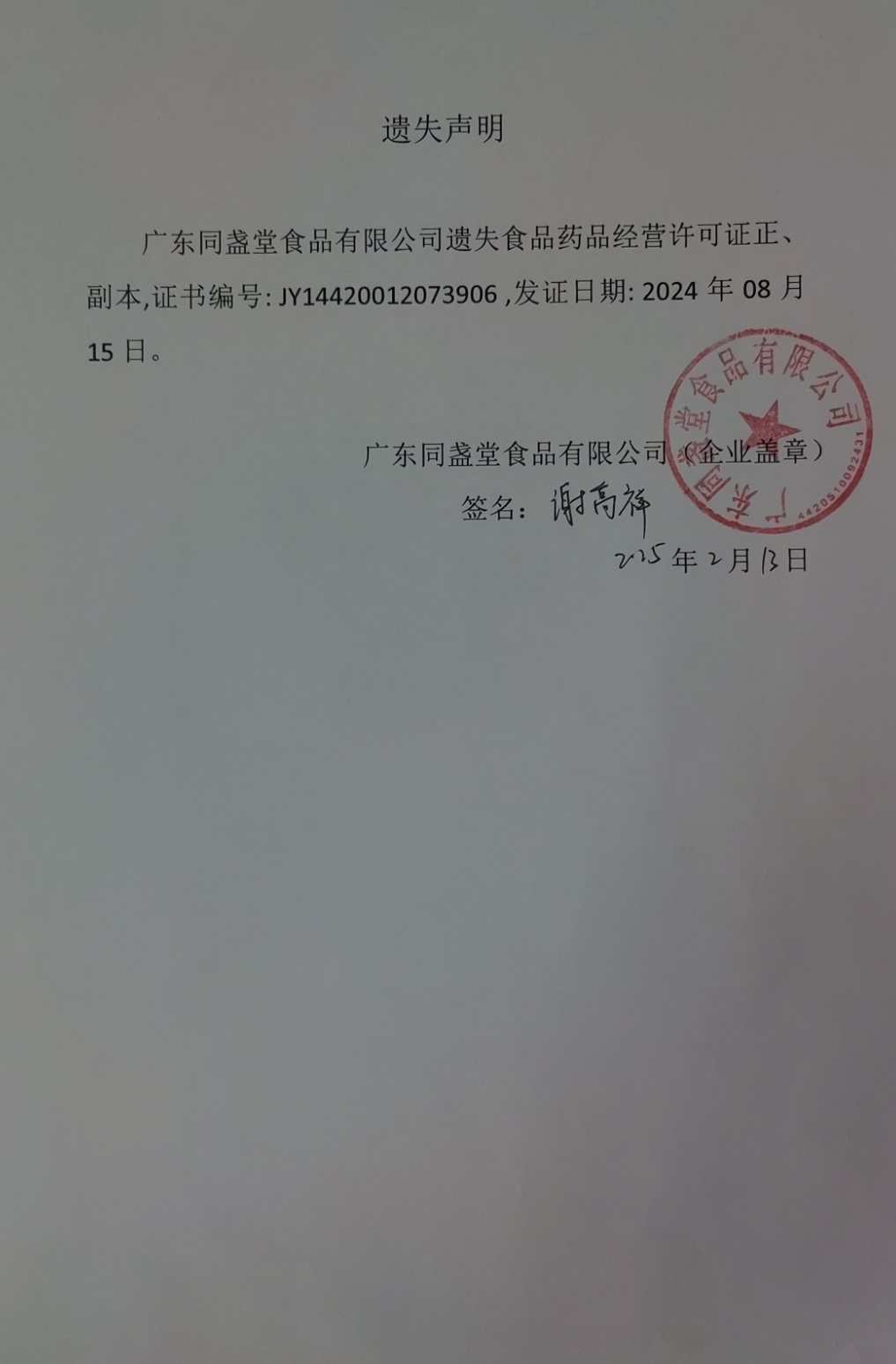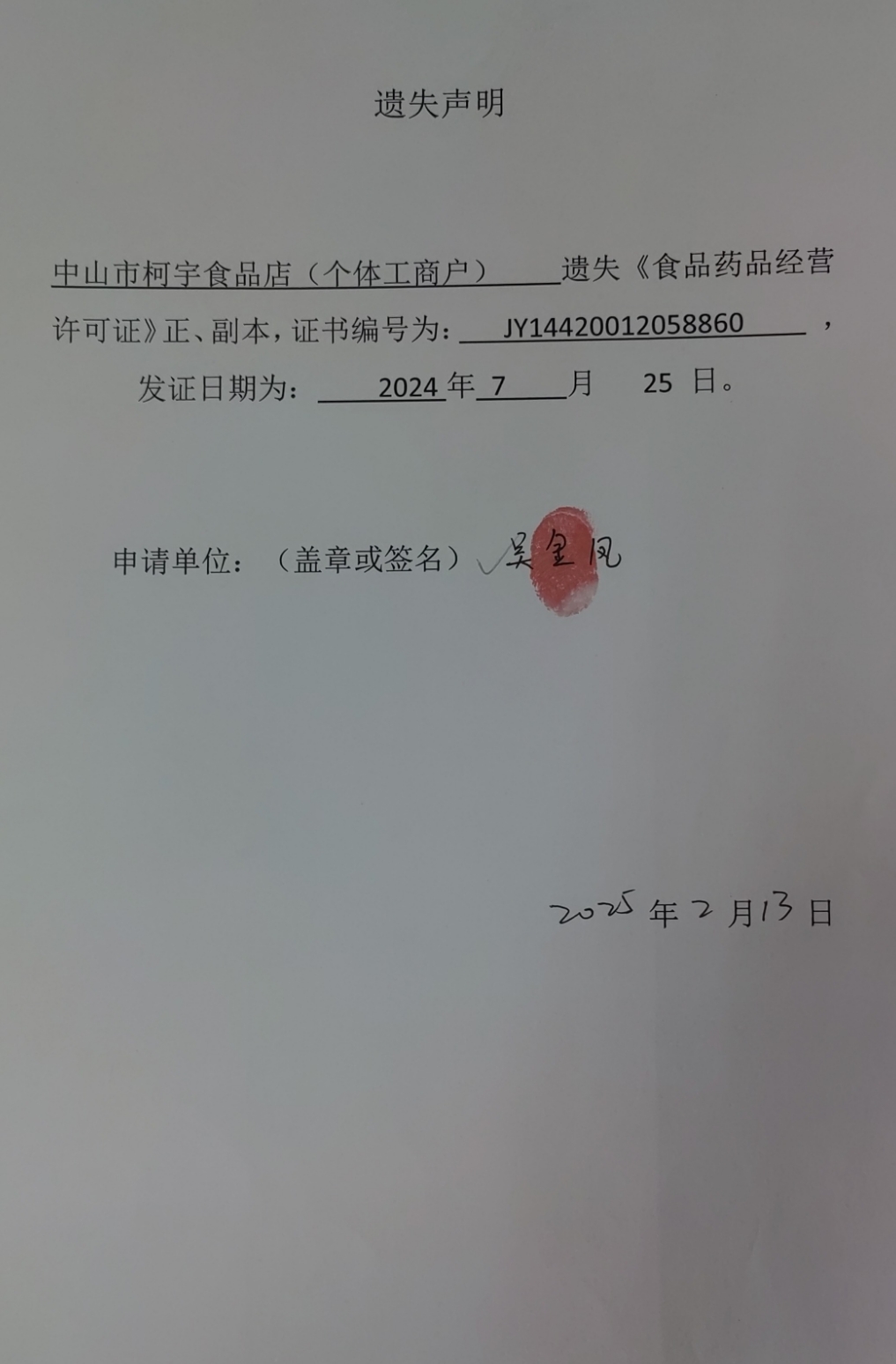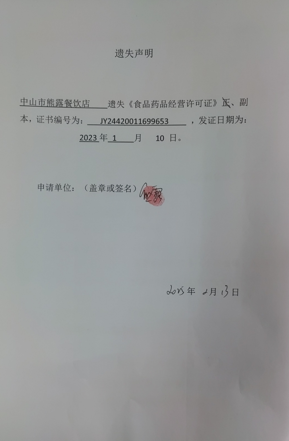 食品药品经营许可证遗失声明【中山市熊露餐饮店、中山市柯宇食品店(个体工商户)、中山火炬开发区常春餐饮店、中山市瑞乐餐饮店、广东同盏堂食品有限公司】