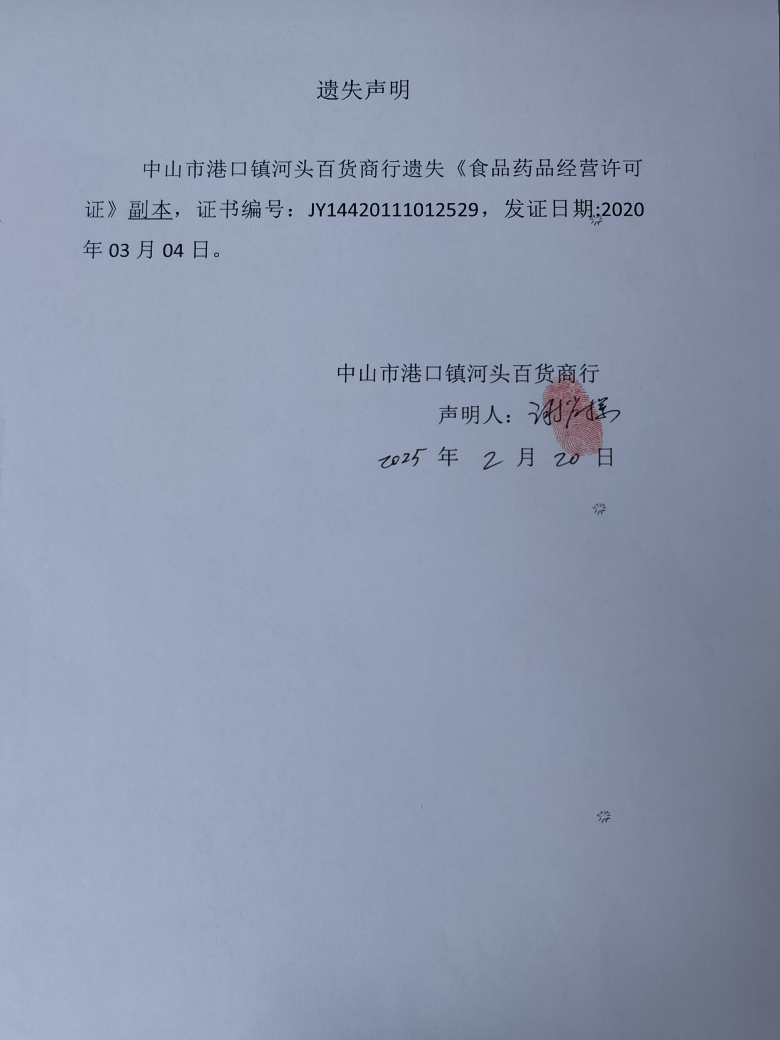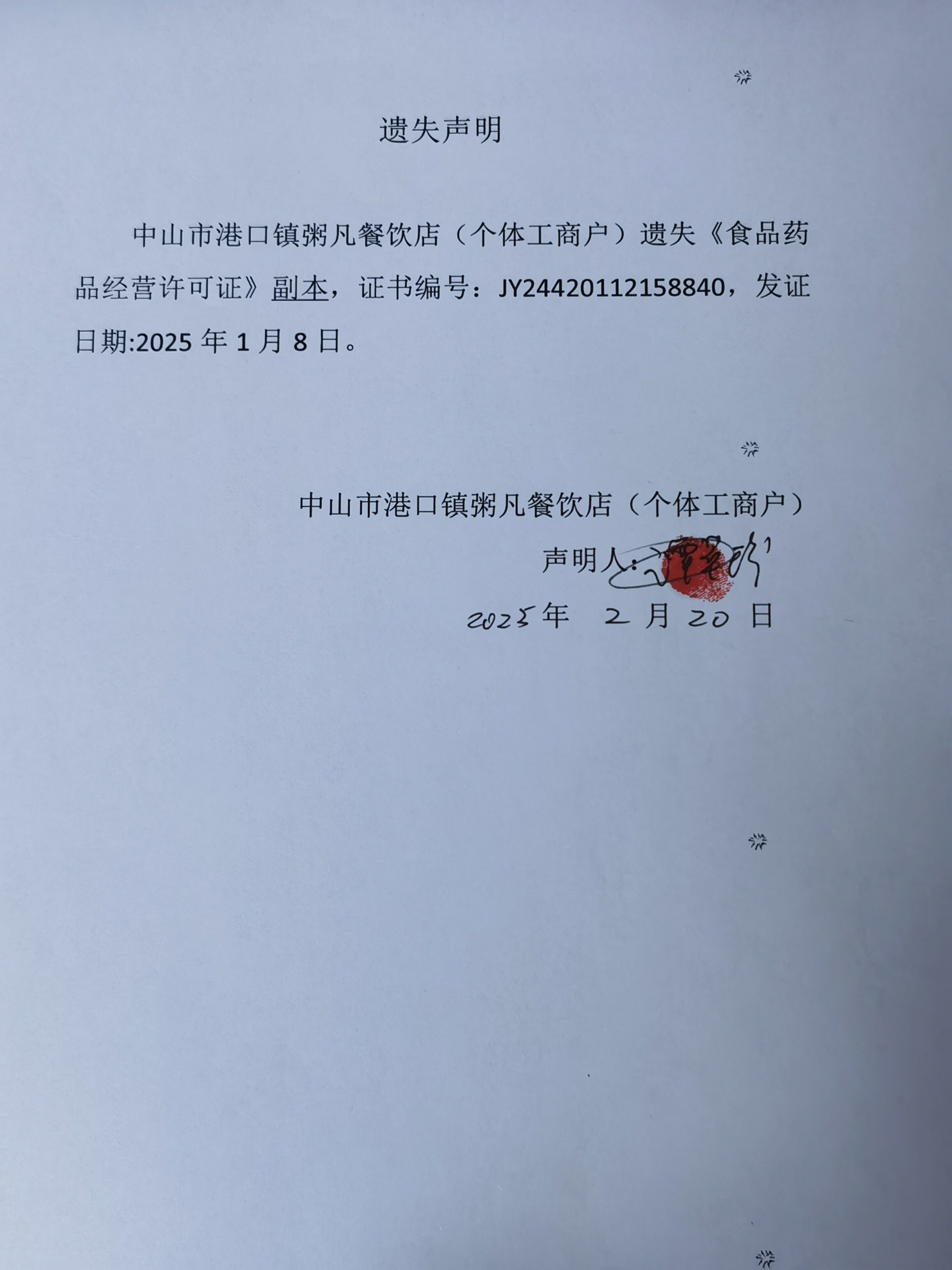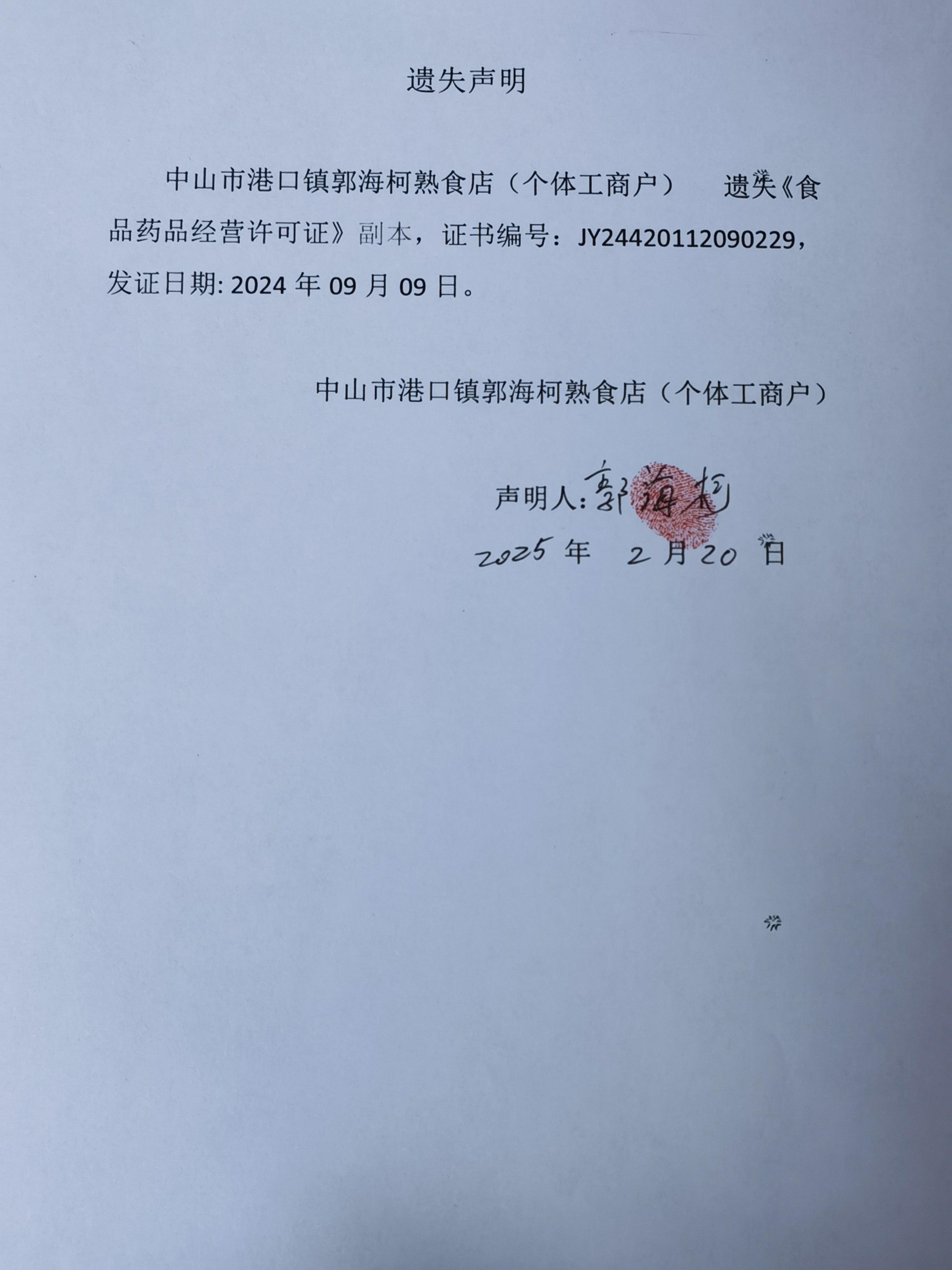 食品药品经营许可证遗失声明【中山市港口镇粥凡餐饮店(个体工商户)、中山市港口镇郭海柯熟食店(个体工商户)、中山市港口镇河头百货商行】