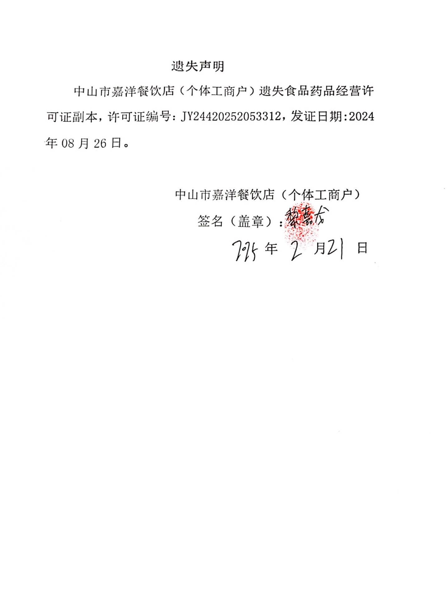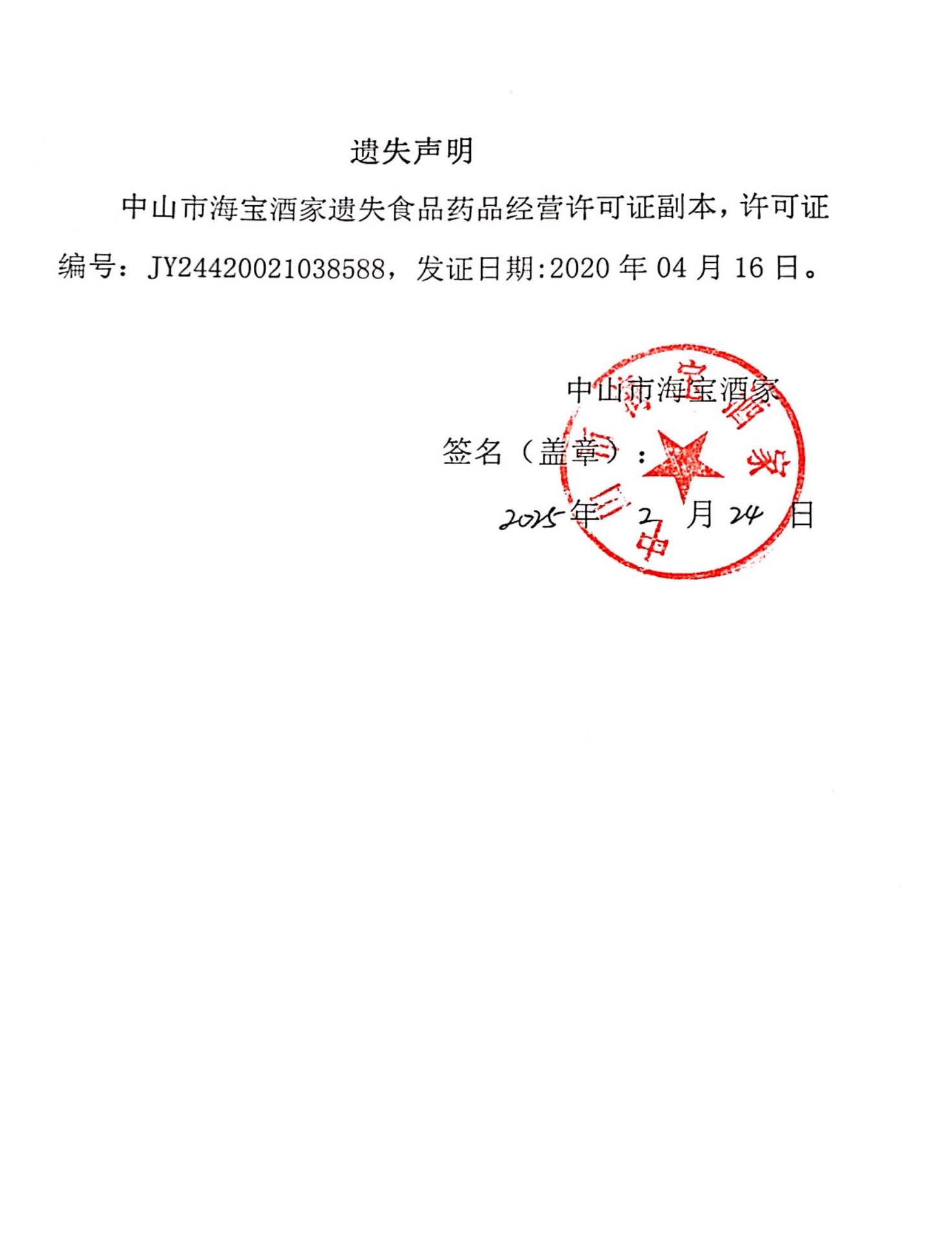食品药品经营许可证遗失声明【中山市嘉洋餐饮店(个体工商户)、中山市海宝酒家】