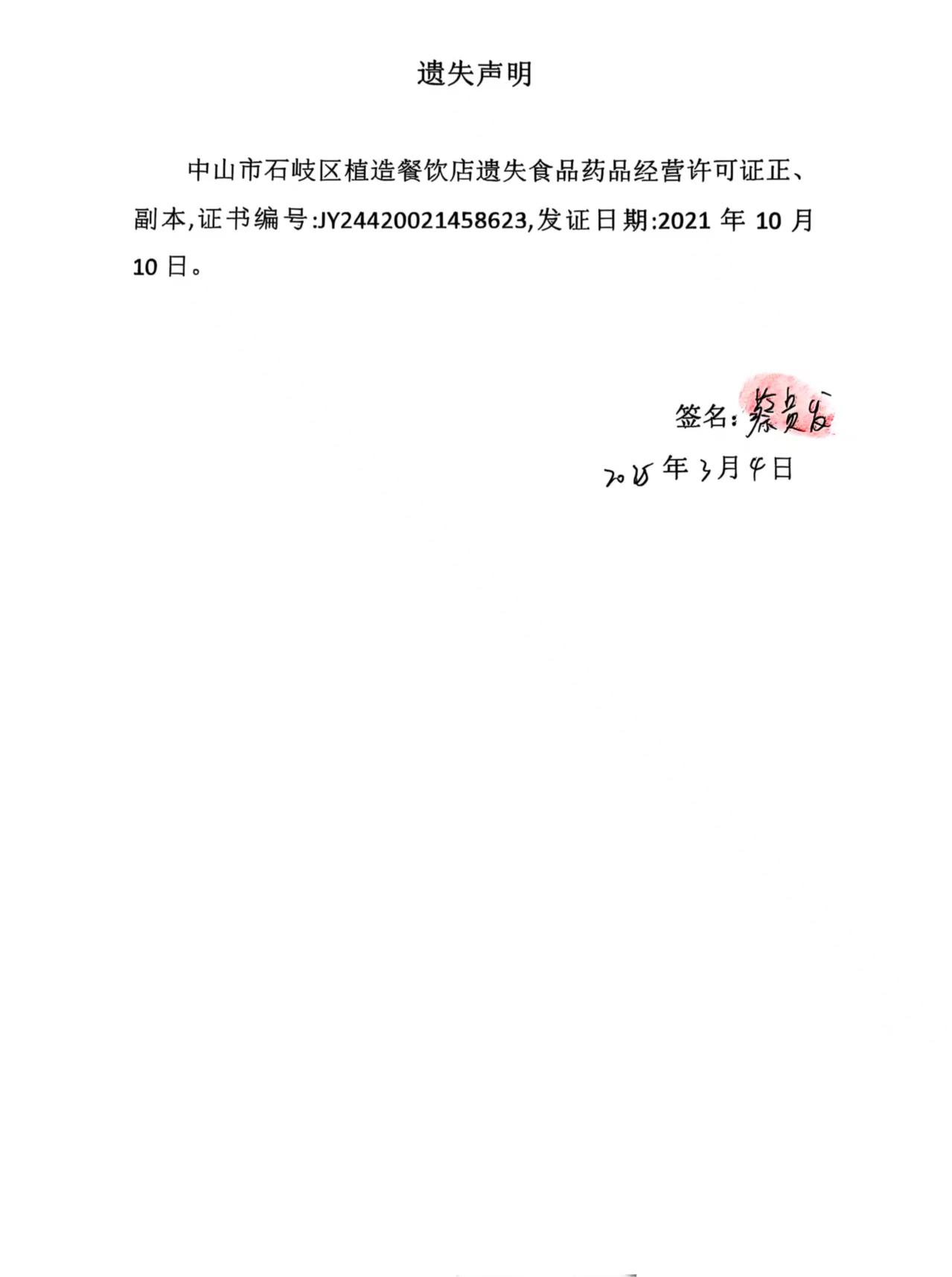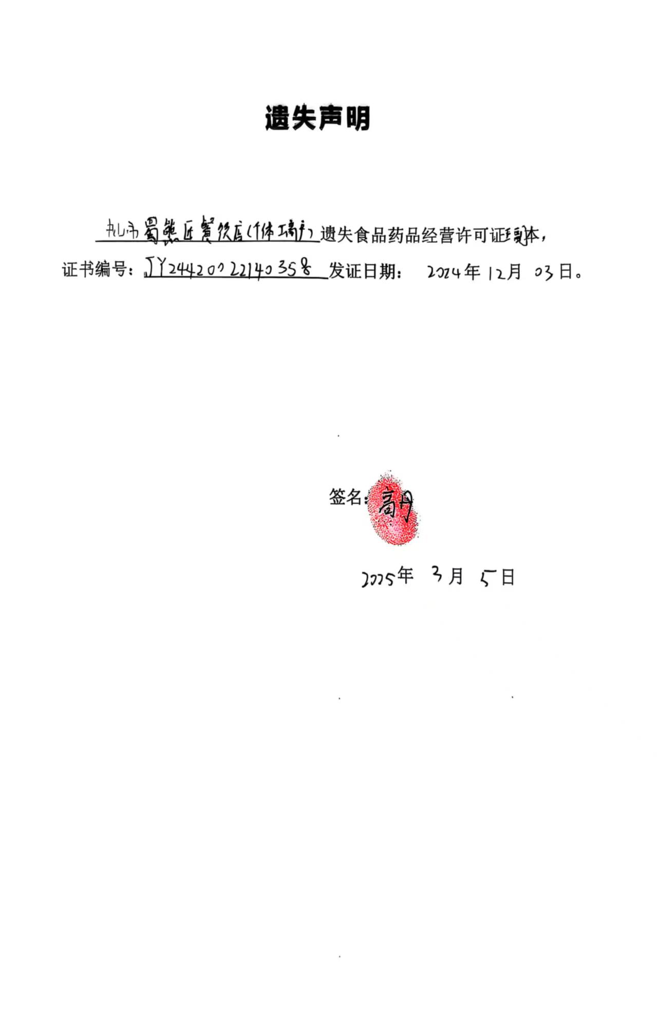 食品药品经营许可证遗失声明【中山市蜀熊匠餐饮店(个体工商户)、中山市石岐区植造餐饮店(个体工商户)】
