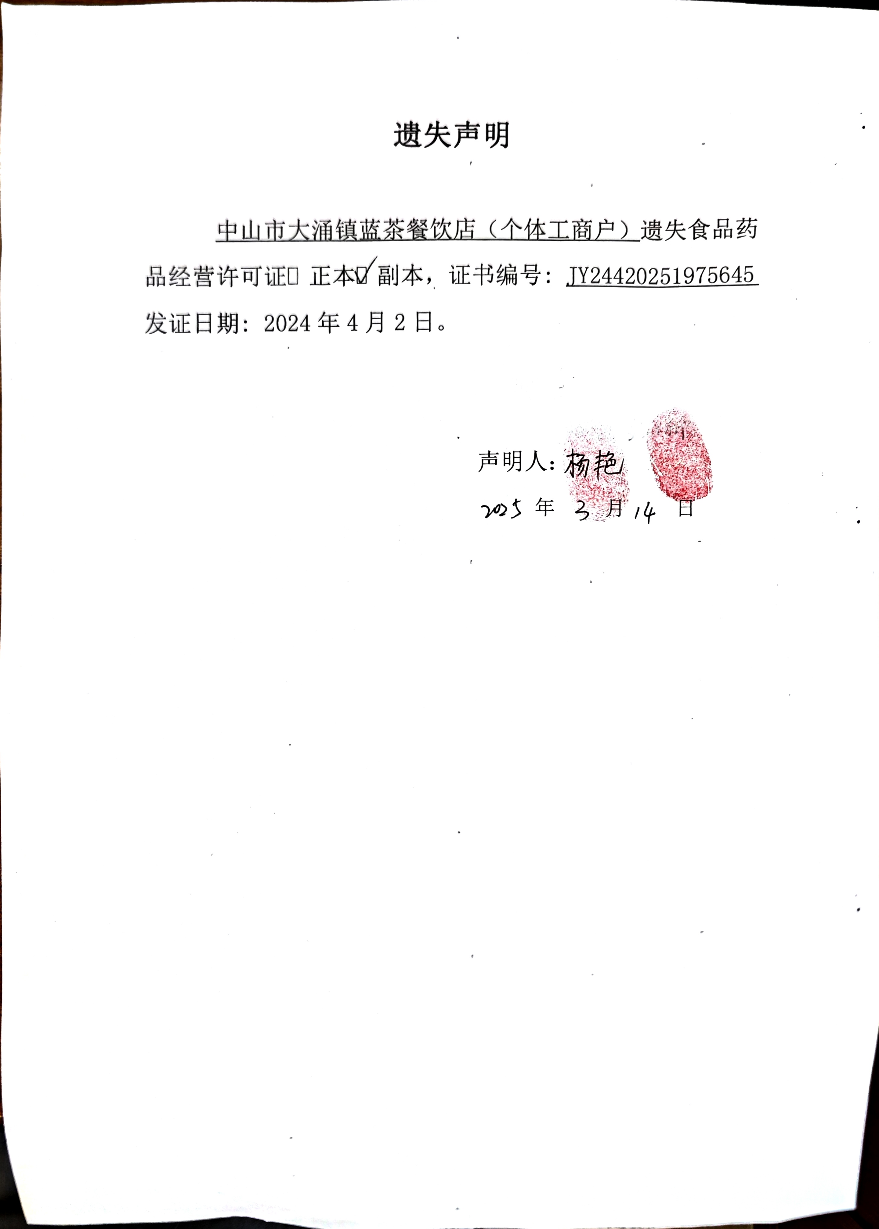 食品药品经营许可证遗失声明【中山市大涌镇蓝茶餐饮店(个体工商户)】