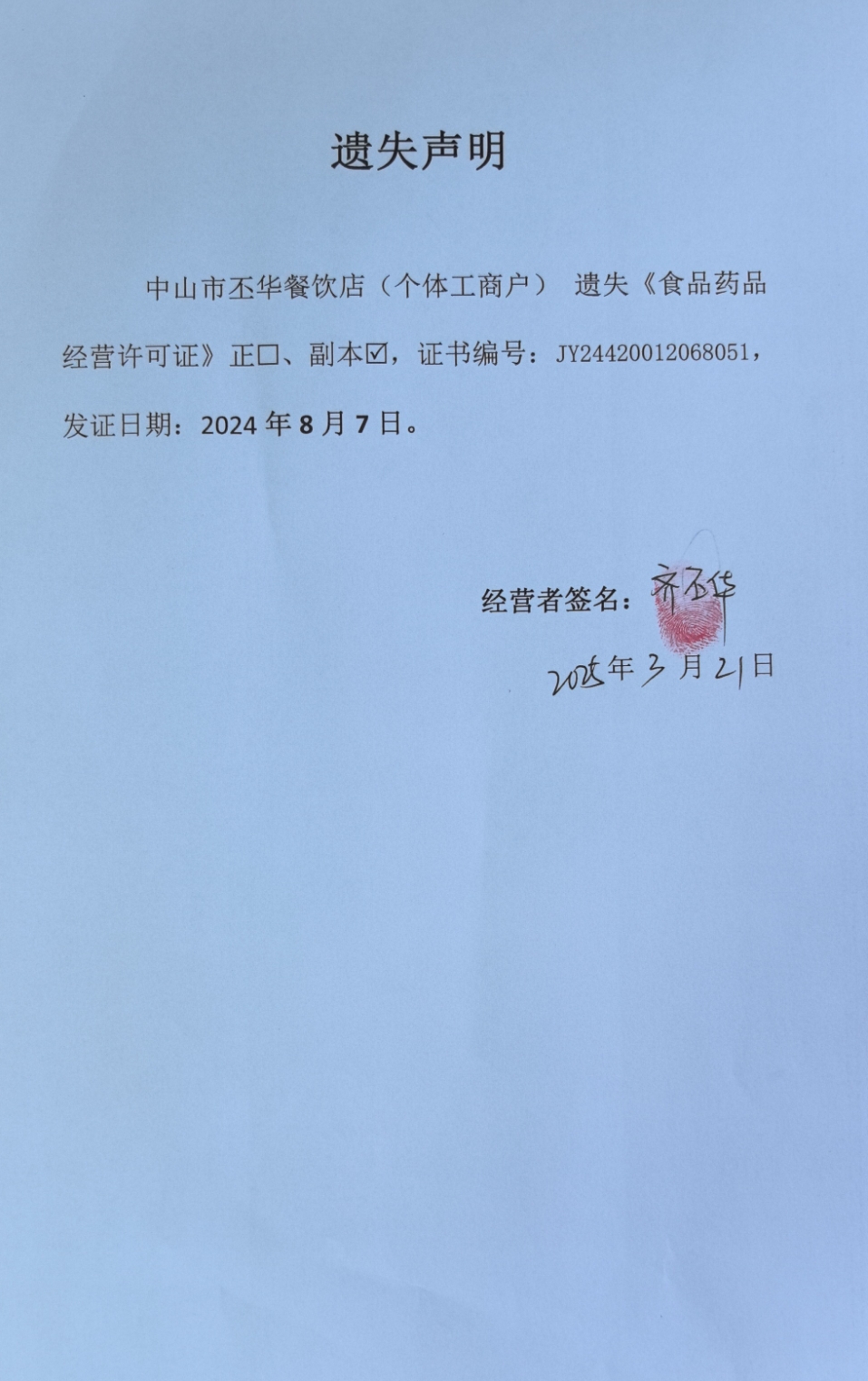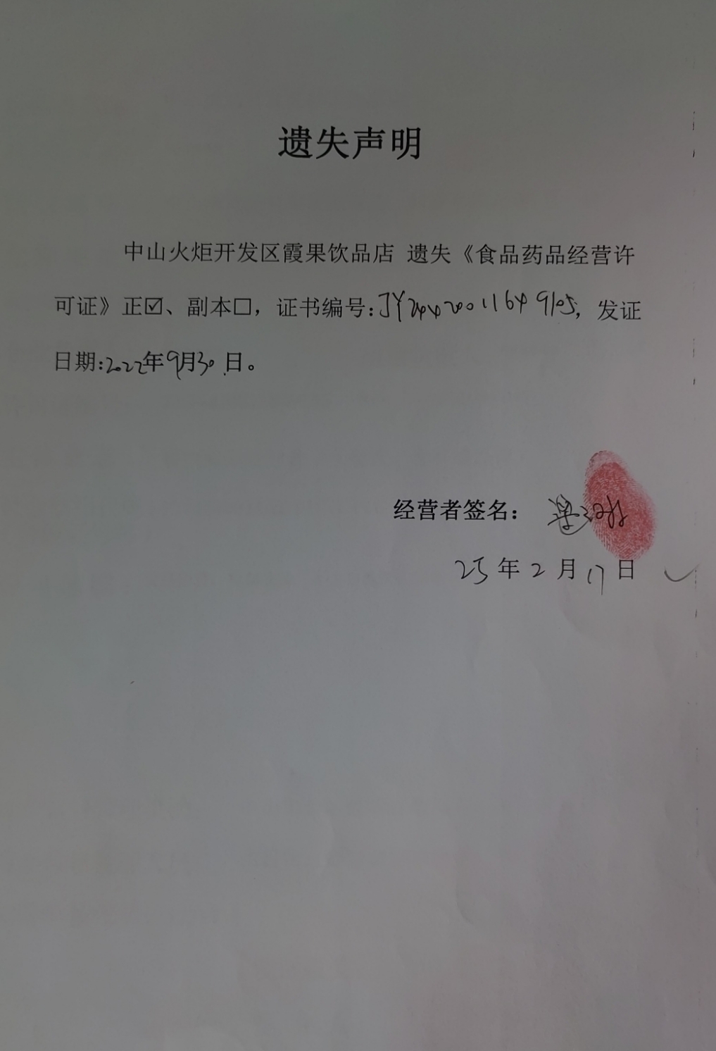 食品药品经营许可证遗失声明【中山火炬开发区霞果饮品店、中山市丕华餐饮店(个体工商户)、中山火炬开发区碧绿山庄餐馆】