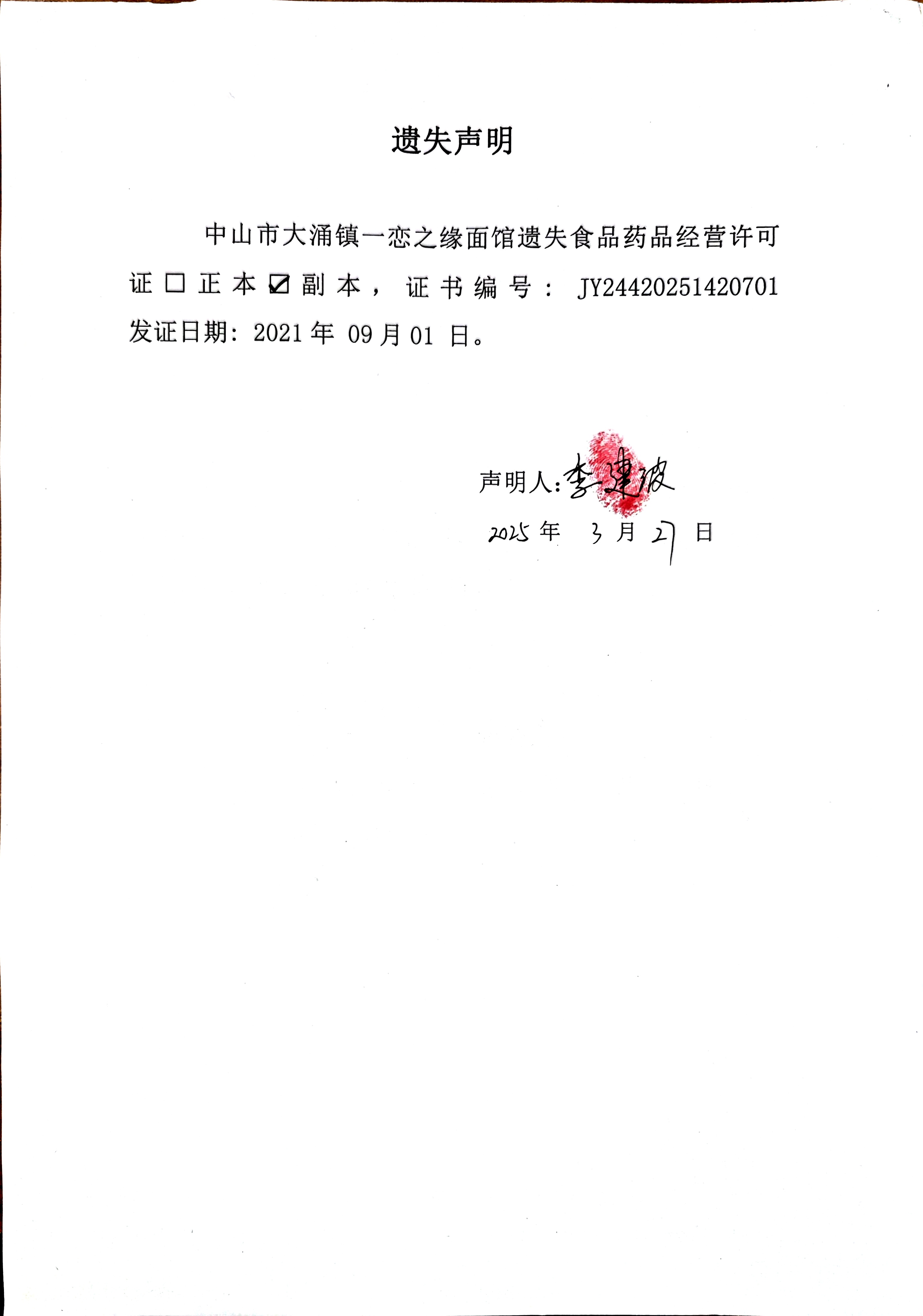 食品药品经营许可证遗失声明(中山市大涌镇一恋之缘面馆)