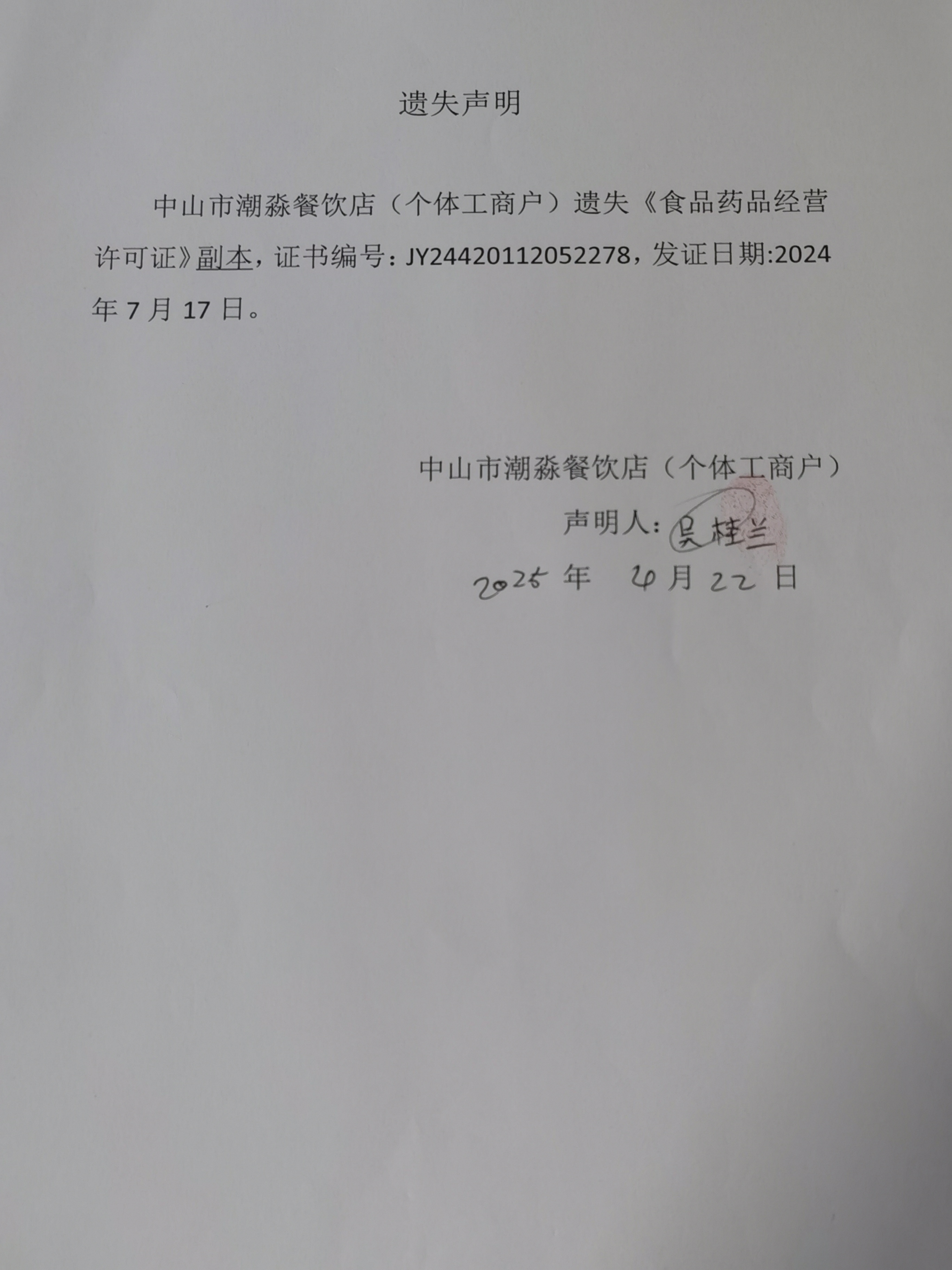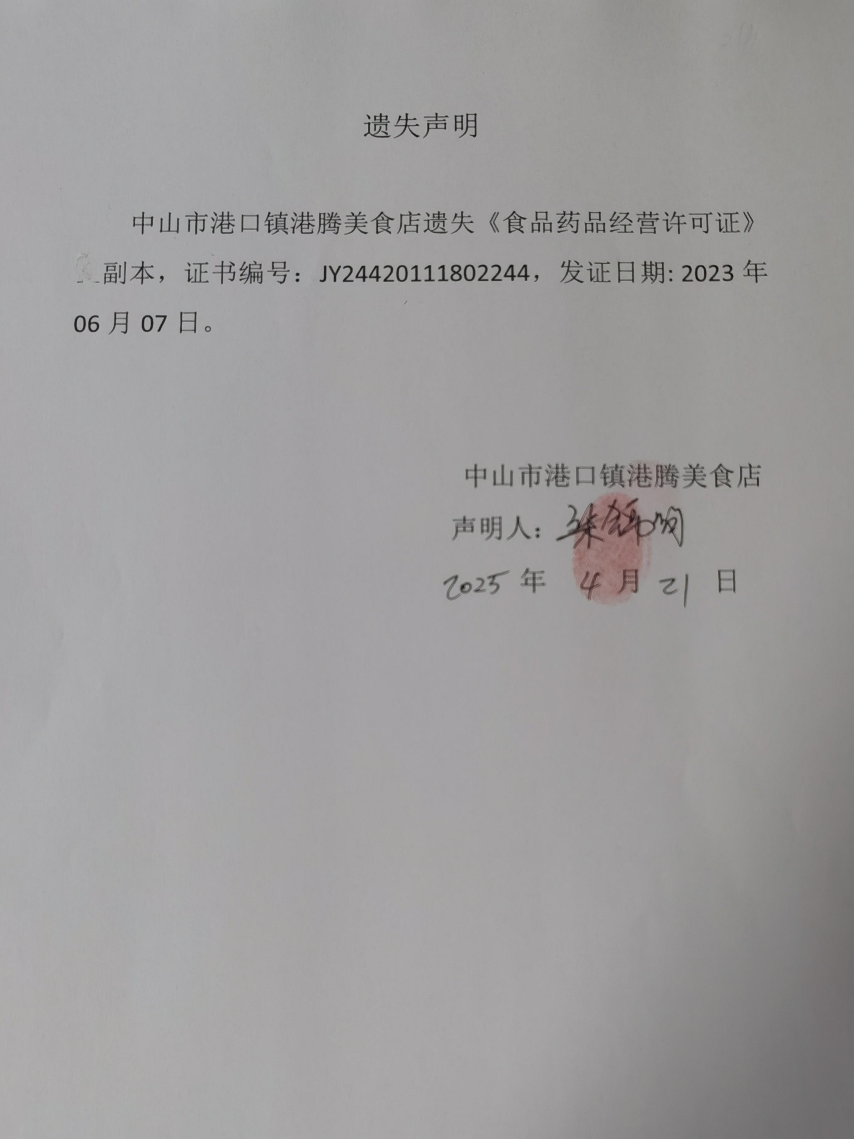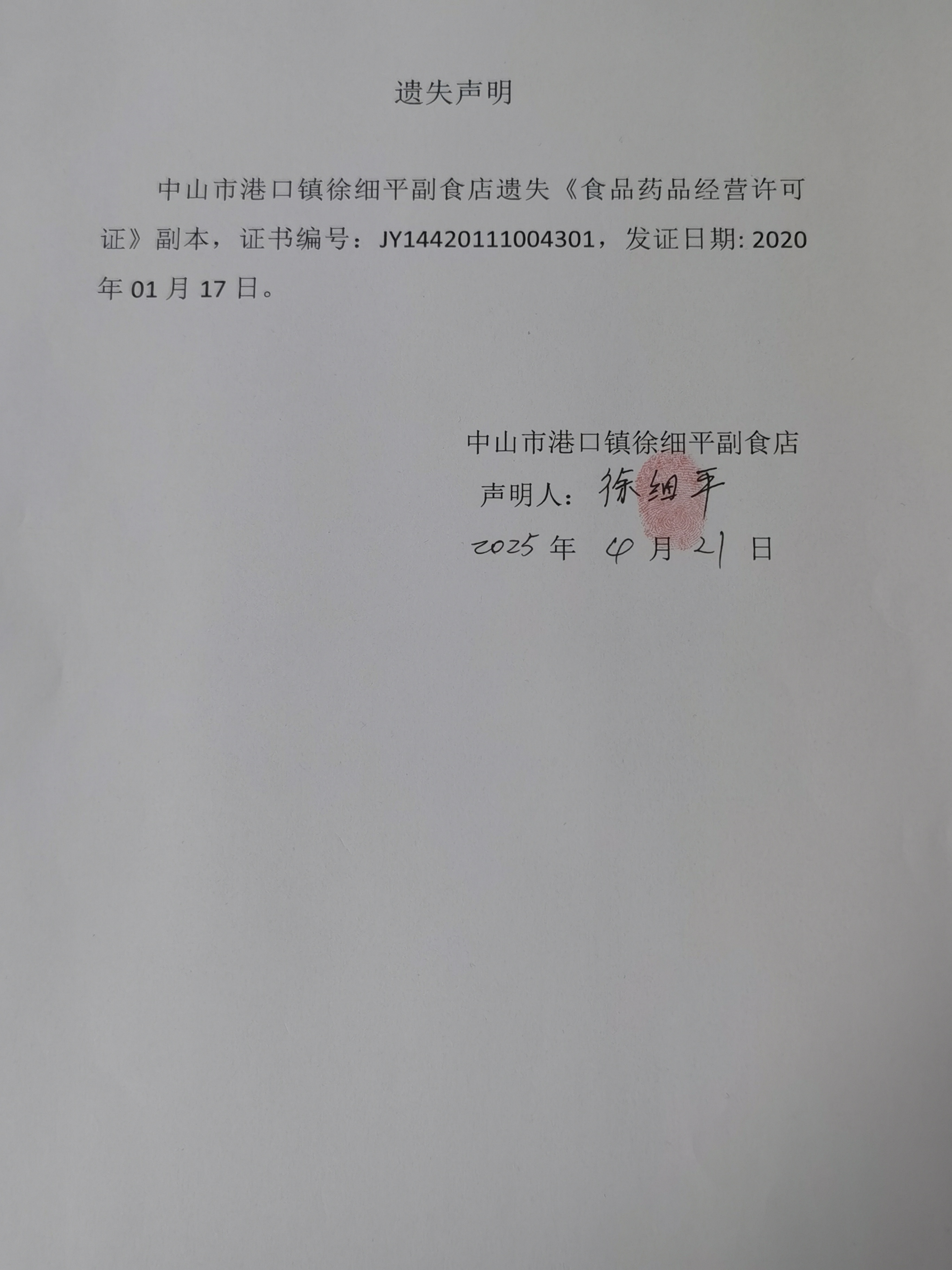 食品药品经营许可证遗失声明【中山市港口镇徐细平副食店、中山市潮淼餐饮店(个体工商户)、中山市港口镇港腾美食店】