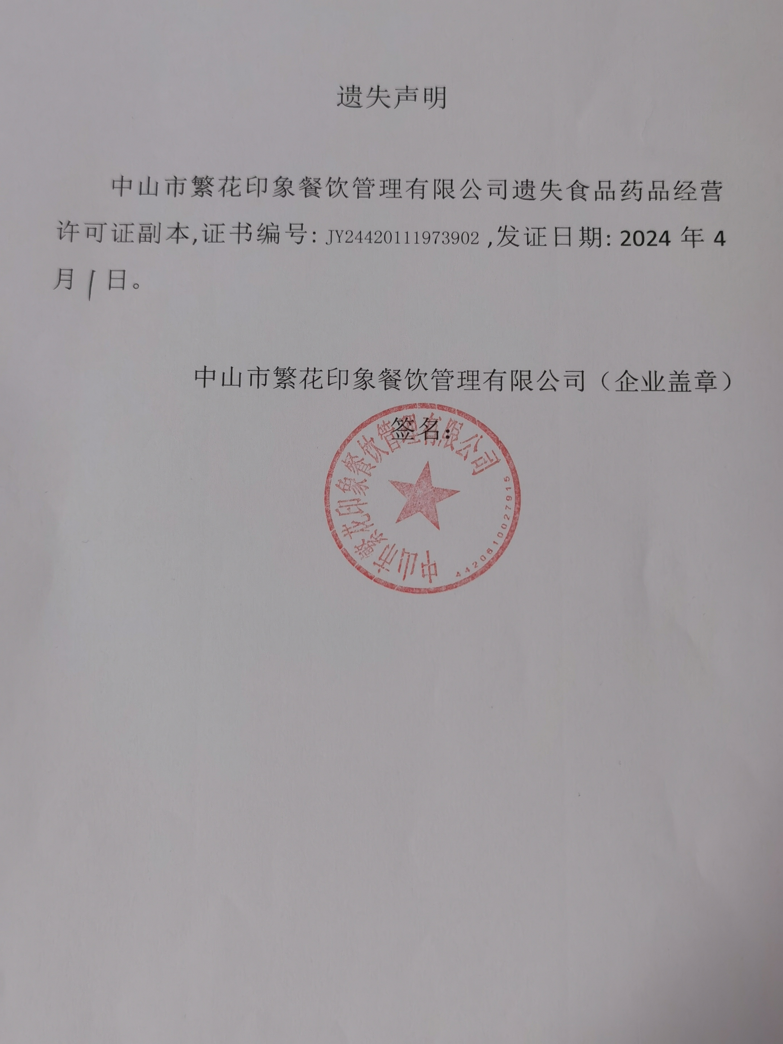 食品药品经营许可证遗失声明【中山市繁花印象餐饮管理有限公司、中山市港口镇夏古餐饮店(个体工商户)】