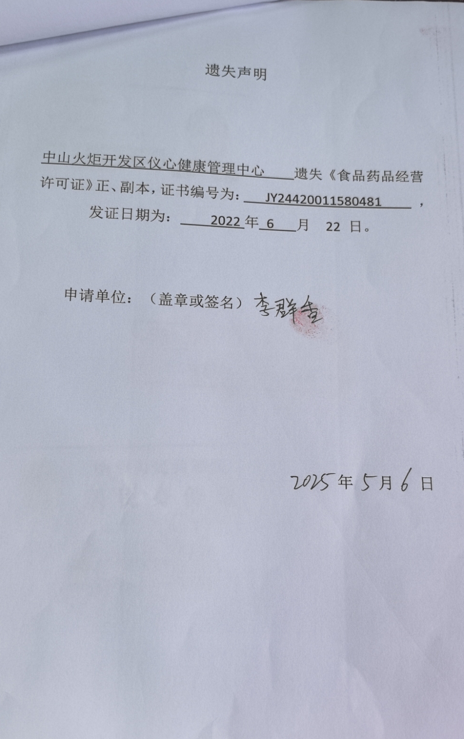 食品药品经营许可证遗失声明(中山火炬开发区仪心健康管理中心)