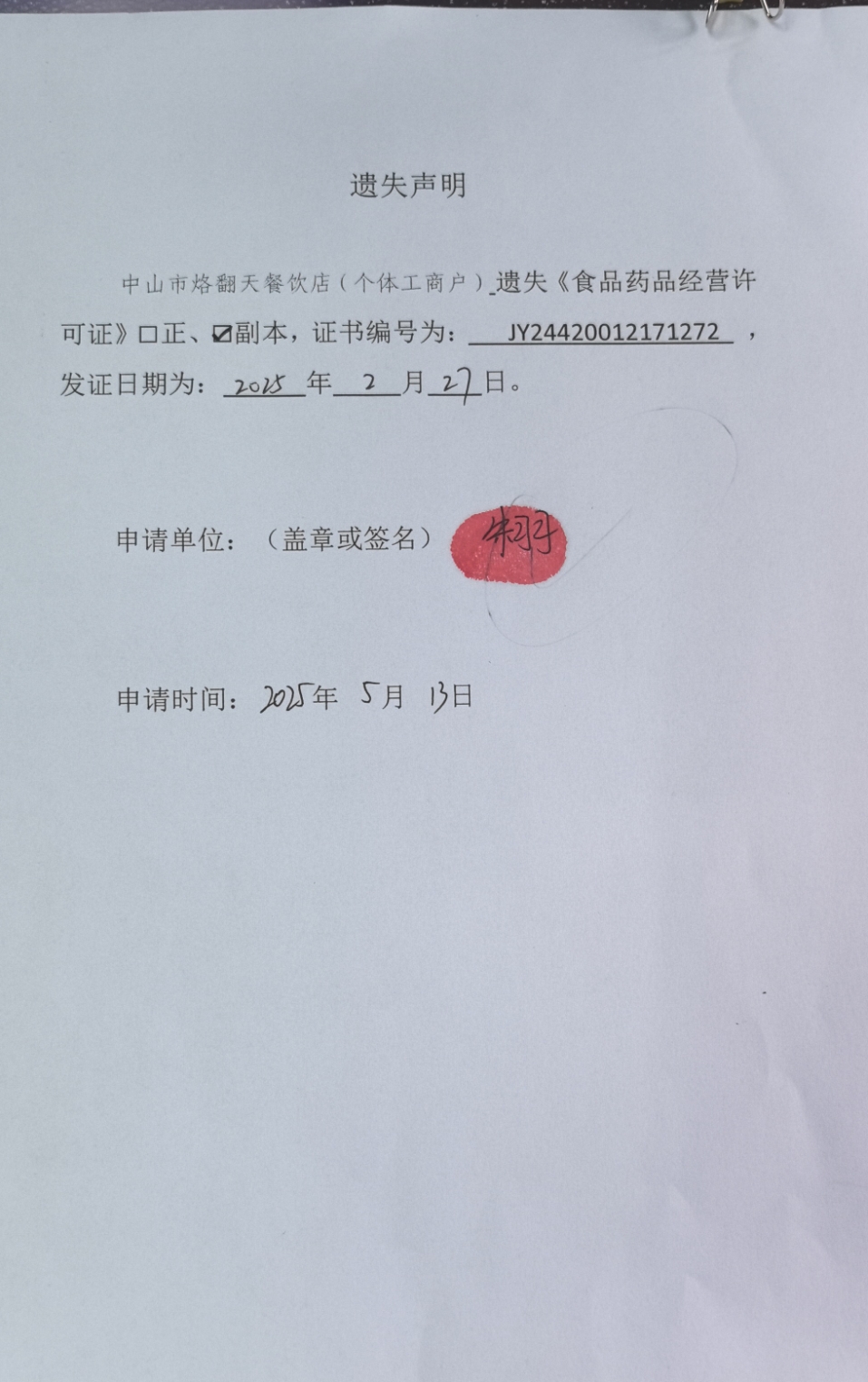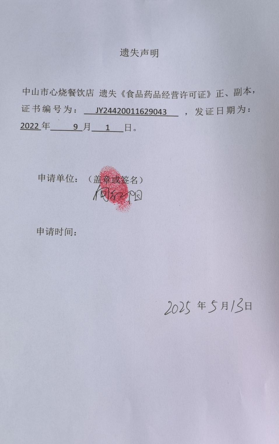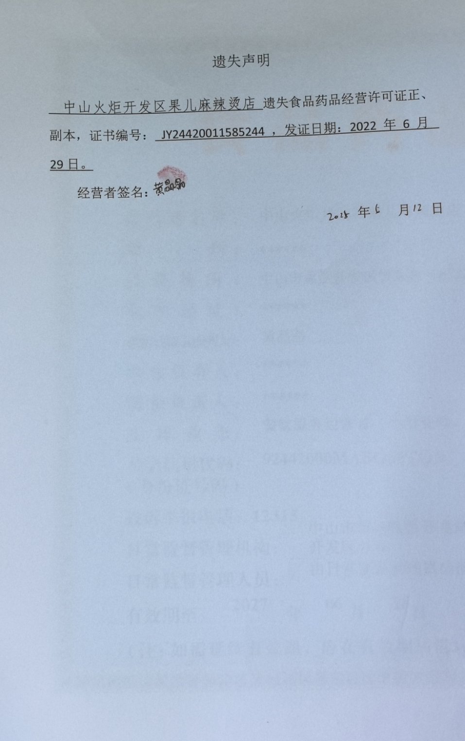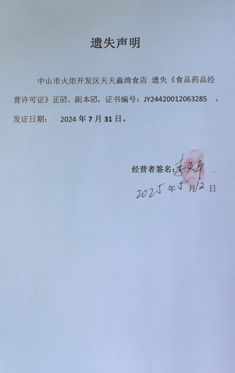 食品药品经营许可证遗失声明【中山市心烧餐饮店、中山市烙翻天餐饮店(个体工商户)、中山火炬开发区果儿麻辣烫店、中山市火炬开发区天天淼湾食店(个体工商户)】