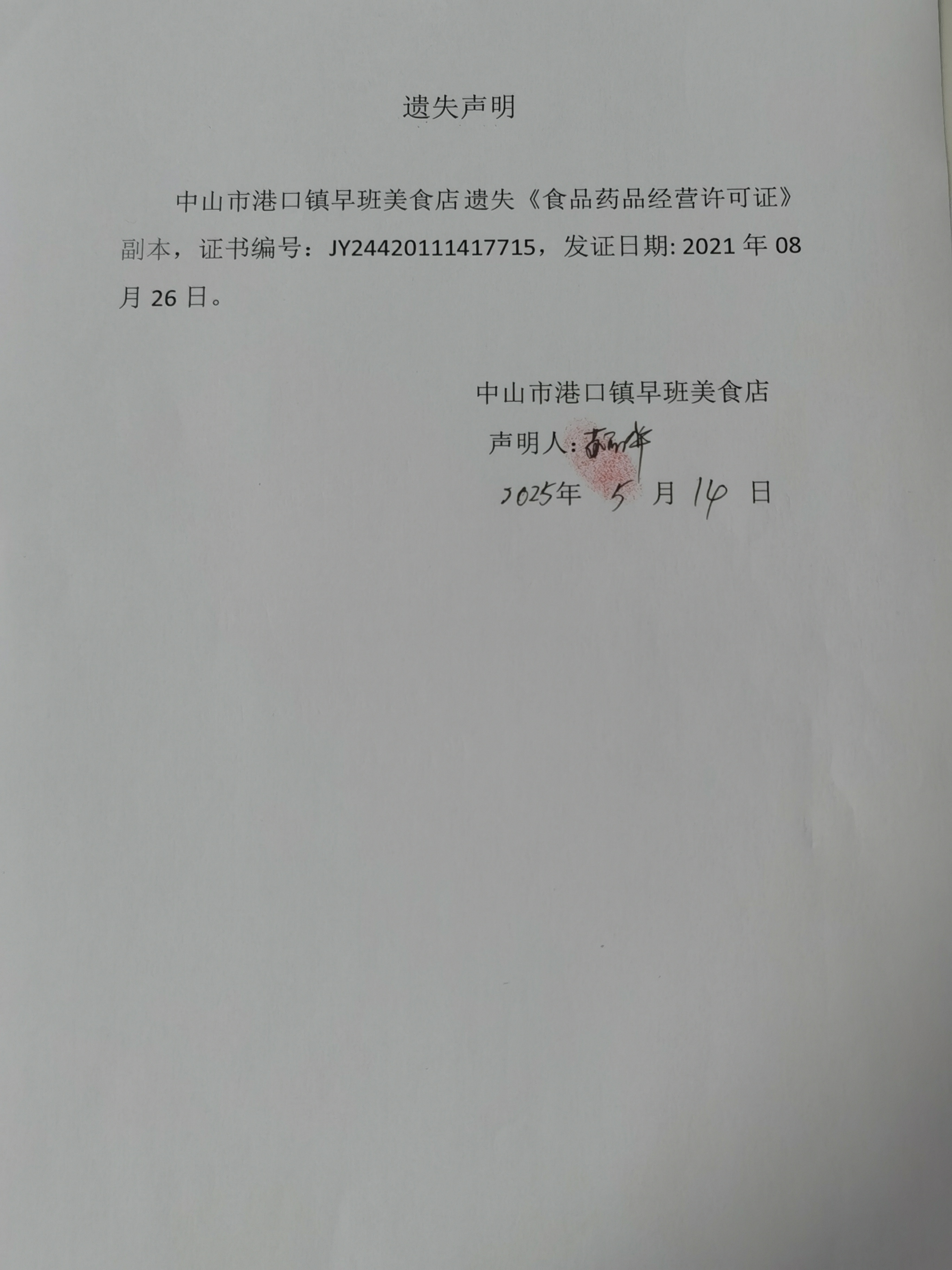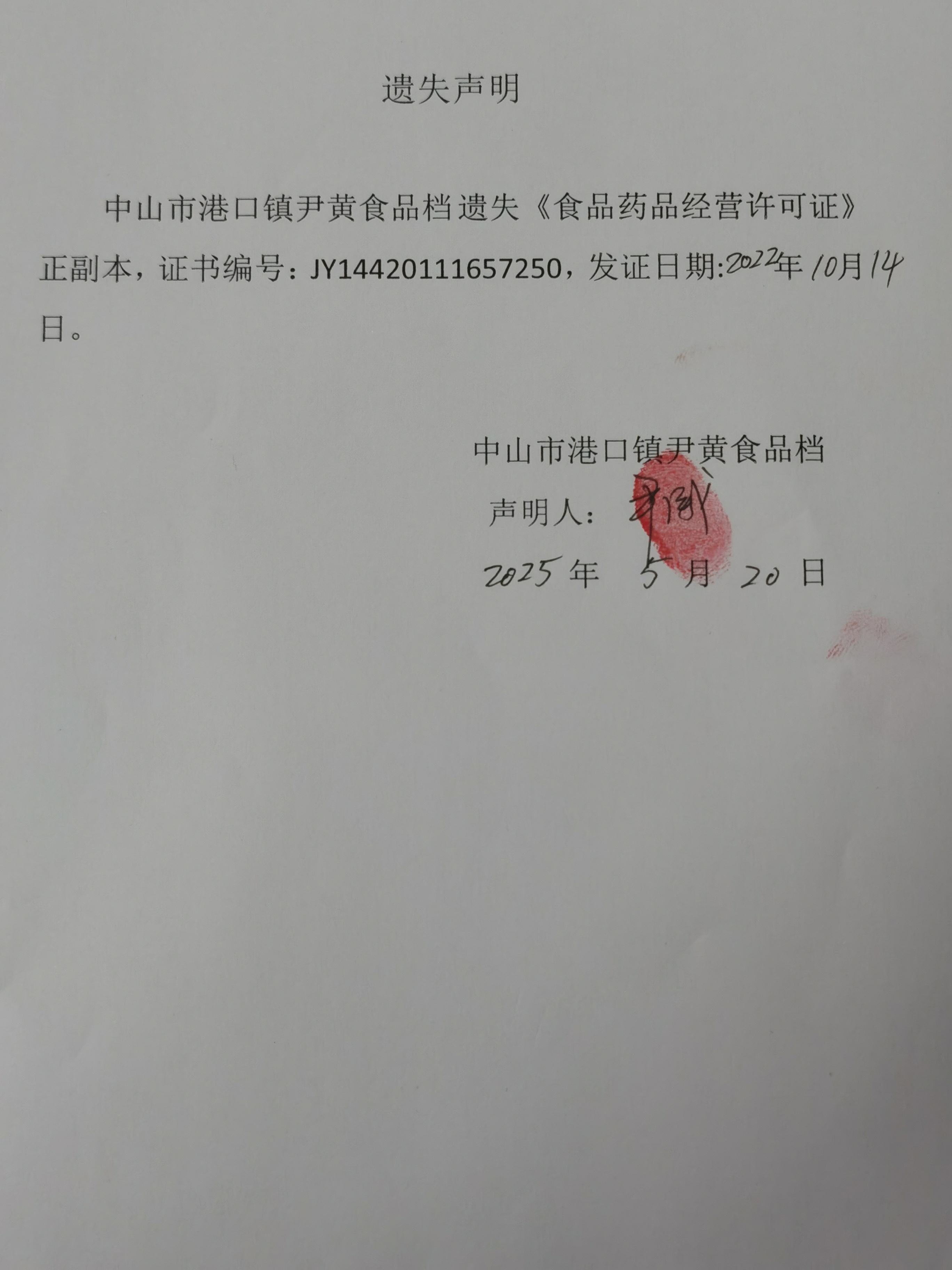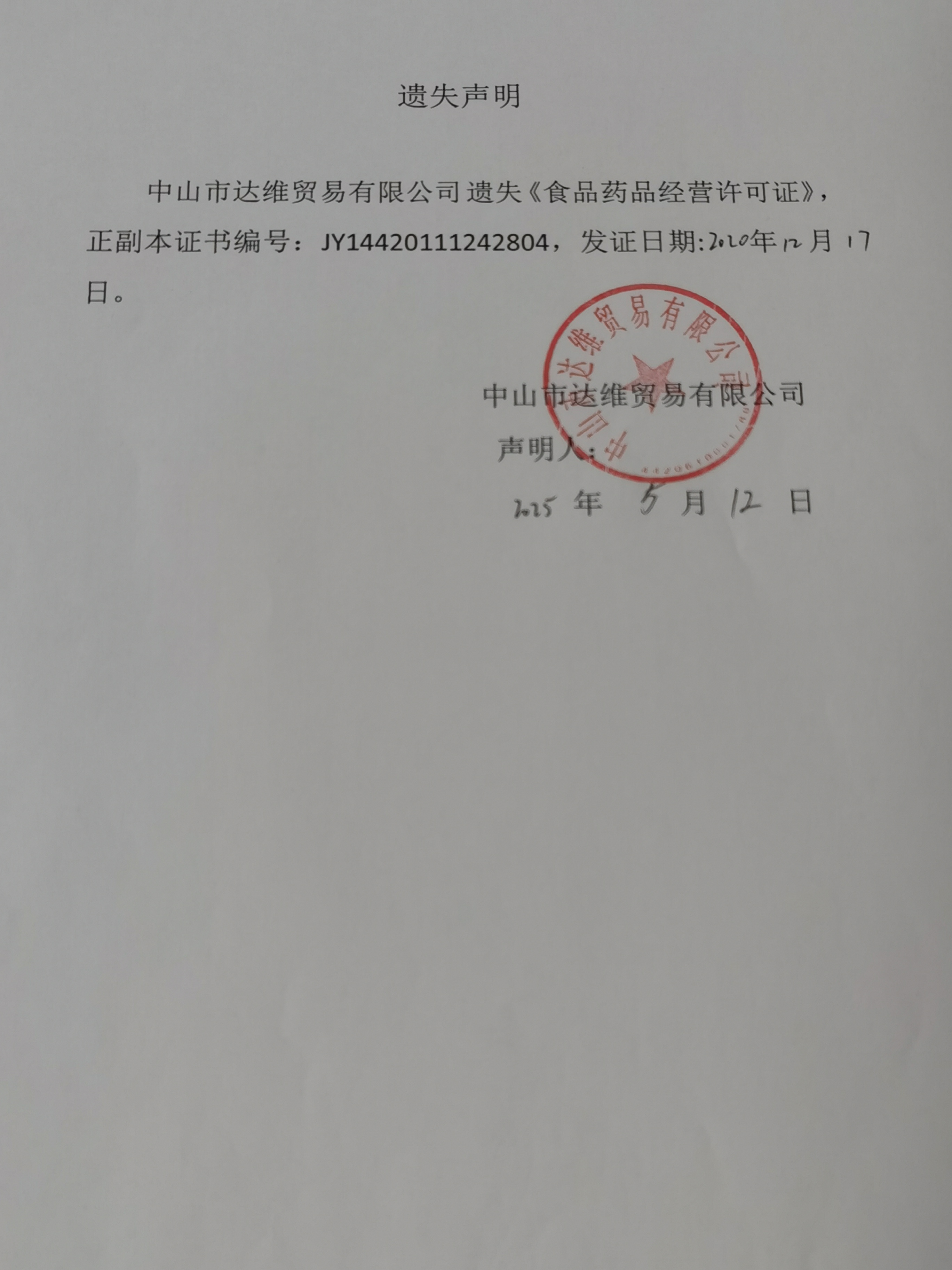 食品药品经营许可证遗失声明(中山市达维贸易有限公司、中山市雨林餐饮管理有限公司中山市港口民昌路分公司、中山市港口镇早班美食店、中山市港口镇明初百货商行、中山市港口镇尹黄食品档)