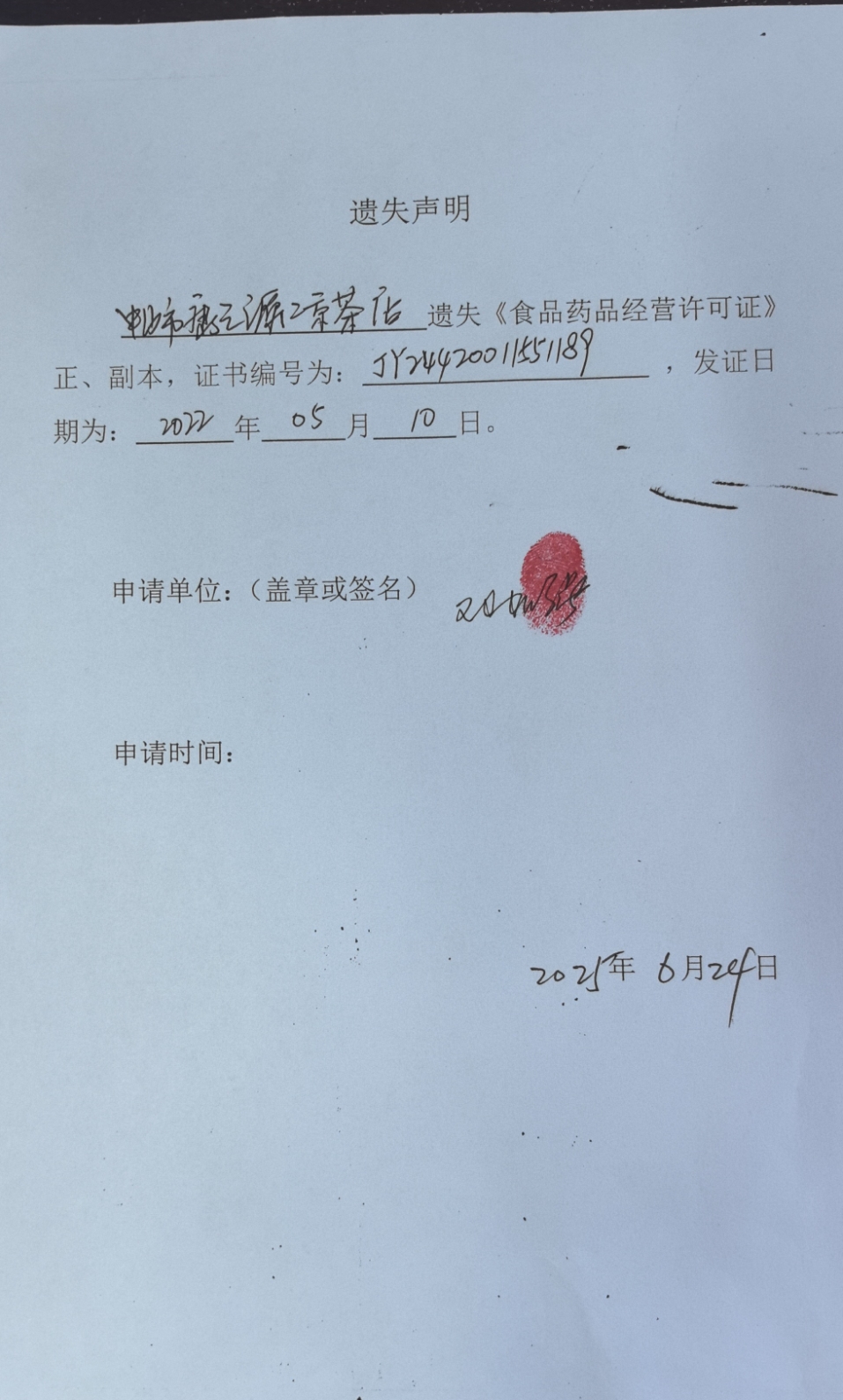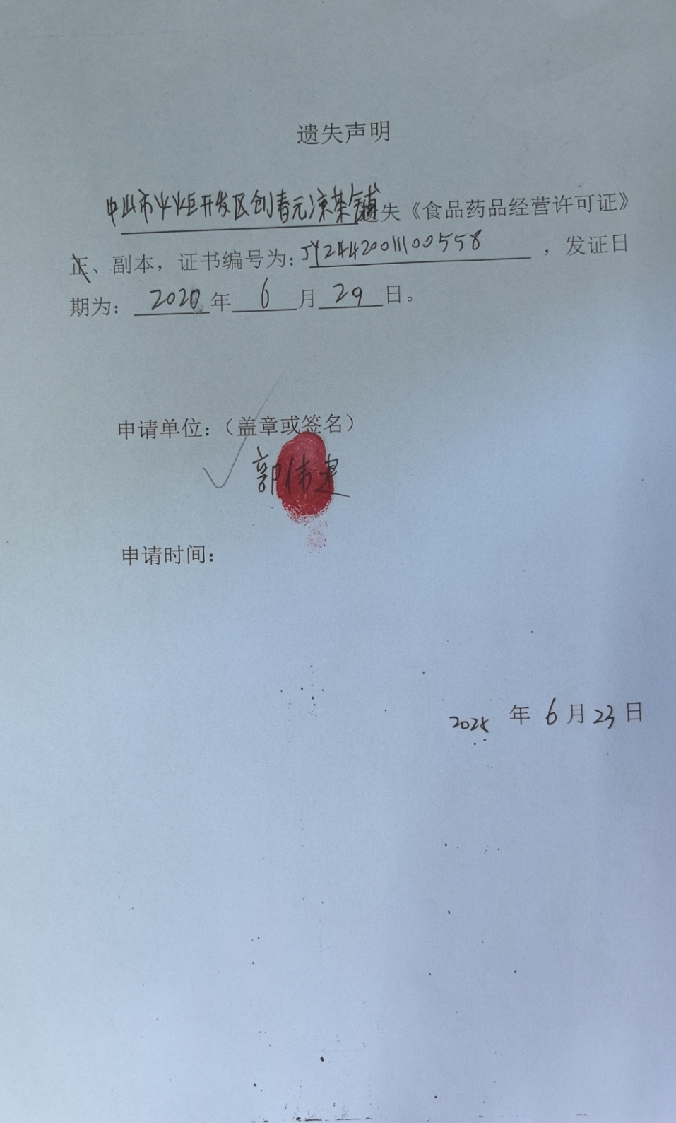 食品药品经营许可证遗失声明(中山火炬开发区金垌熟食档、中山市火炬开发区创春元凉茶铺、中山市康之源凉茶店)