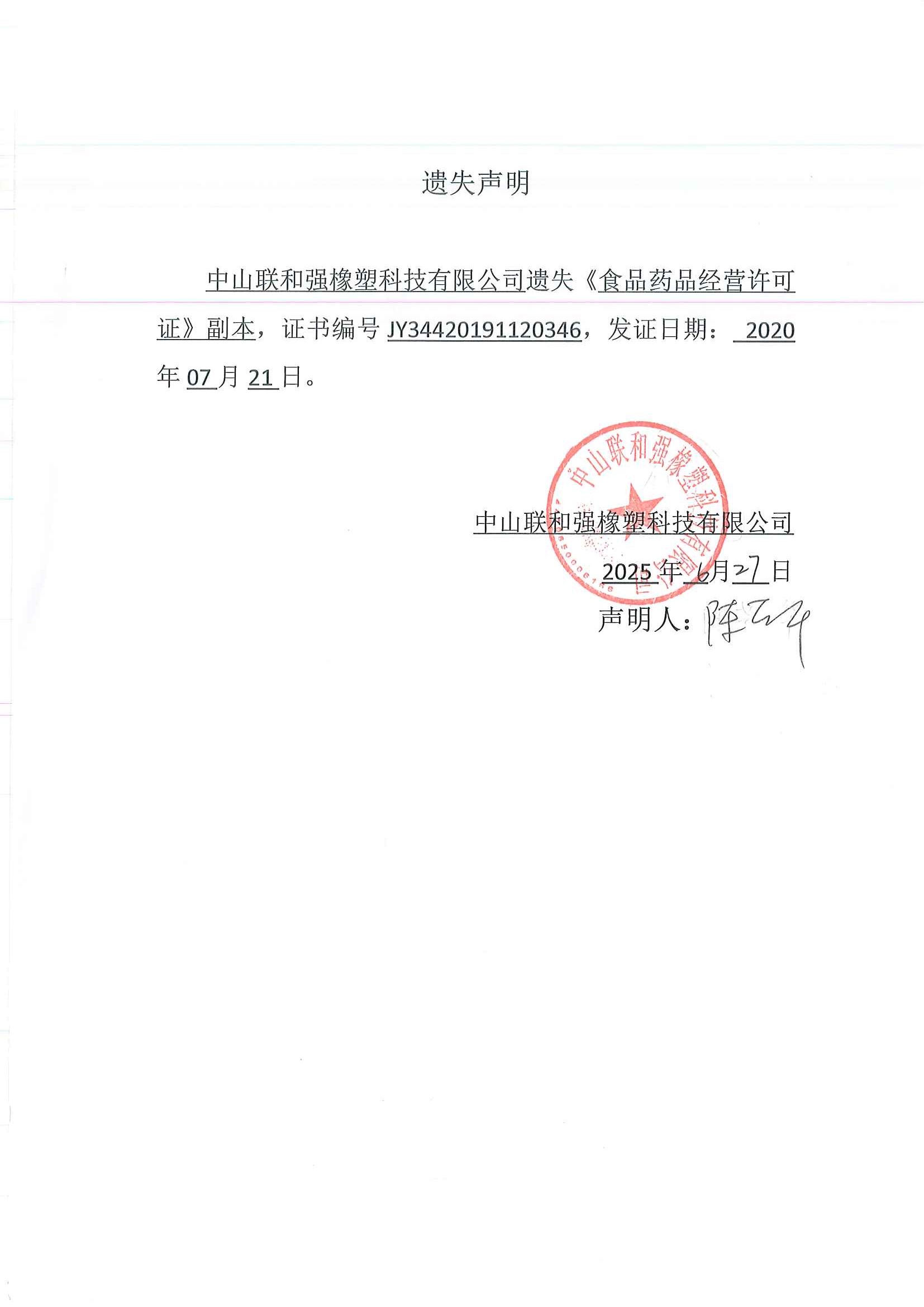 食品药品经营许可证遗失声明(中山联和强橡塑科技有限公司)