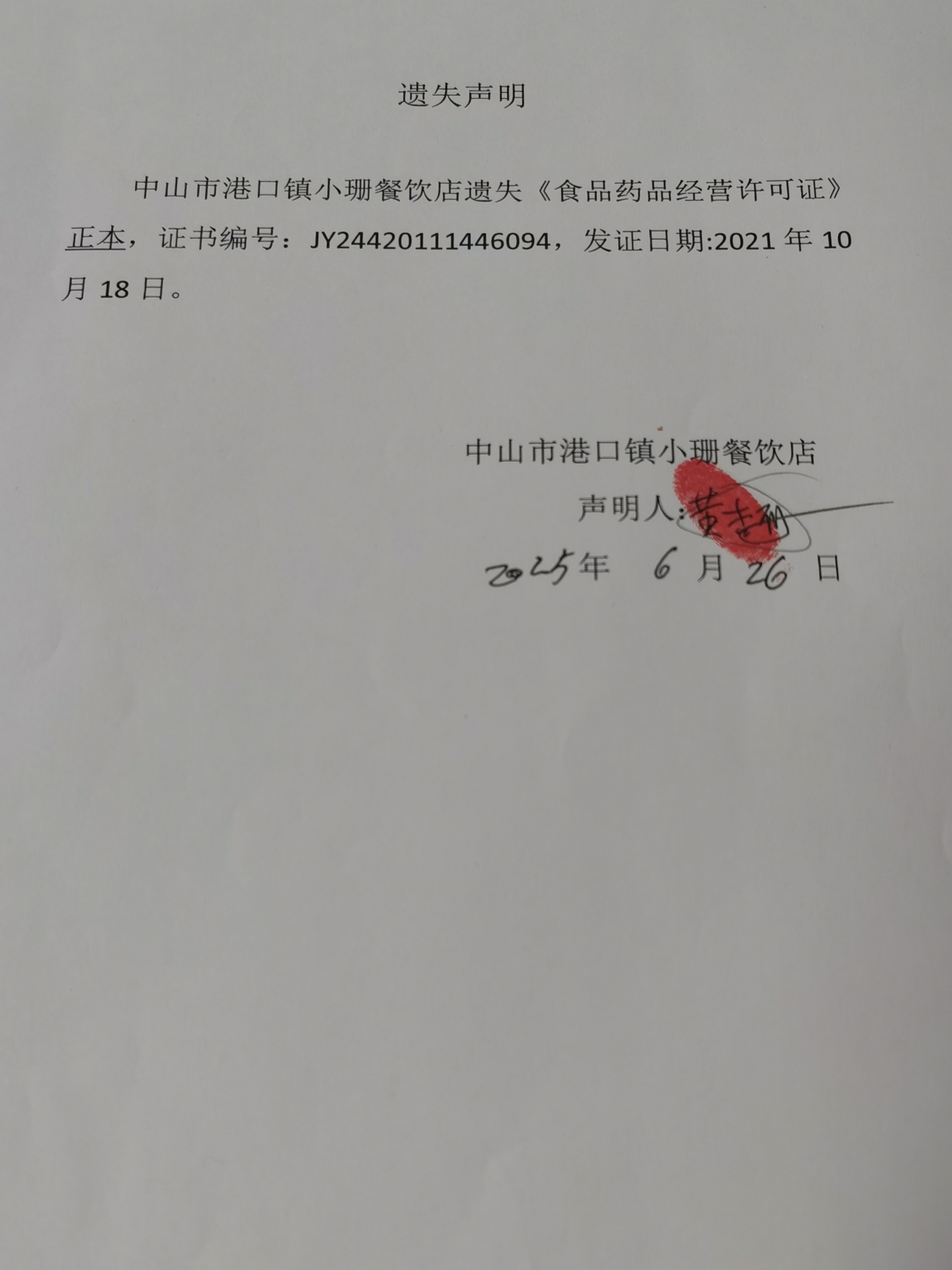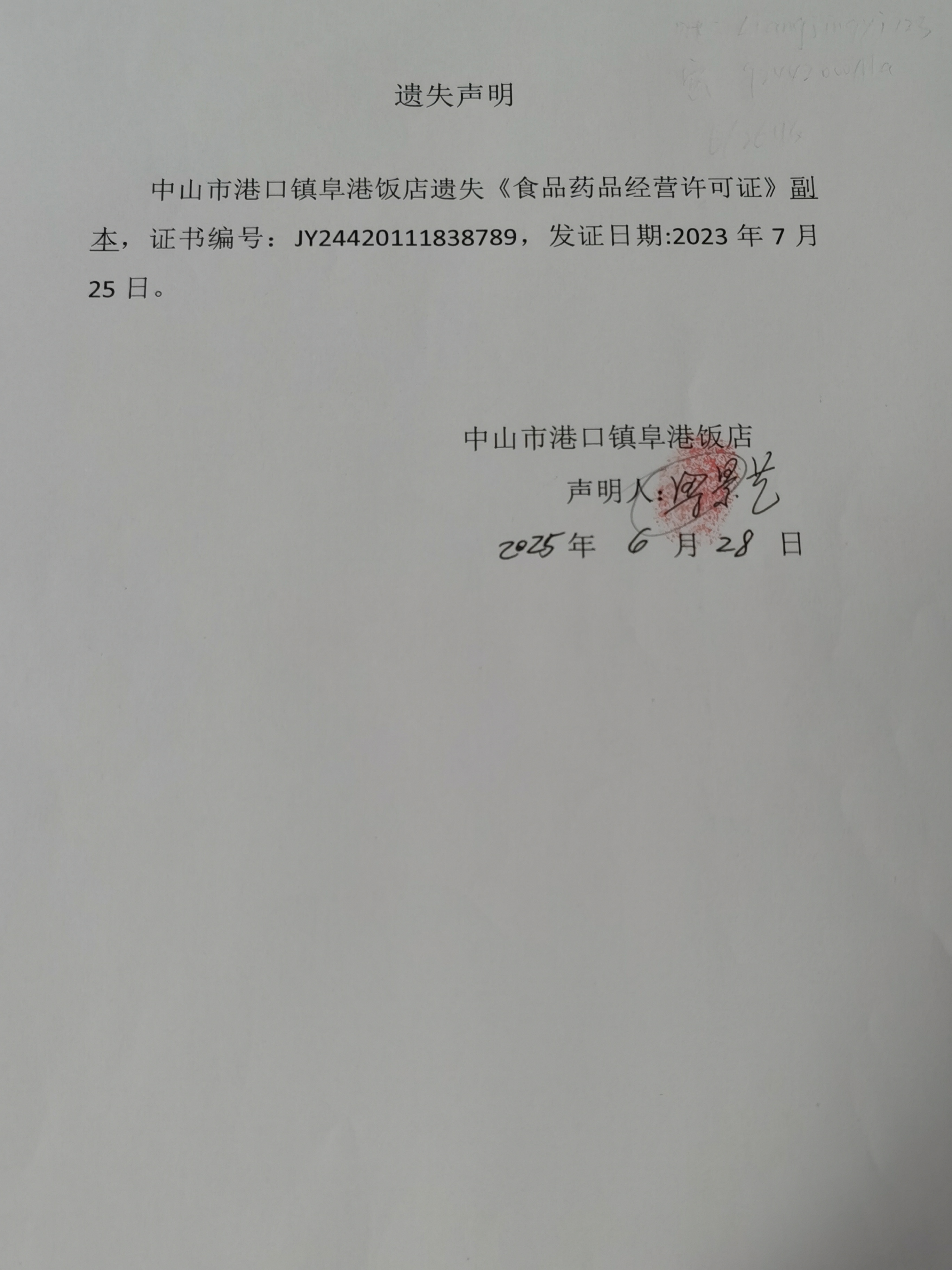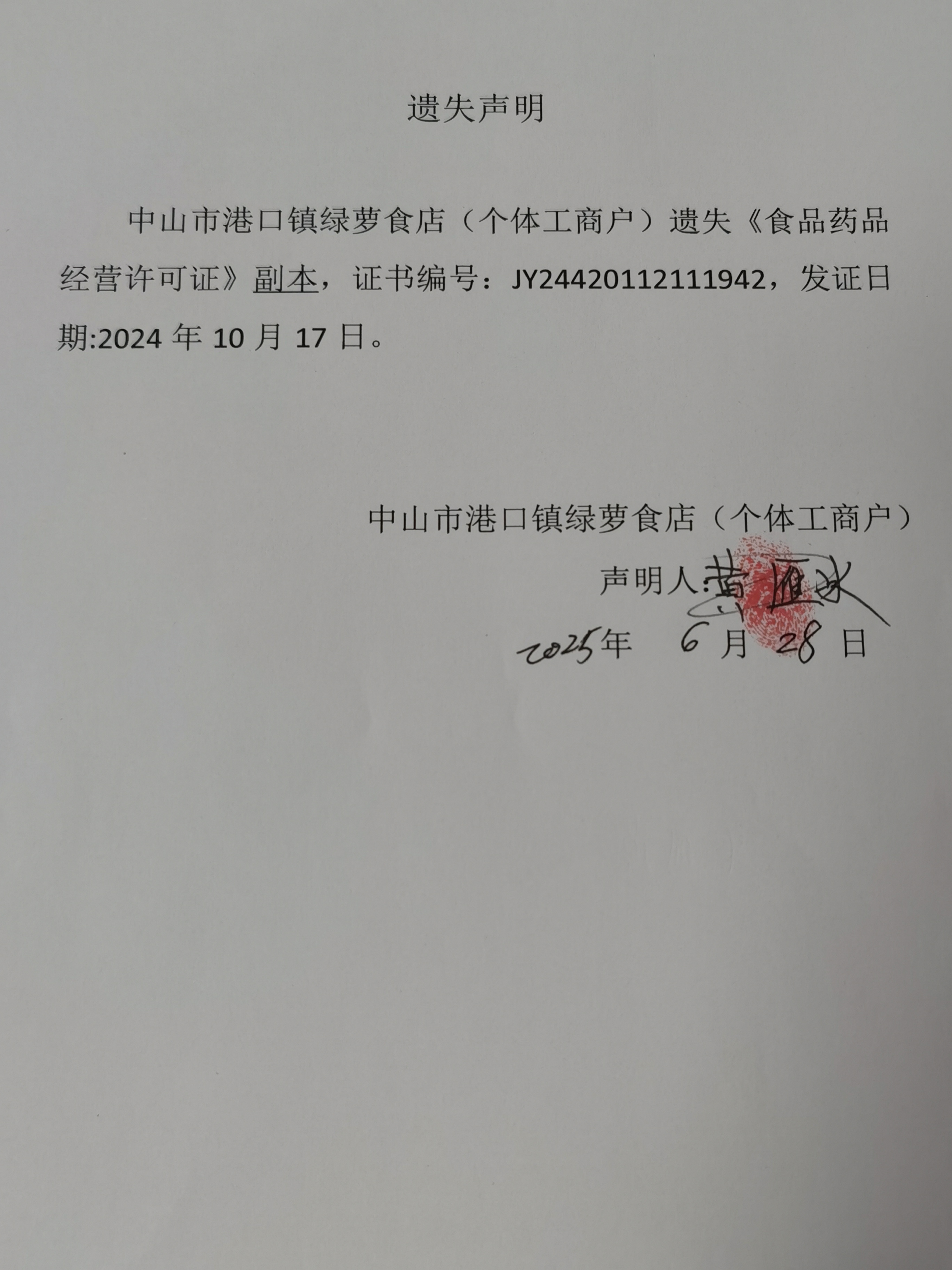食品药品经营许可证遗失声明【中山市浓眉哥餐饮店(个体工商户)、中山市港口镇小珊餐饮店、中山市港口镇邓亚二水果店(个体工商户)、中山市港口镇绿萝食店(个体工商户)、中山市港口镇阜港饭店】