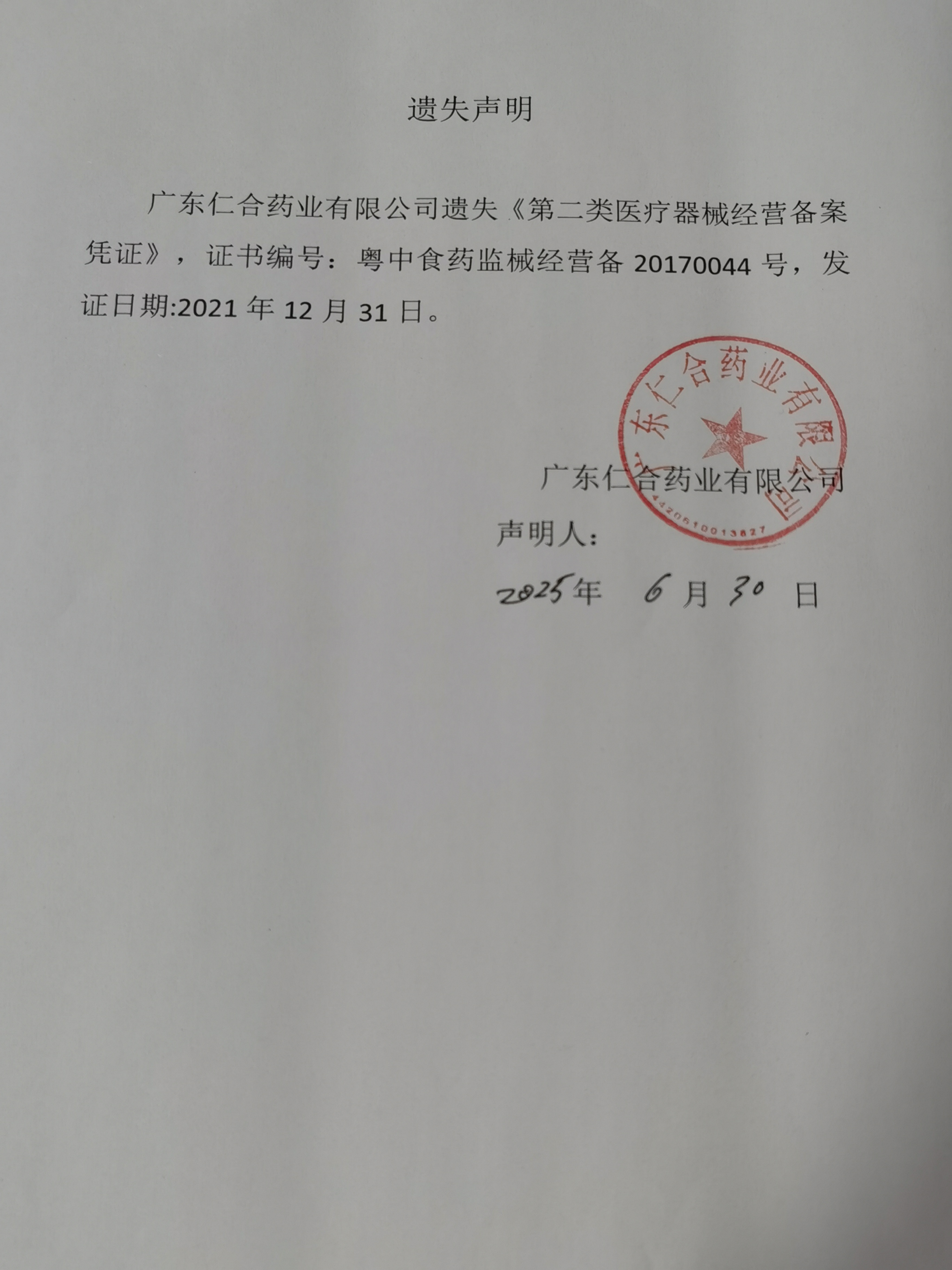第二类医疗器械经营备案凭证遗失声明(广东仁合药业有限公司)