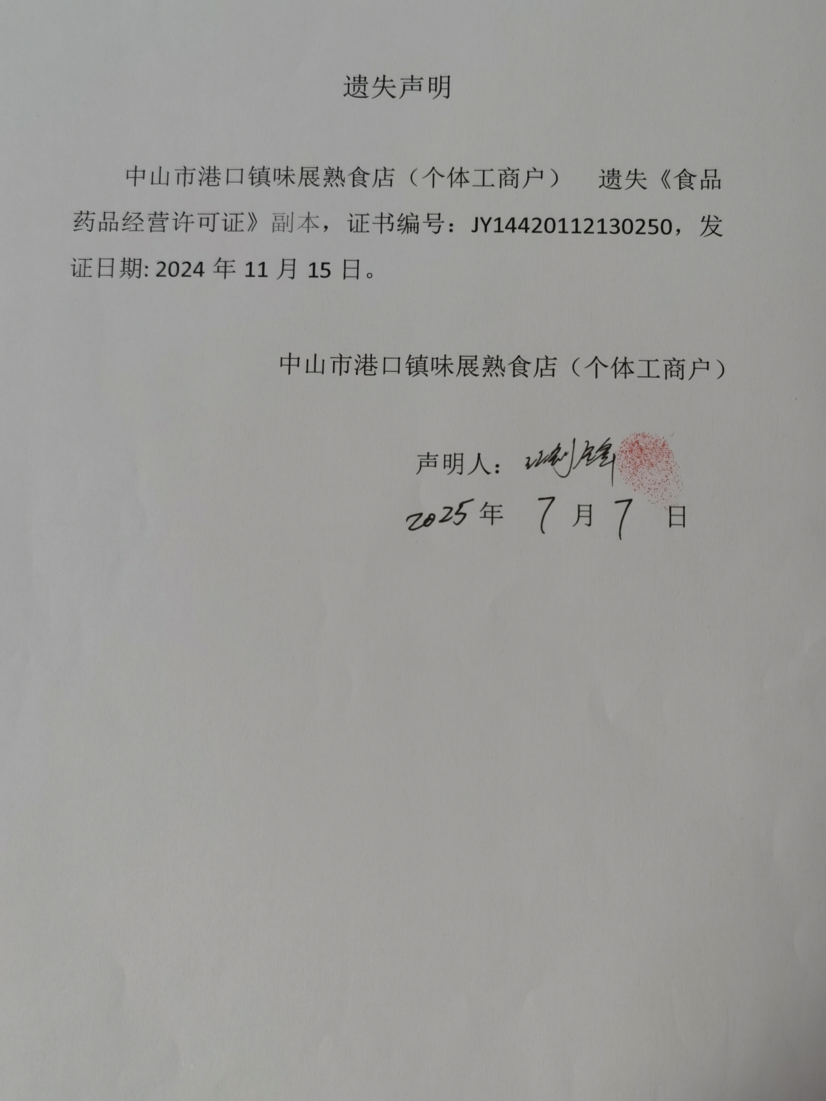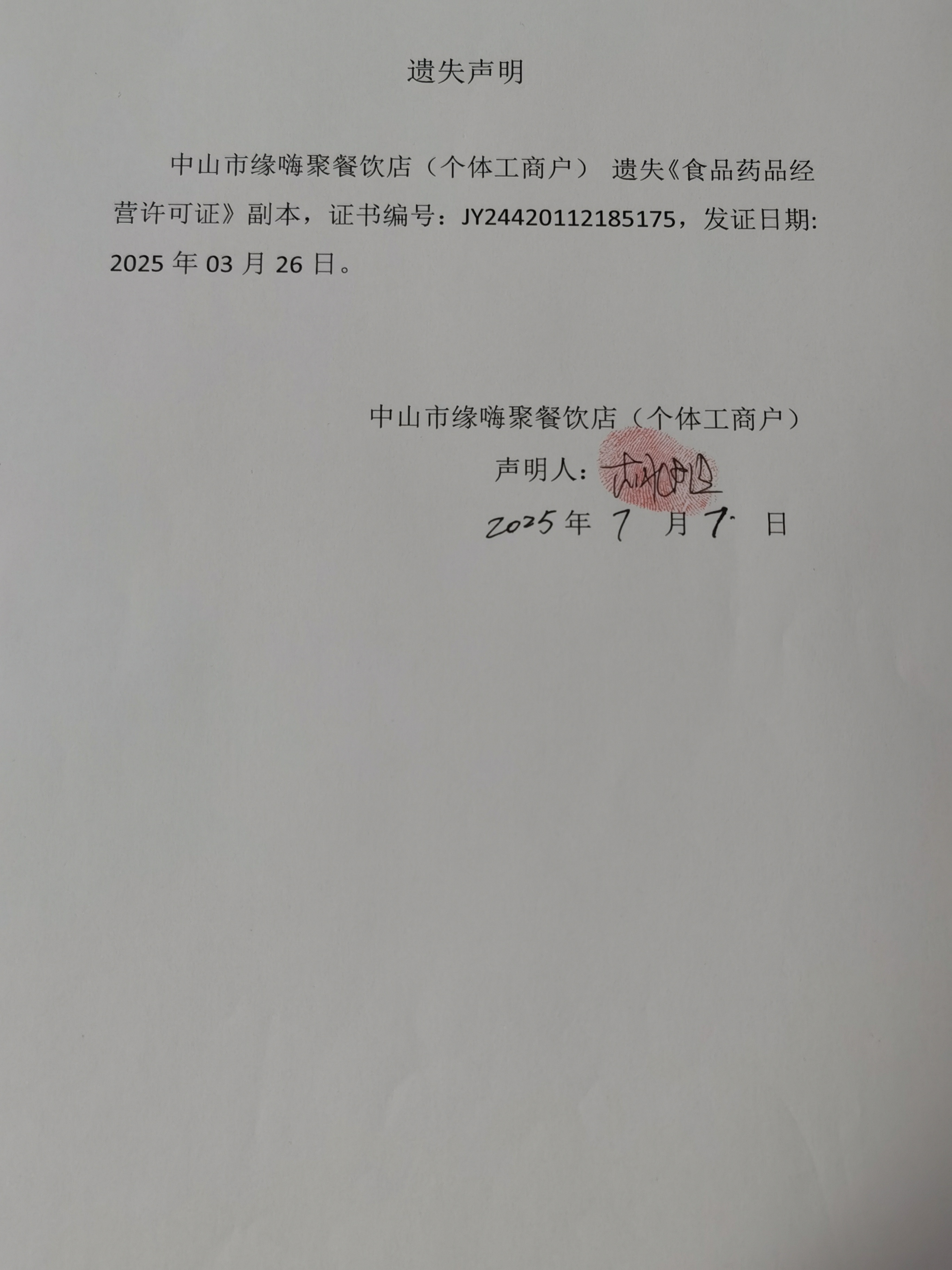 食品药品经营许可证遗失声明【中山市缘嗨聚餐饮店(个体工商户)、中山市港口镇味展熟食店(个体工商户)】