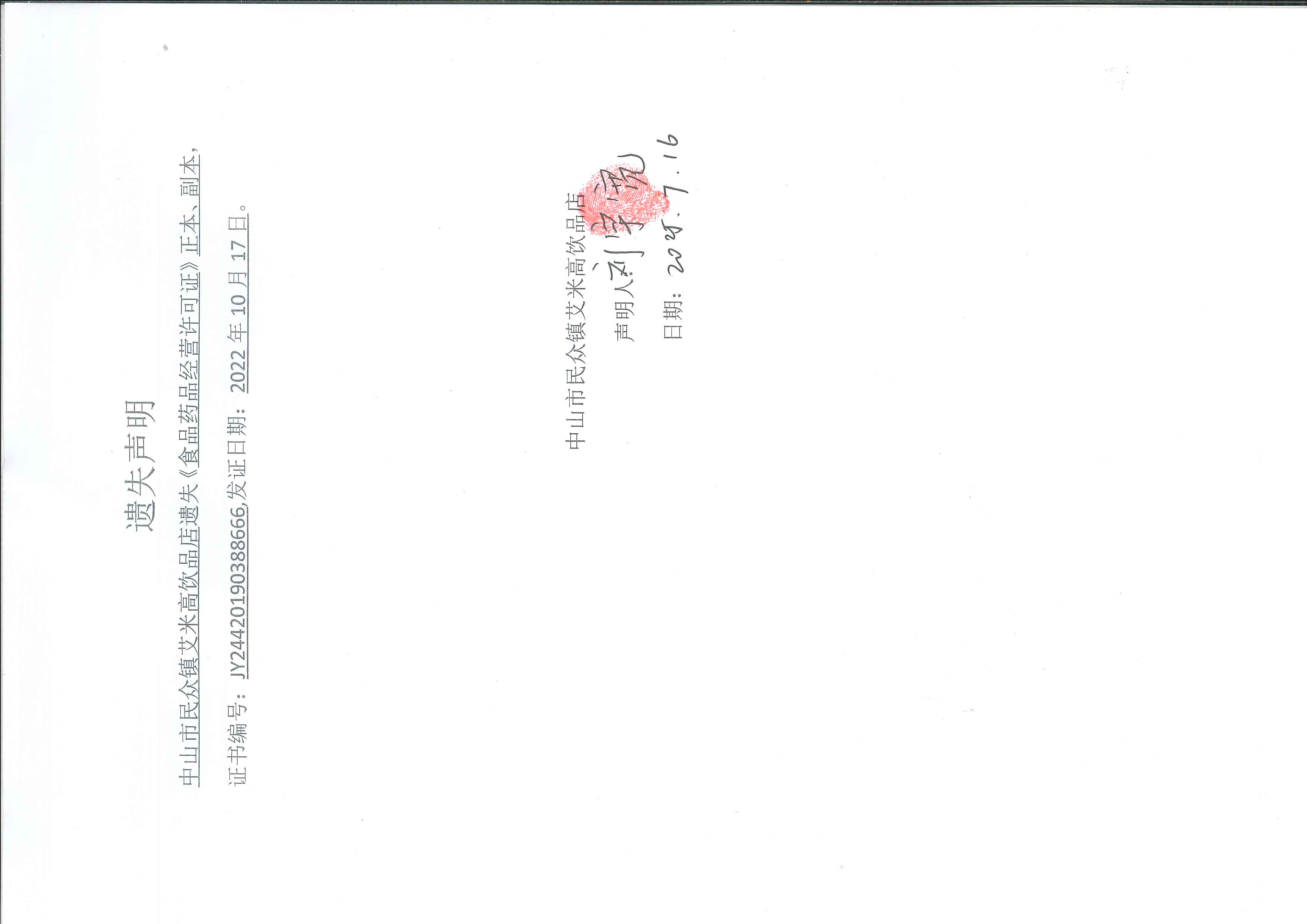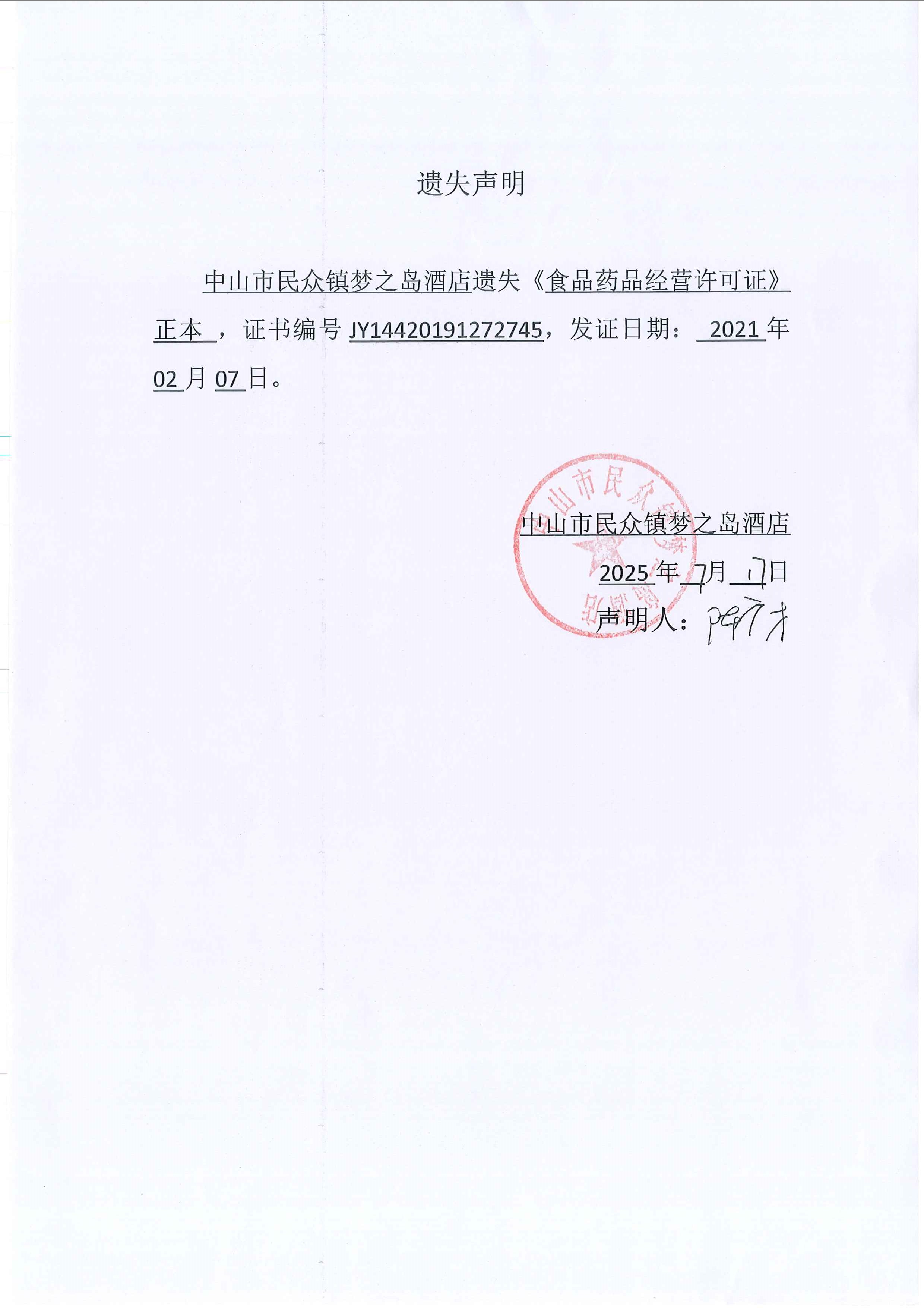 食品药品经营许可证遗失声明(中山市民众镇梦之岛酒店、中山市民众镇艾米高饮品店)