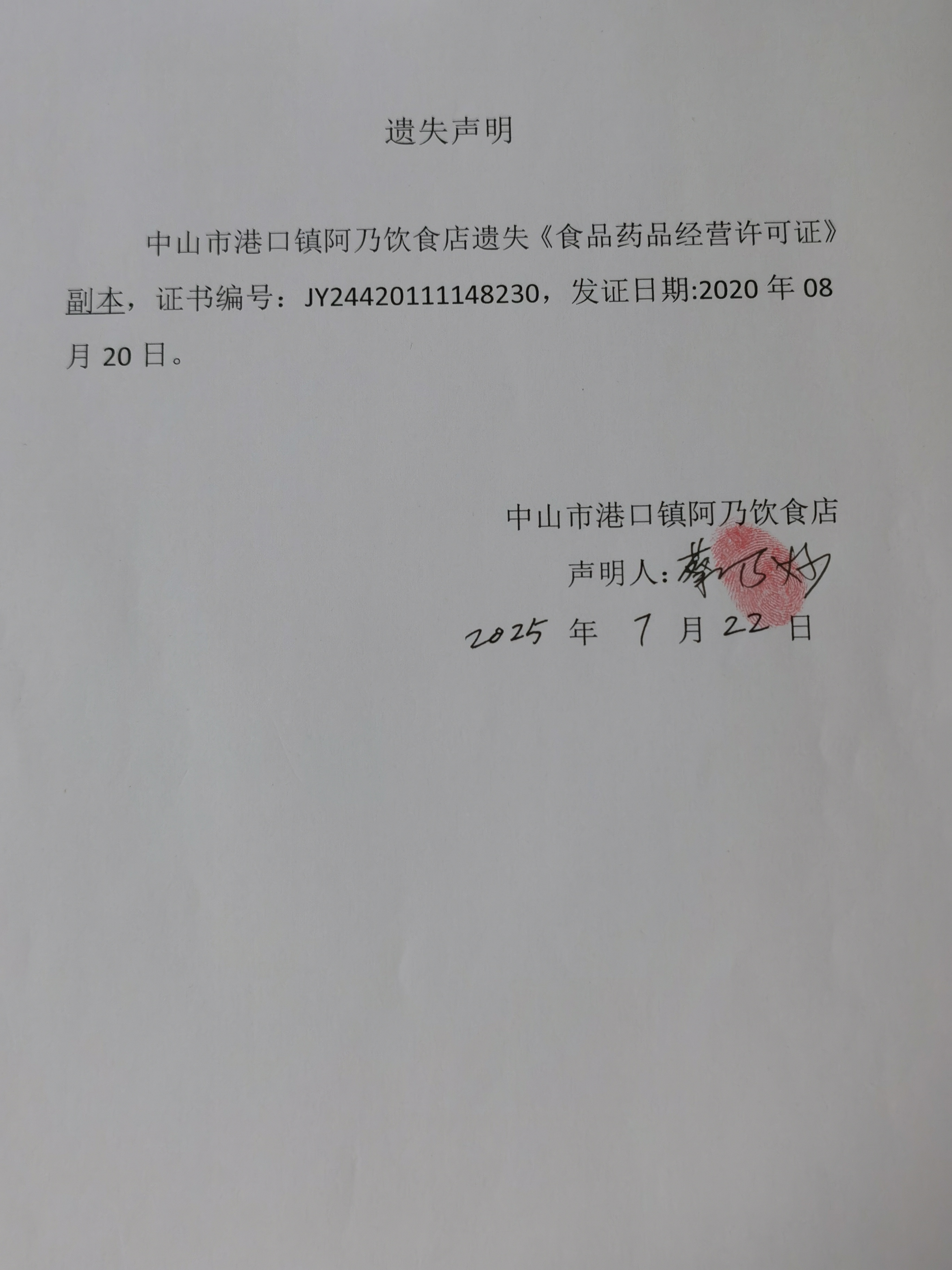 食品药品经营许可证遗失声明(中山市港口镇阿乃饮食店)