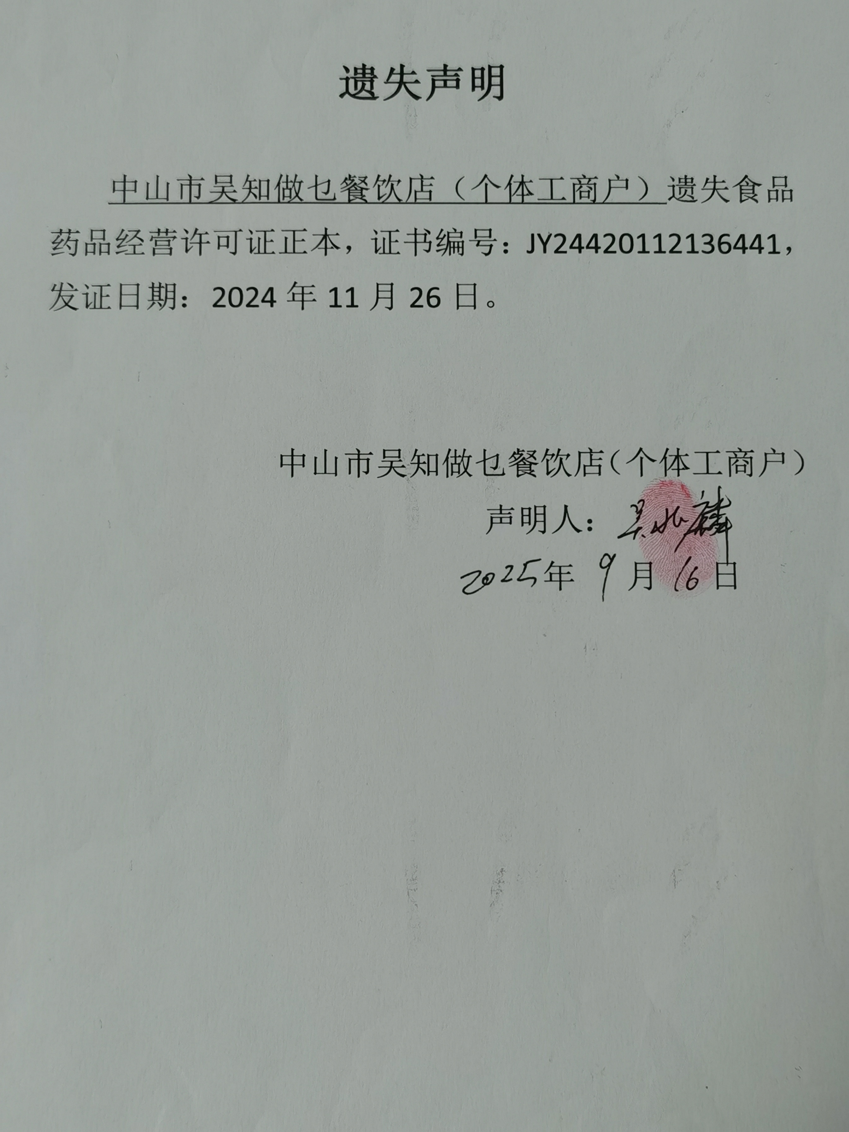 食品药品经营许可证遗失声明【中山市吴知做乜餐饮店(个体工商户)】.jpg
