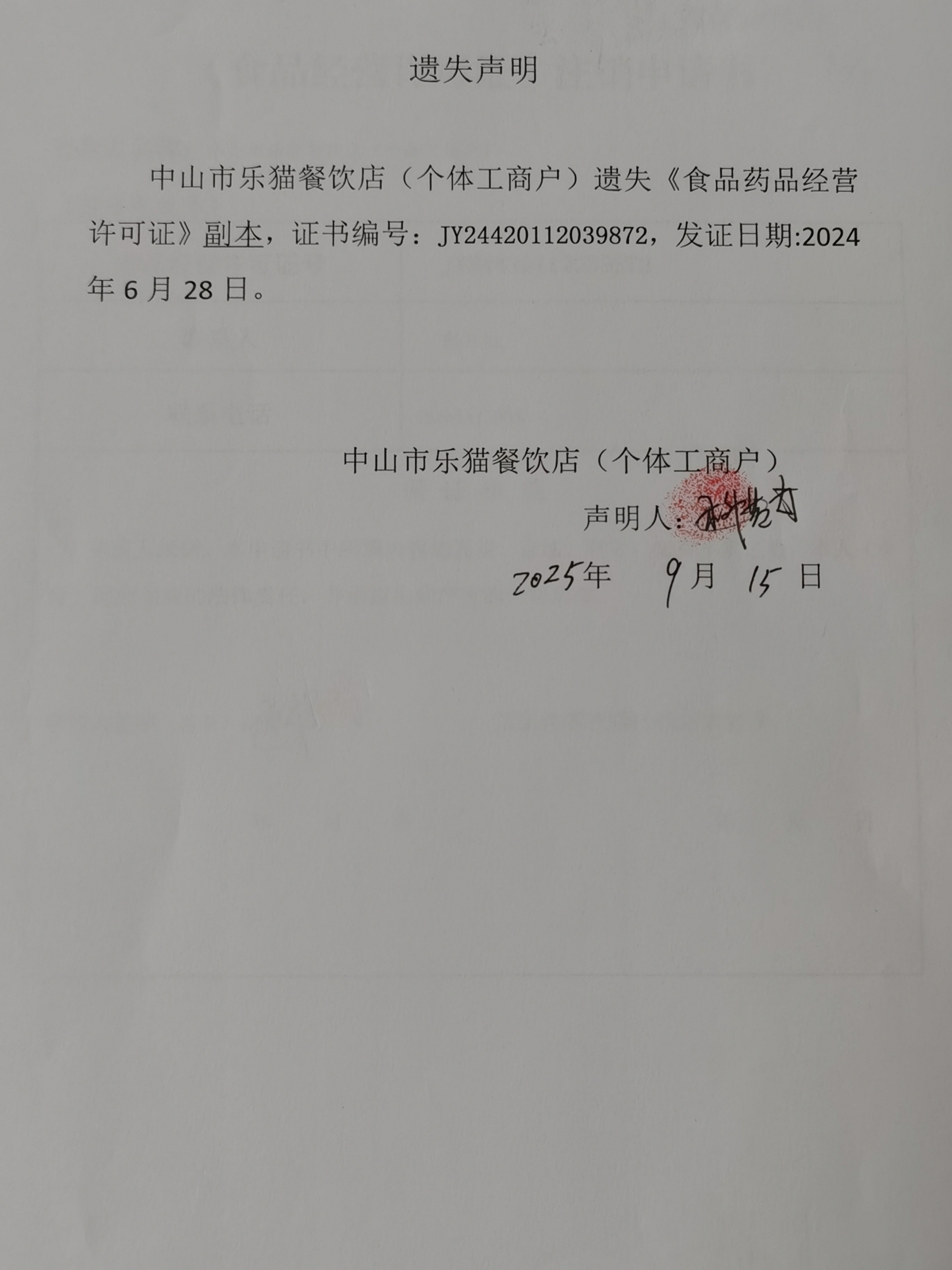 食品药品经营许可证遗失声明【中山市乐猫餐饮店(个体工商户)】.jpg