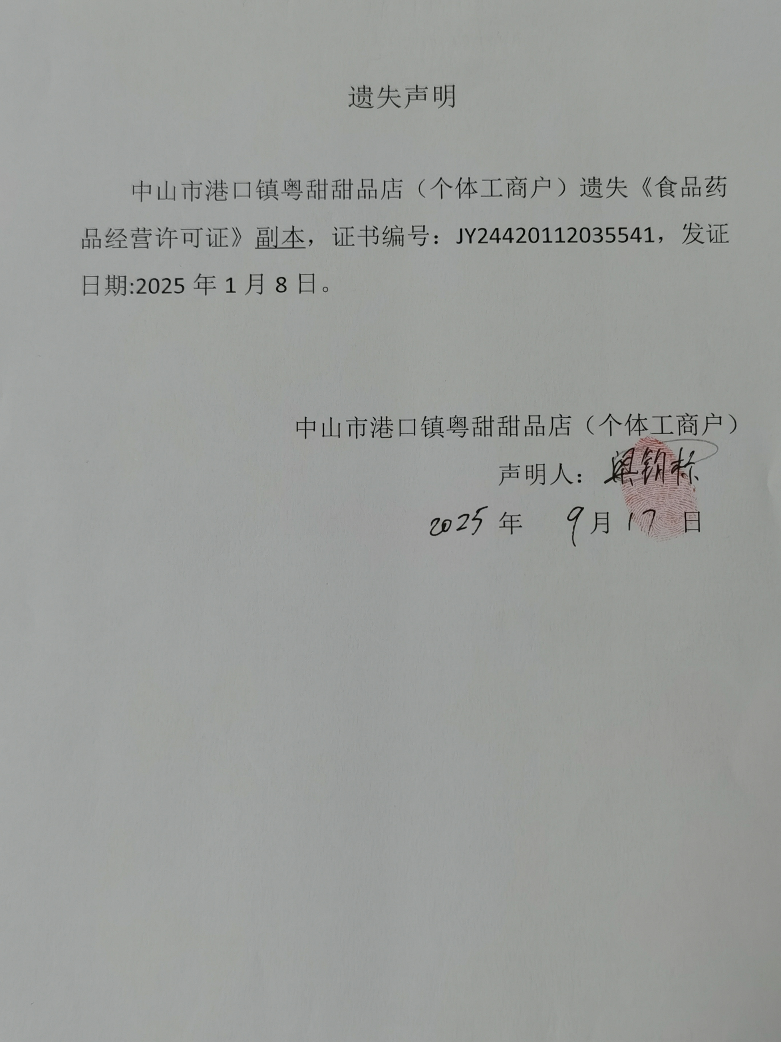 食品药品经营许可证遗失声明【中山市港口镇粤甜甜品店(个体工商户)】.jpg