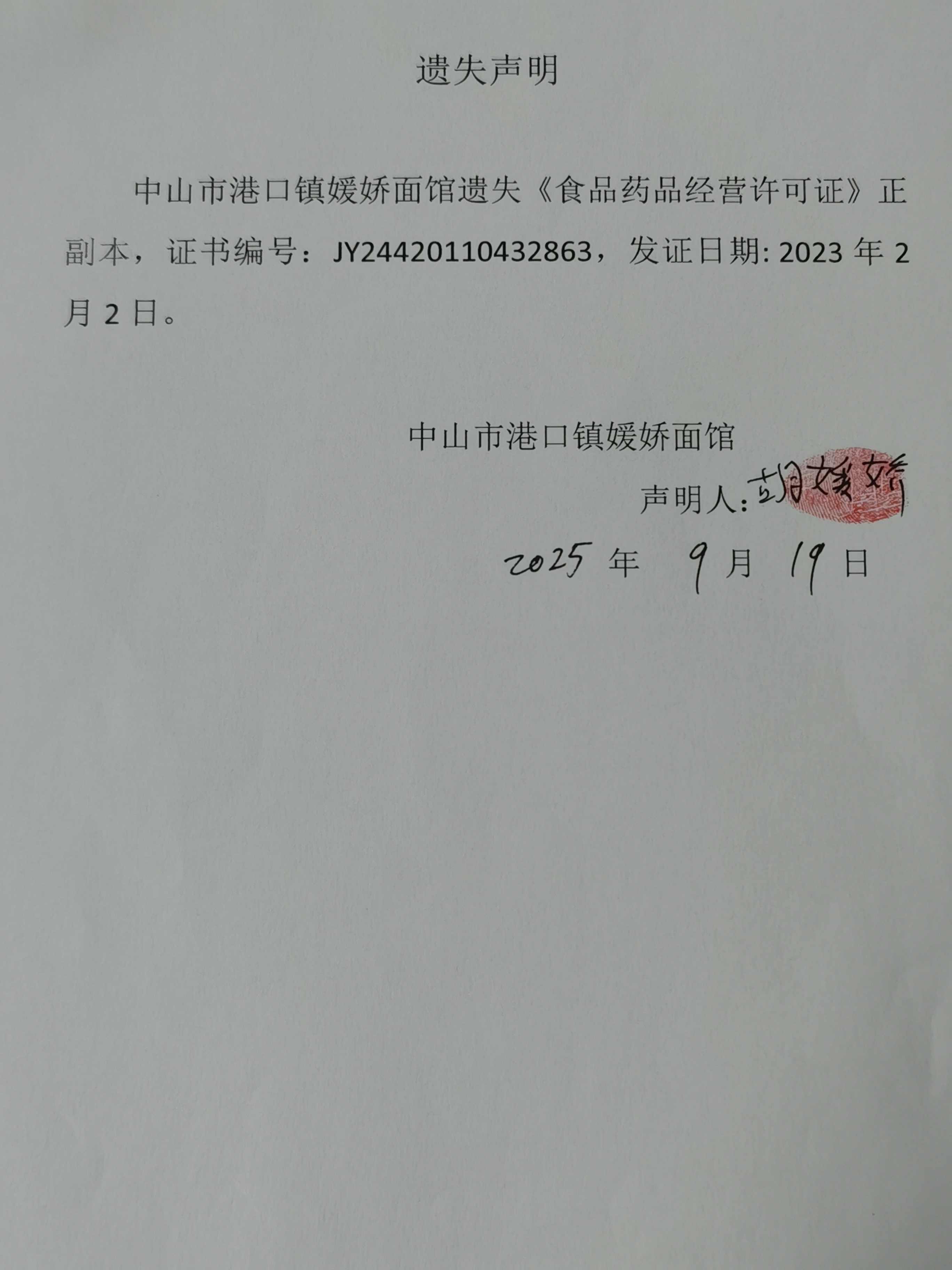 食品药品经营许可证遗失声明(中山市港口镇媛娇面馆).jpg