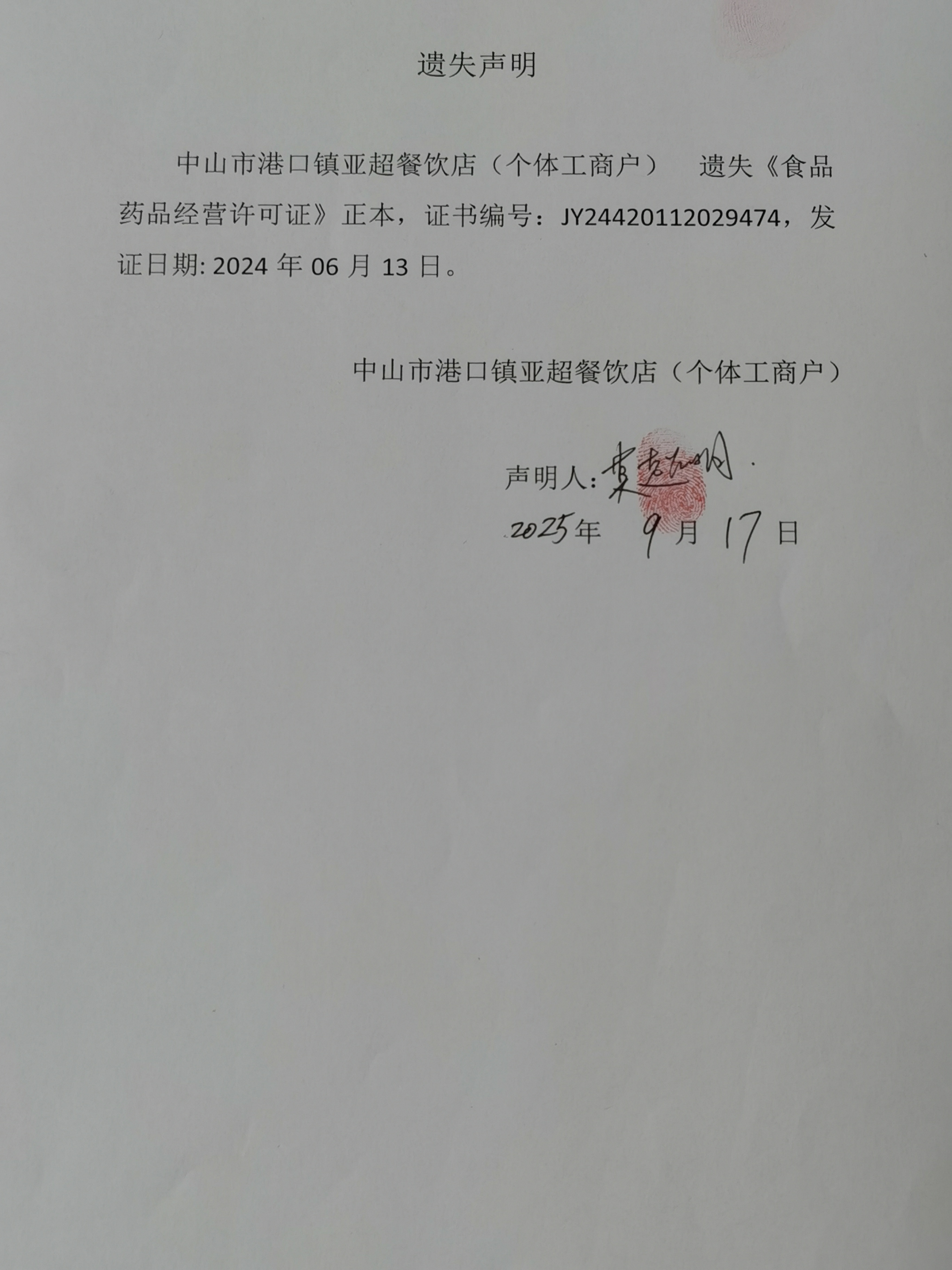食品药品经营许可证遗失声明【中山市港口镇亚超餐饮店(个体工商户)】.jpg