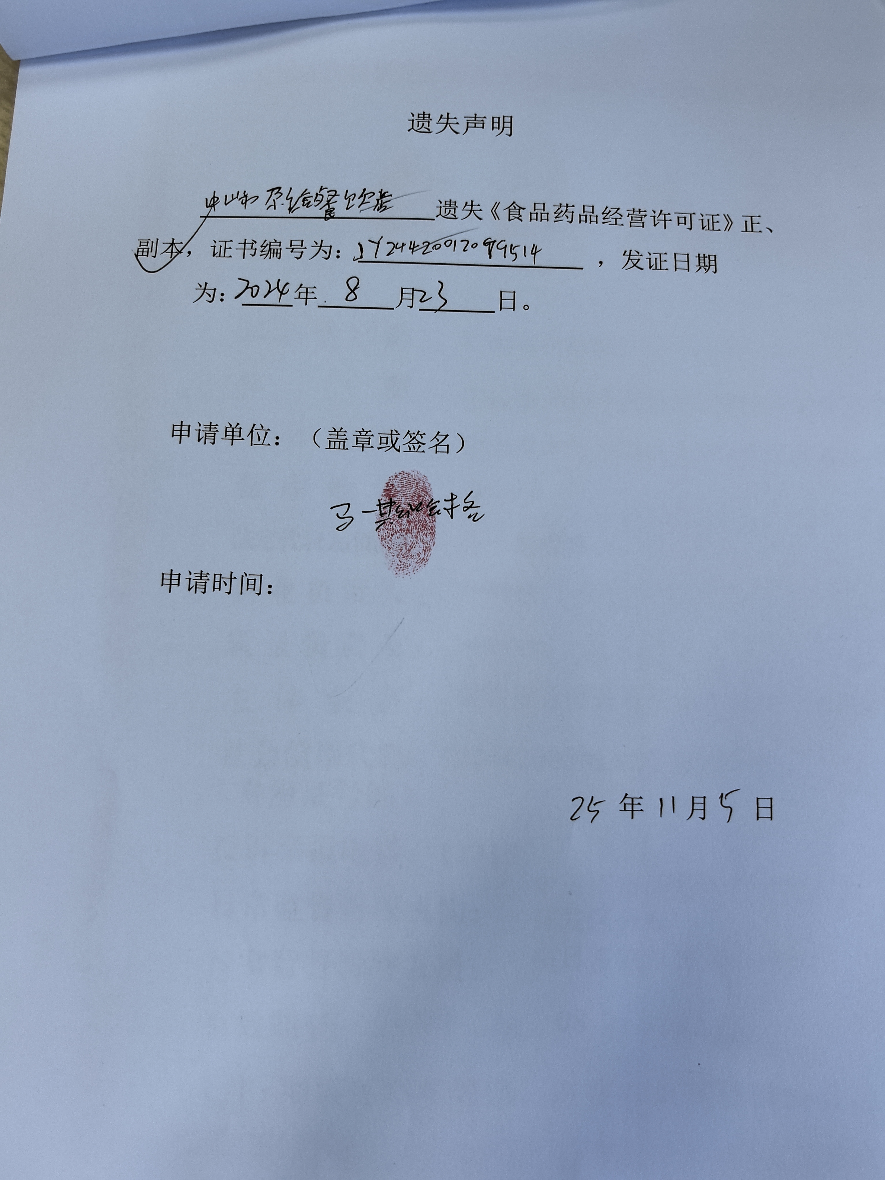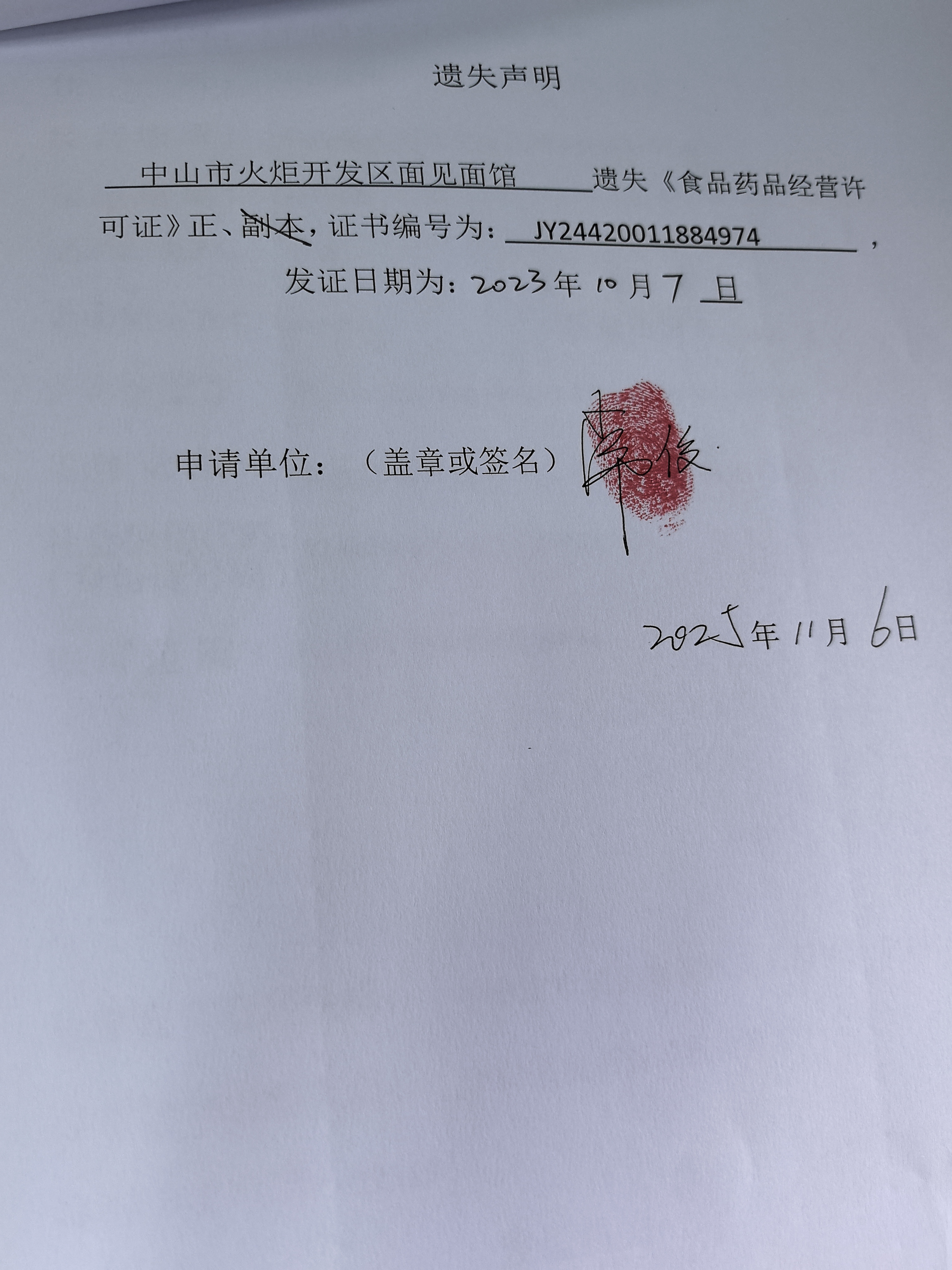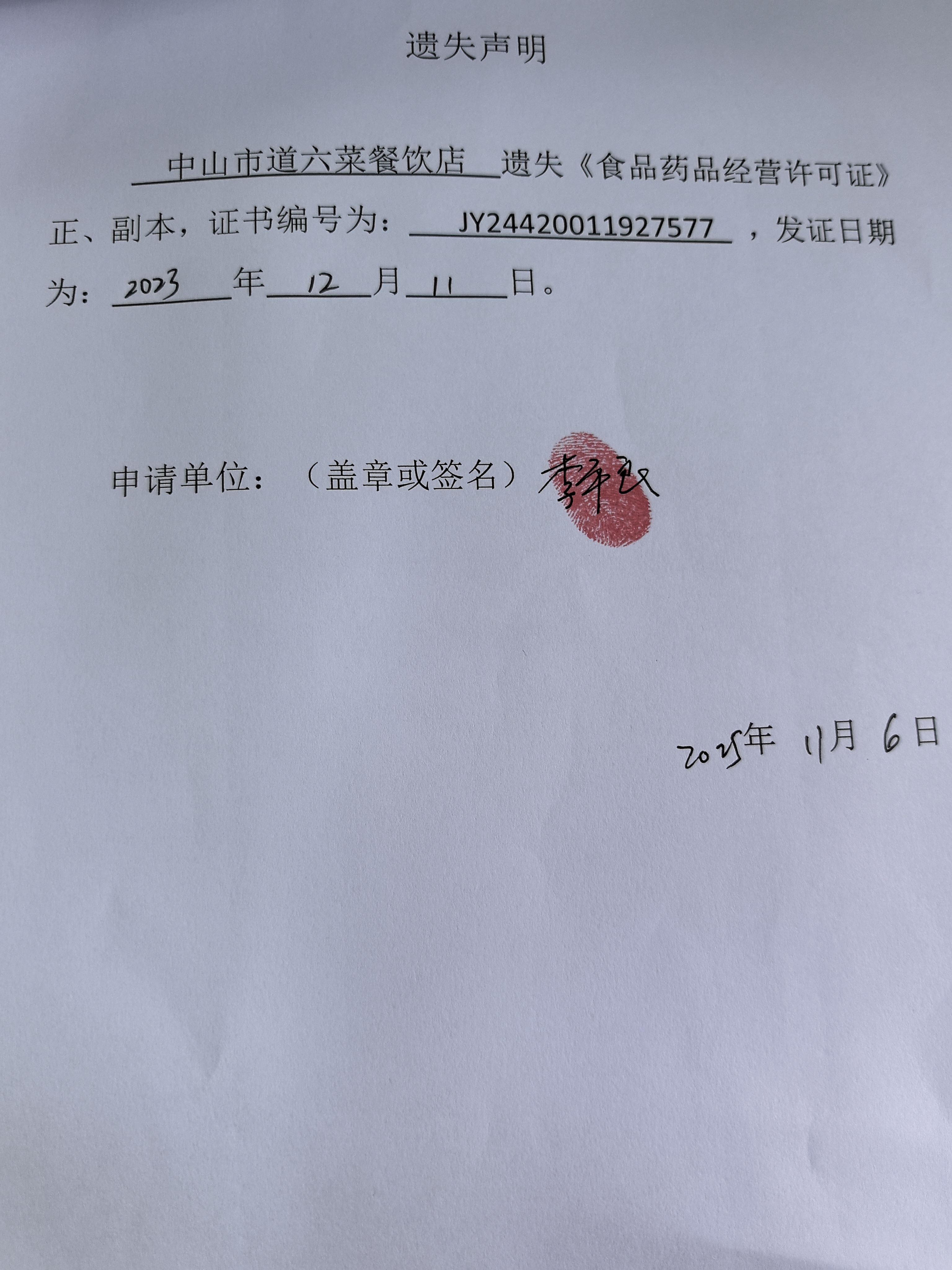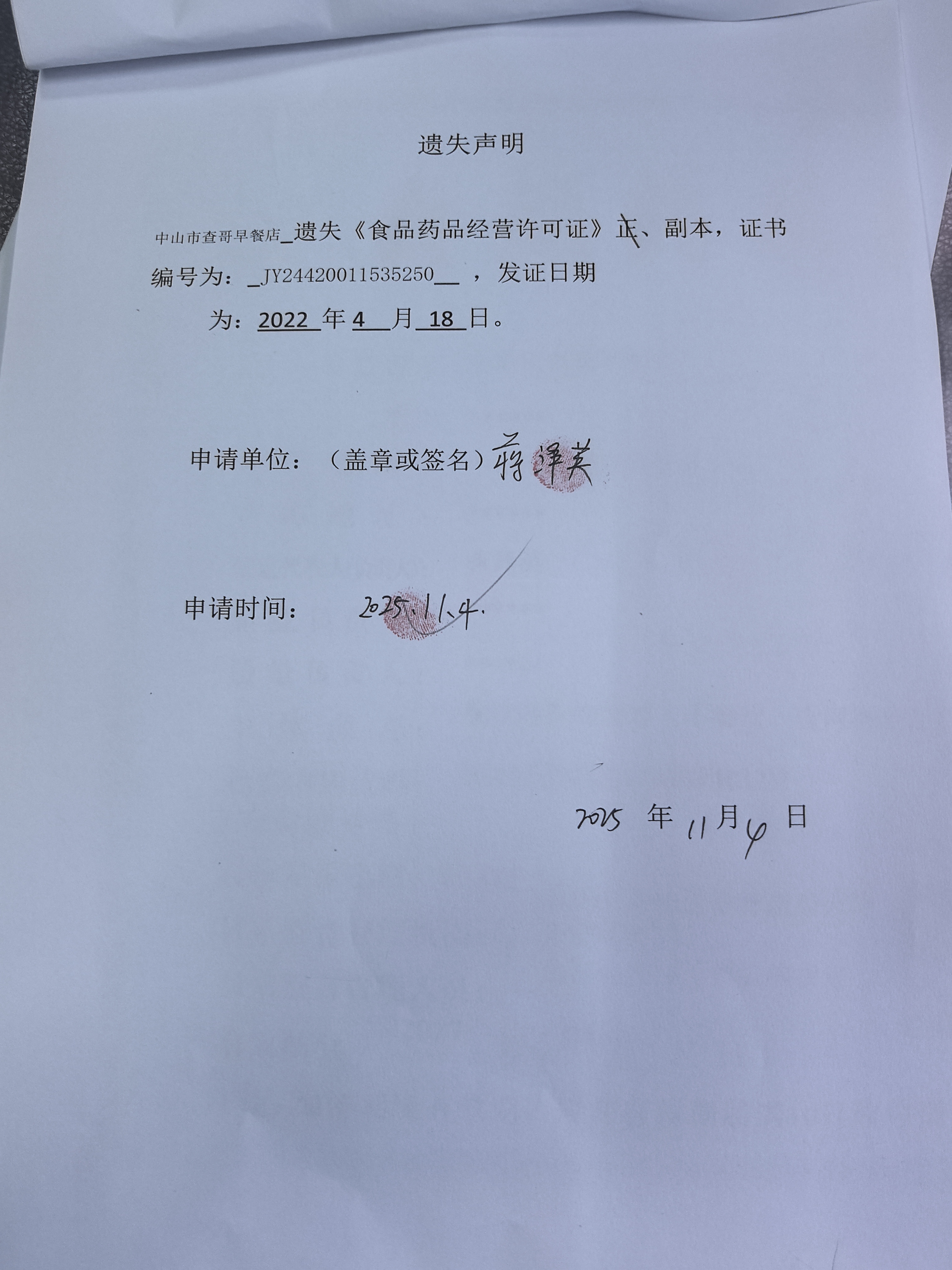食品药品经营许可证遗失声明〔中山市查哥早餐店、中山市道六菜餐饮店、中山市尕给餐饮店(个体工商户)、中山市火炬开发区面见面馆〕