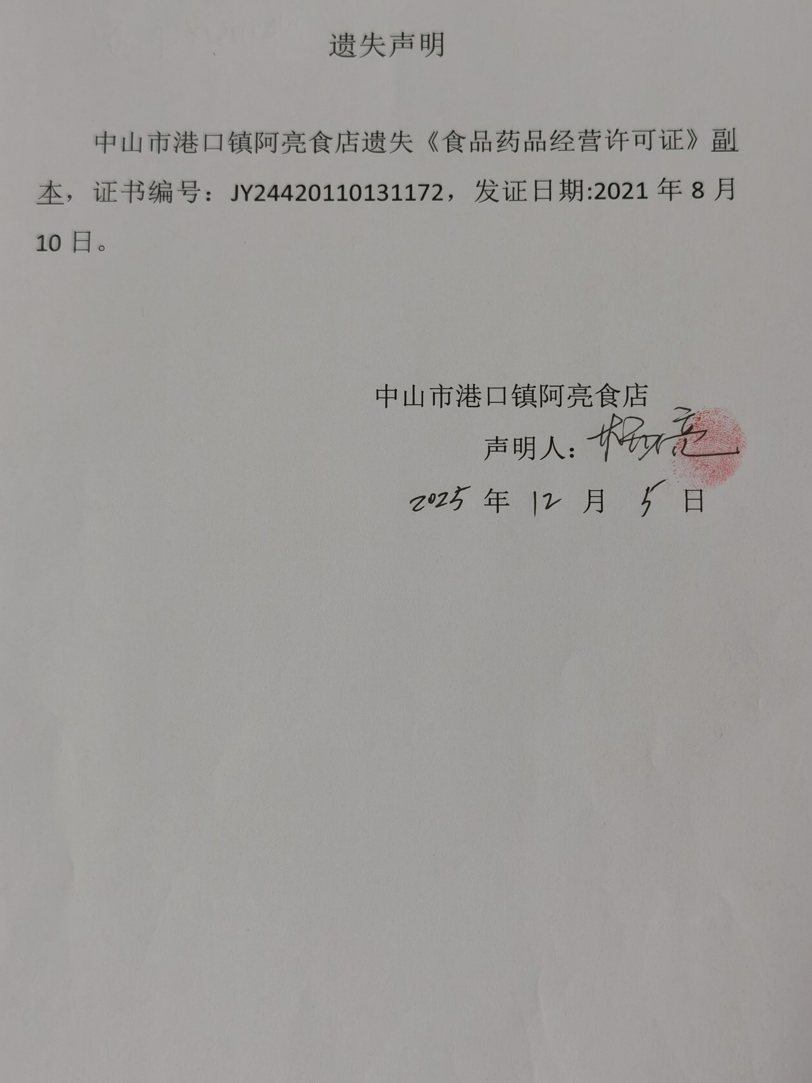 食品药品经营许可证遗失声明(中山市港口镇阿亮食店).jpg