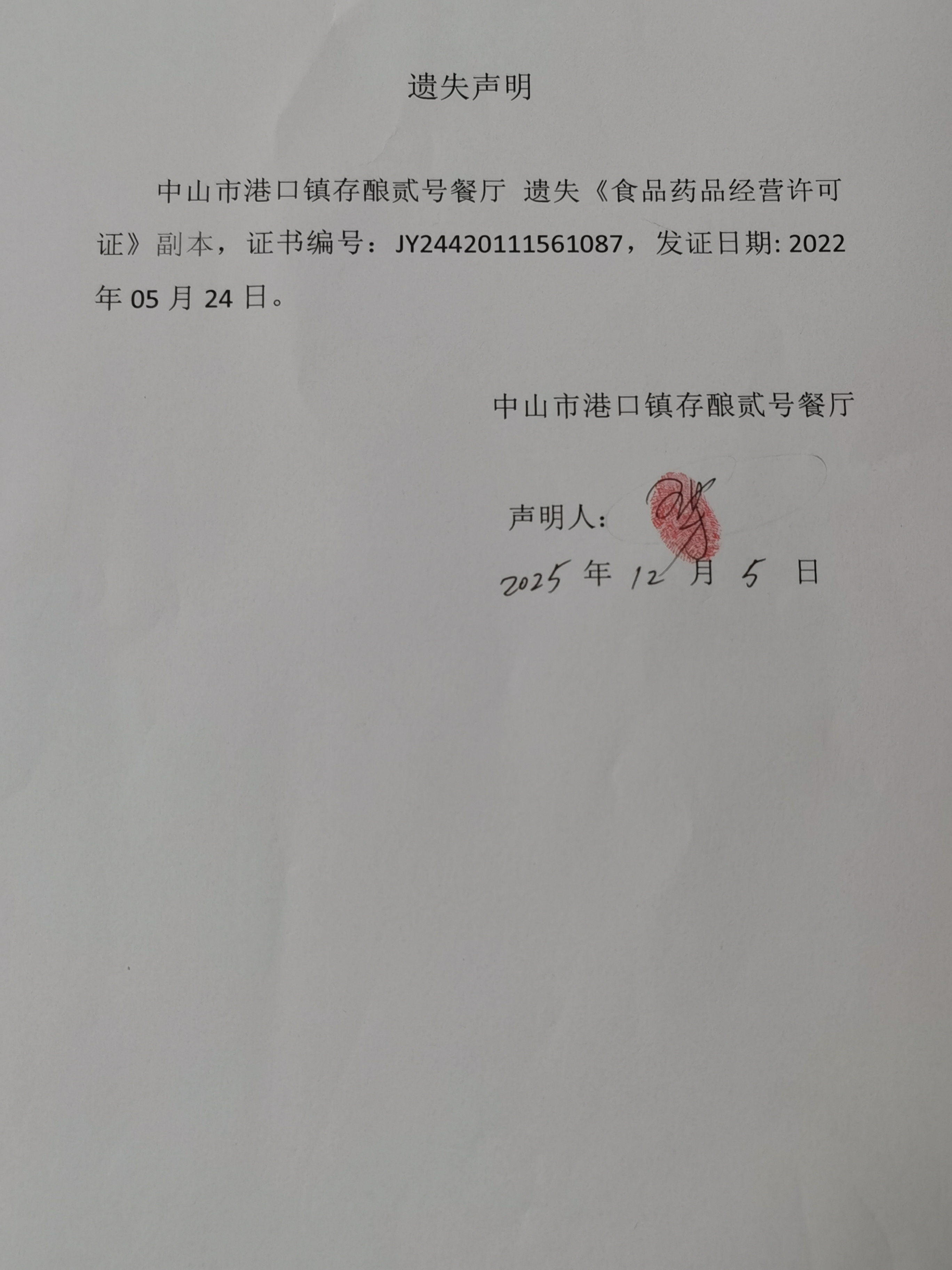 食品药品经营许可证遗失声明(中山市港口镇存酿贰号餐厅).jpg