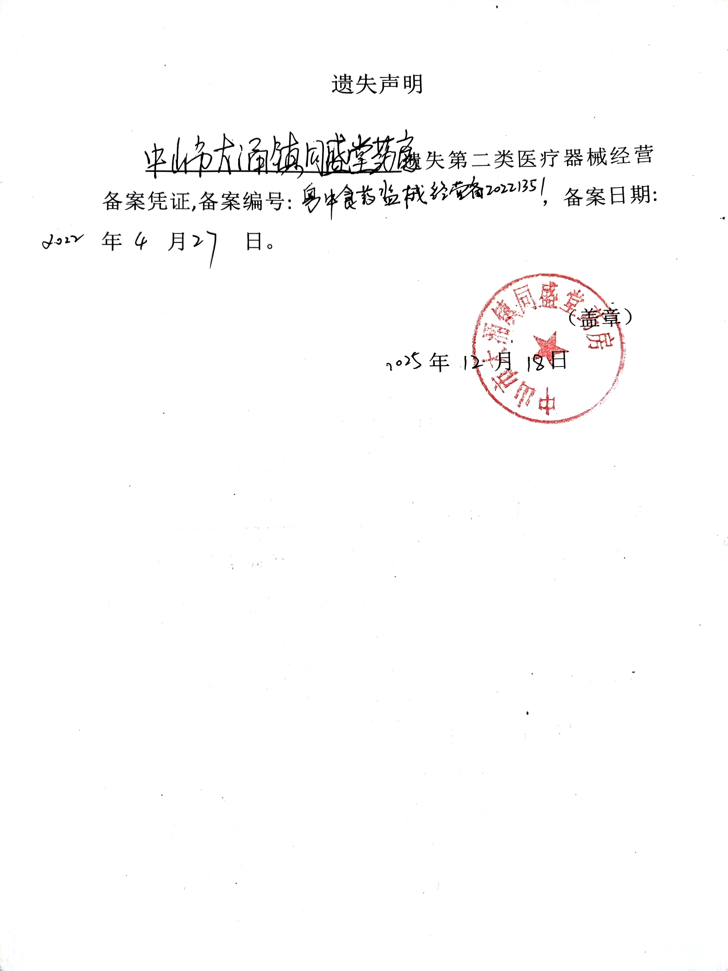 第二类医疗器械经营备案凭证遗失声明(中山市大涌镇同盛堂药房)