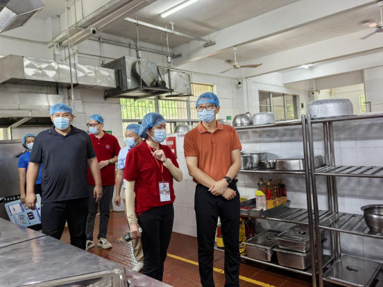 ▲南区街道办事处副主任薛焯明检查中山市永安中学、中山市华伟技工学校食堂并自费陪餐。